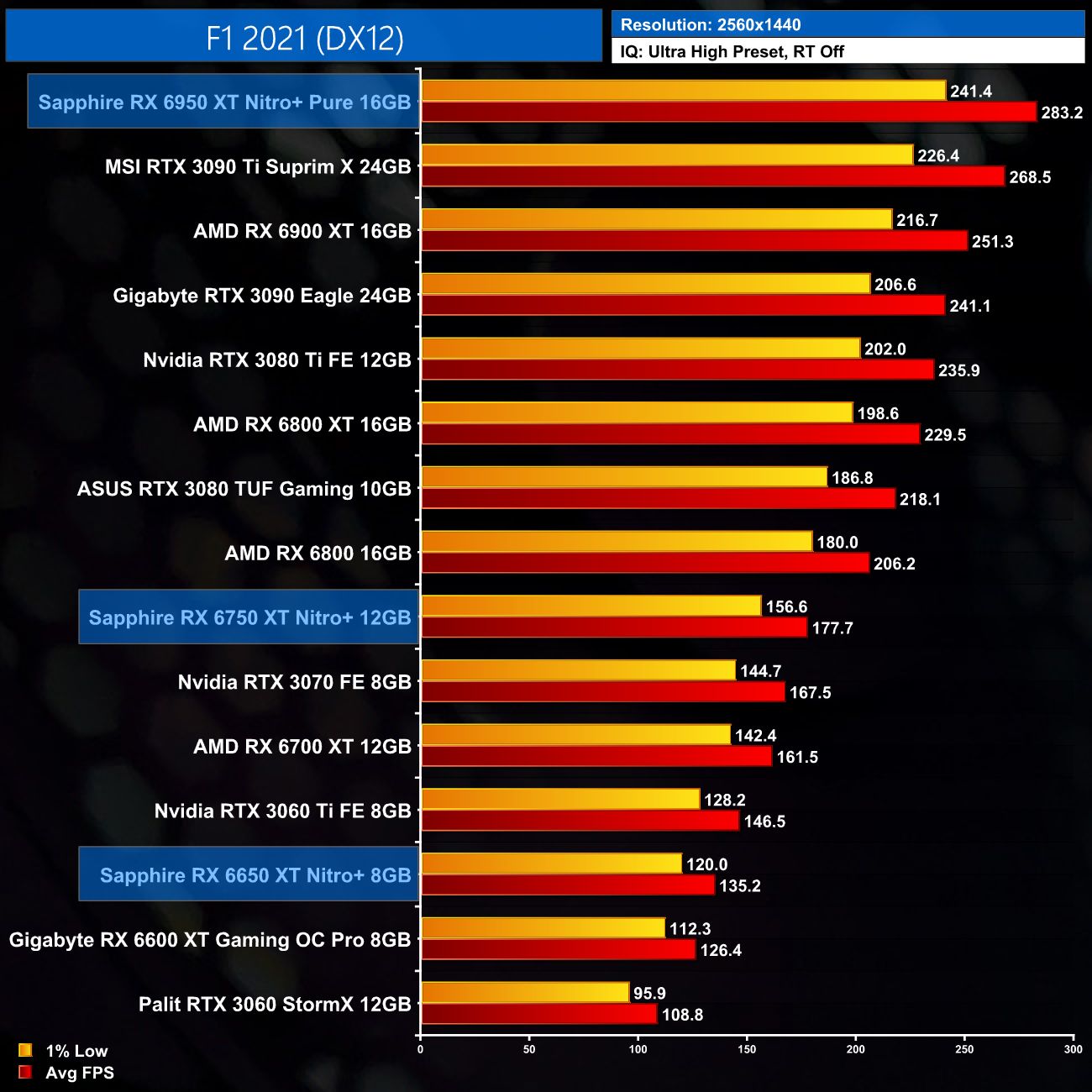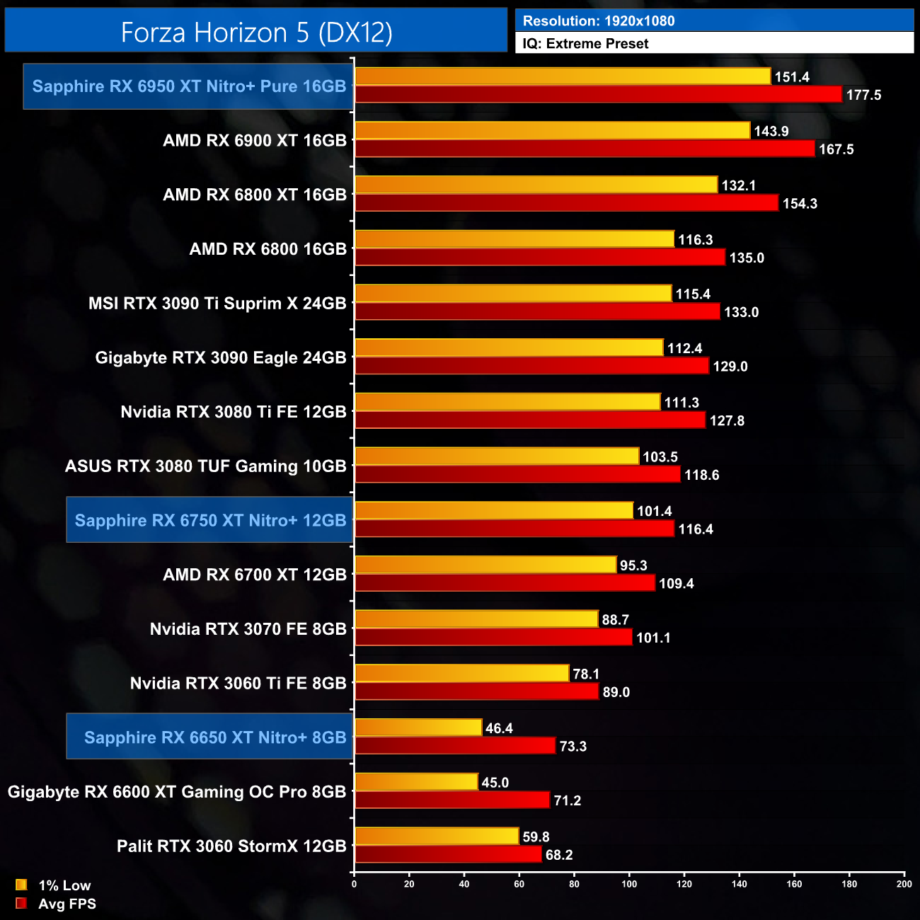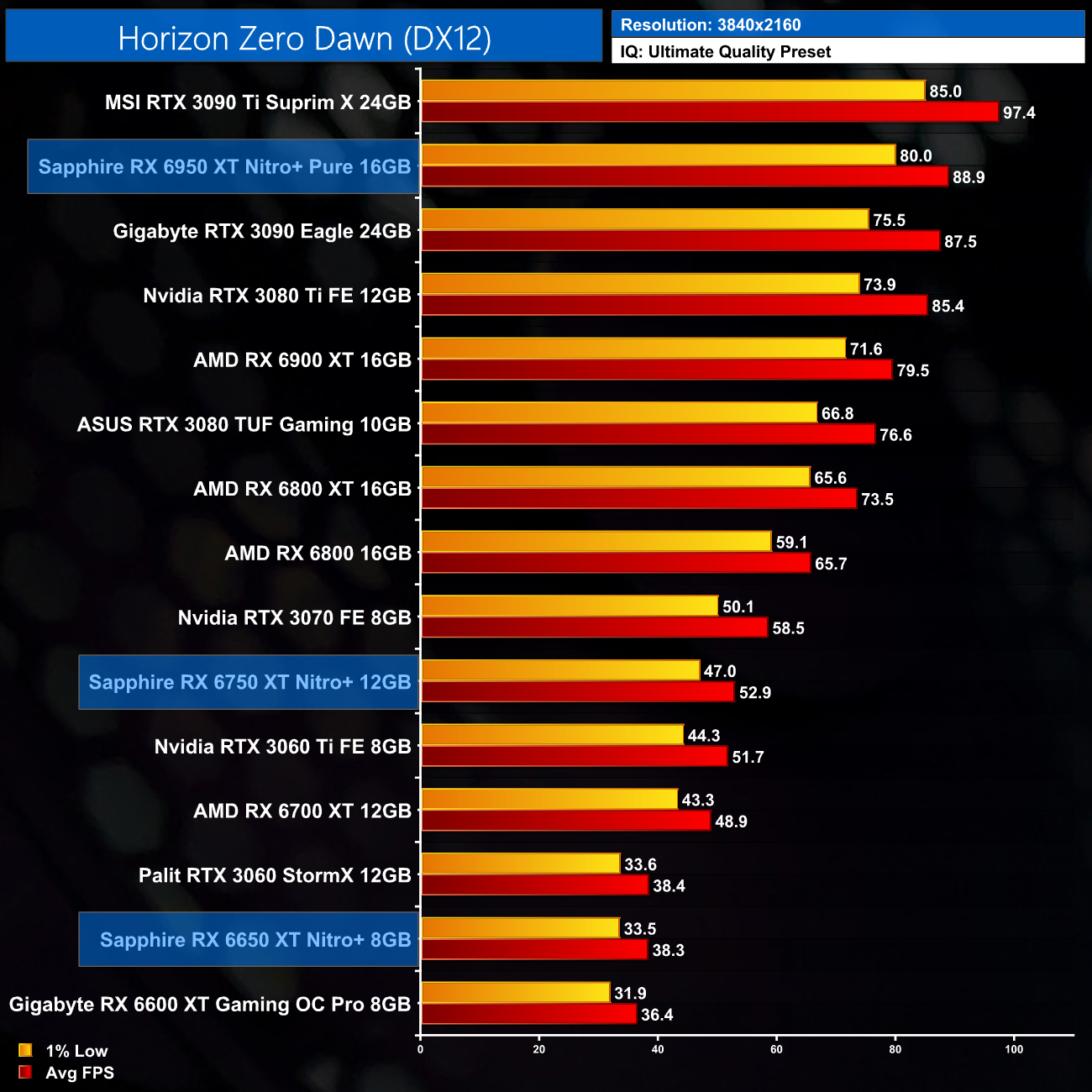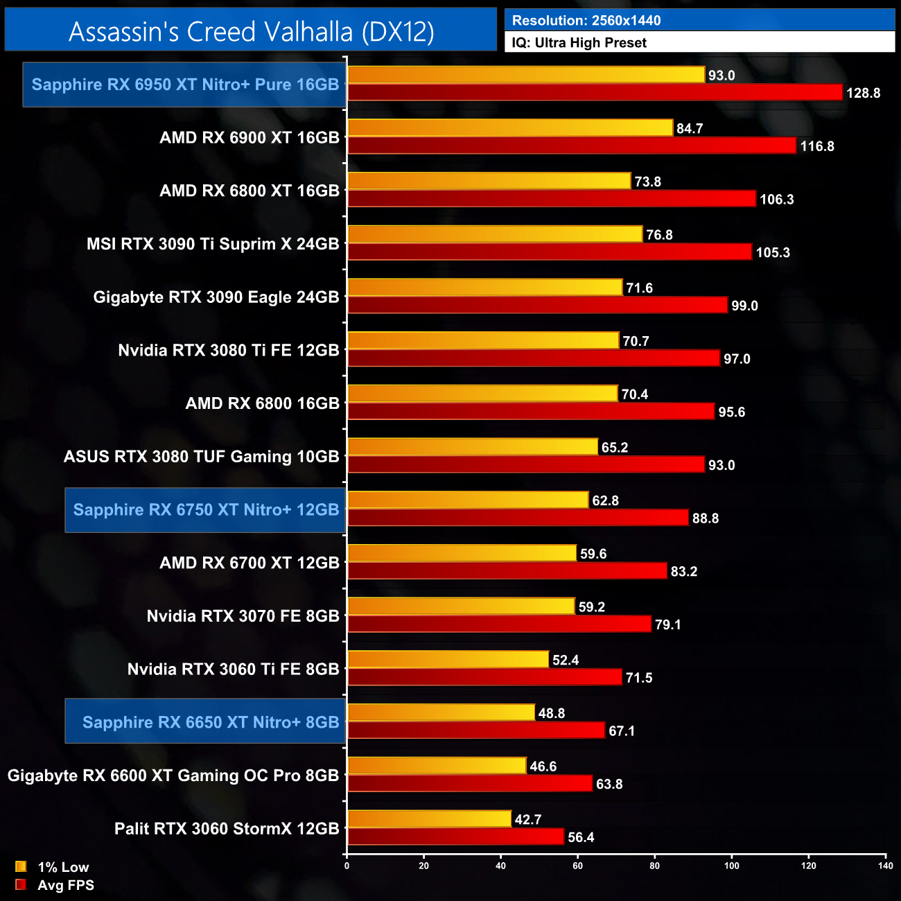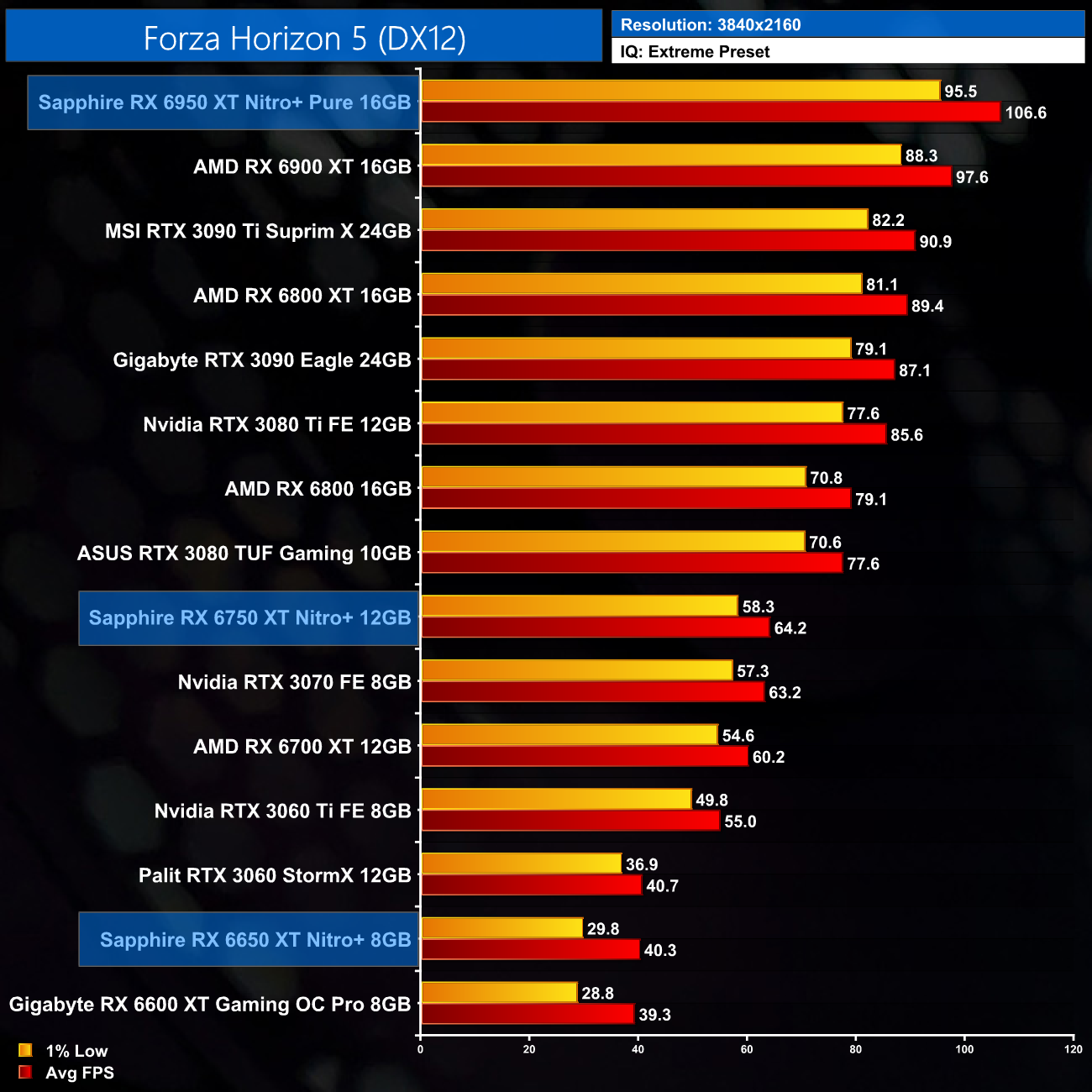 Just to re-iterate as well, these numbers don't take into account the fact that we tested three heavily factory overclocked models from the the Sapphire Nitro+ series, while our comparison cards were all tested at reference clocks. That means, if we were testing reference models against reference models, I would expect smaller margins than what is shown here – the Nitro+ Pure RX 6950 XT has an 11% factory overclock for instance, which would definitely boost performance by a decent chunk compared to a reference card.