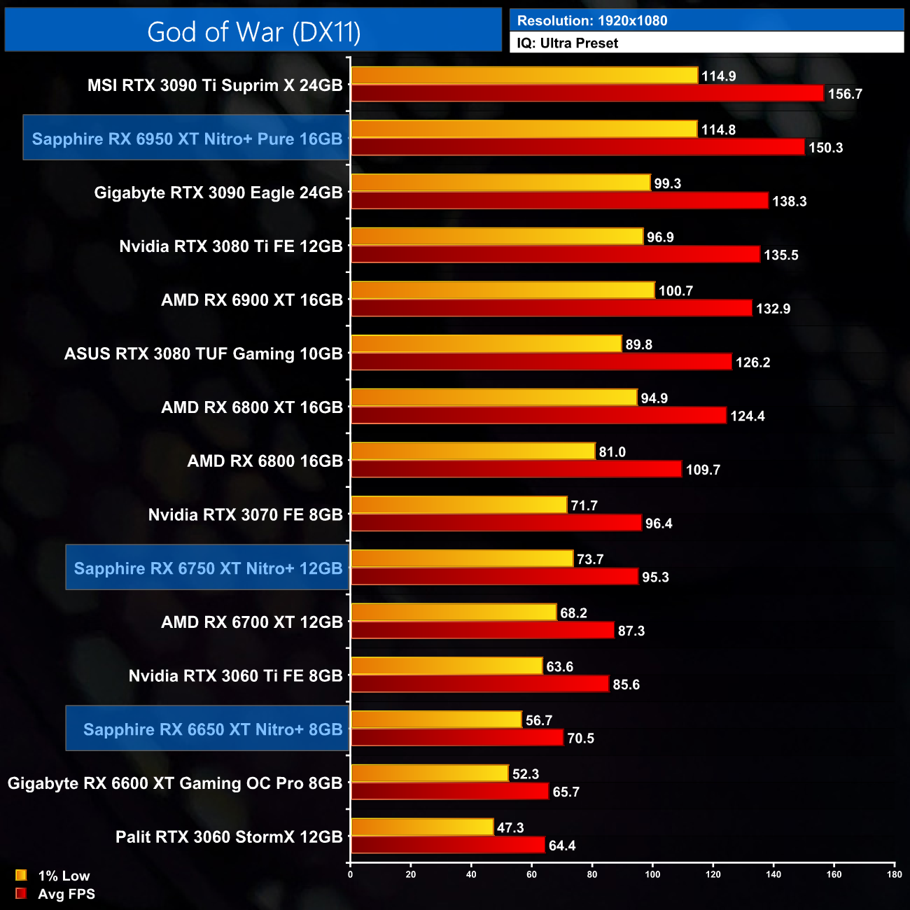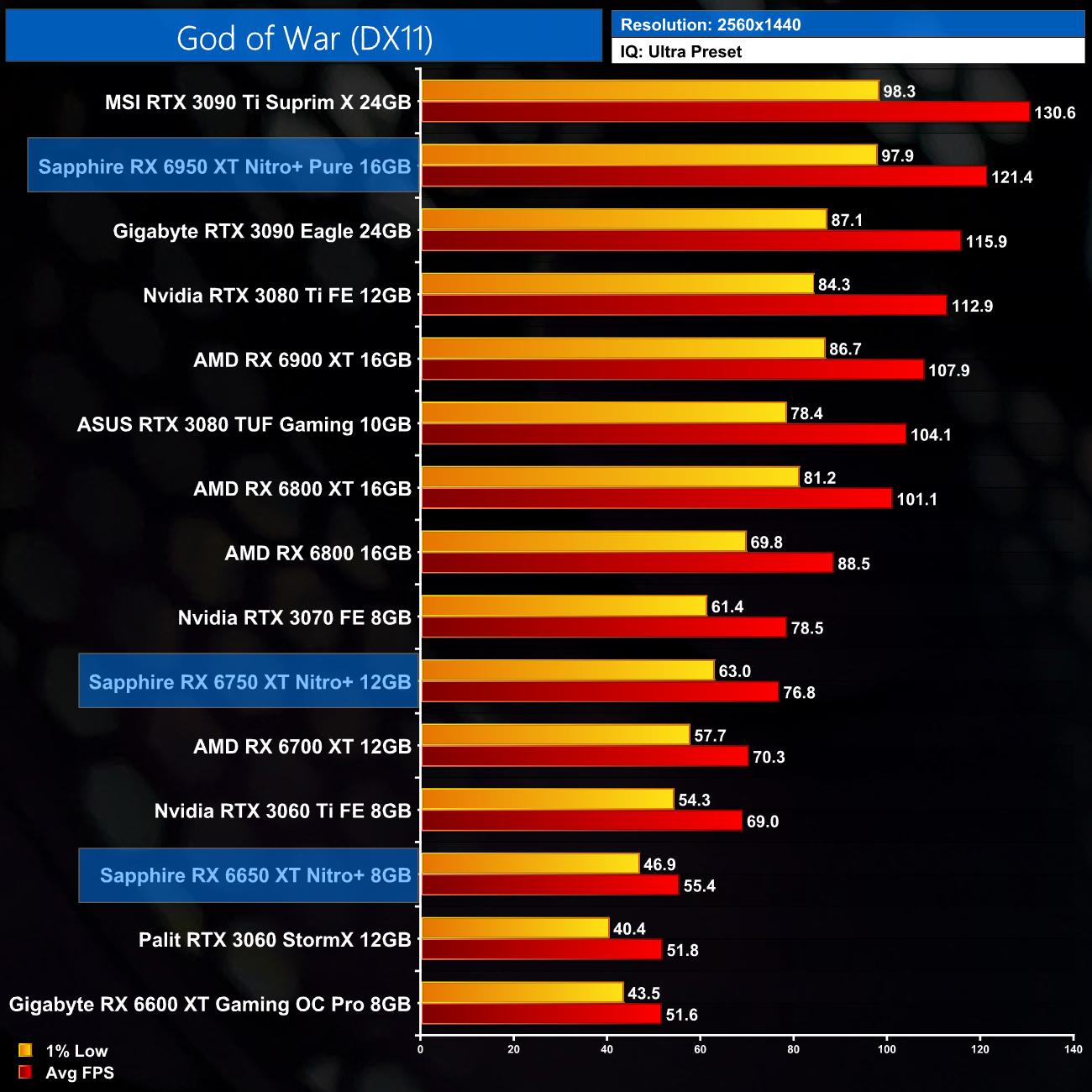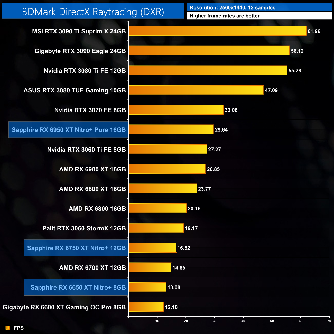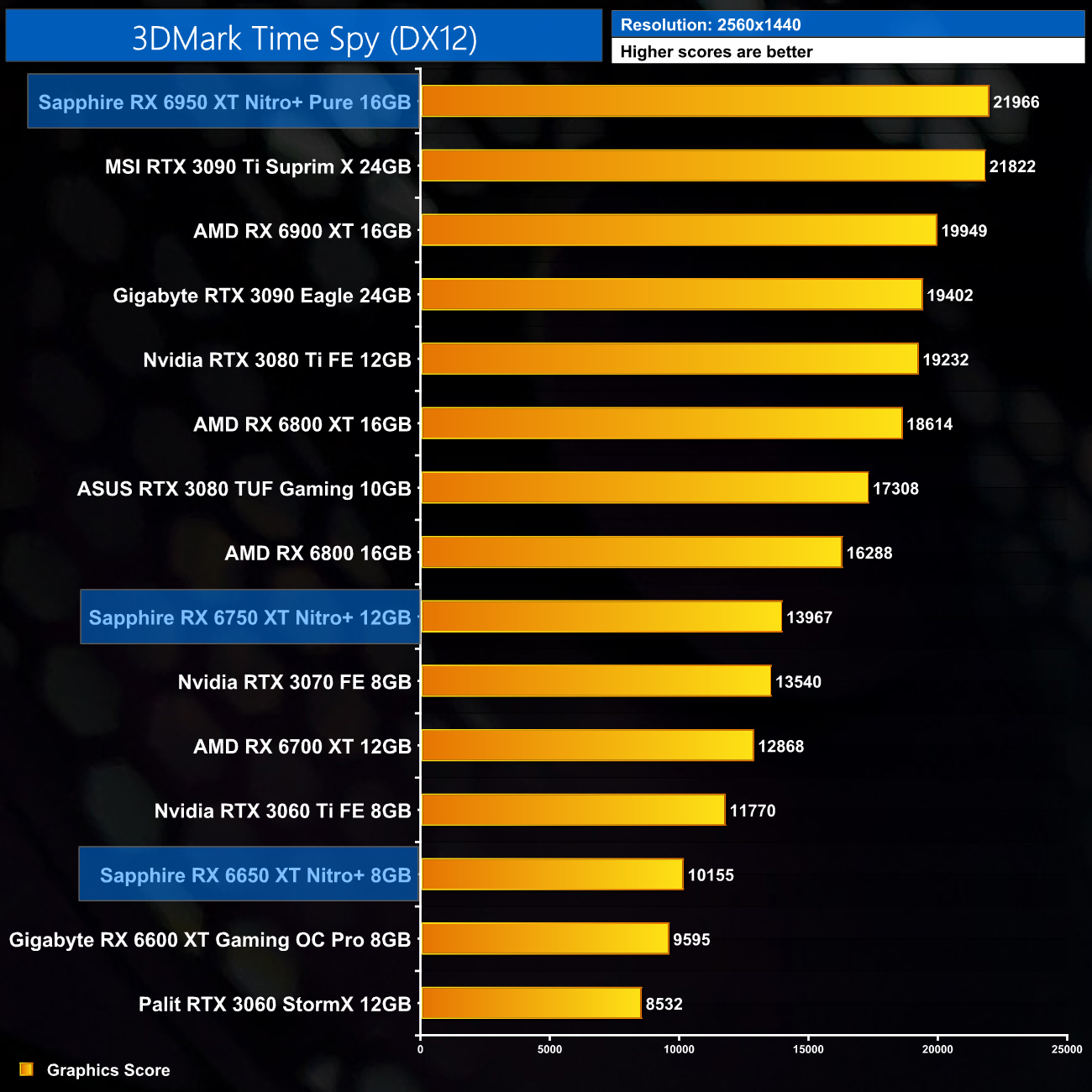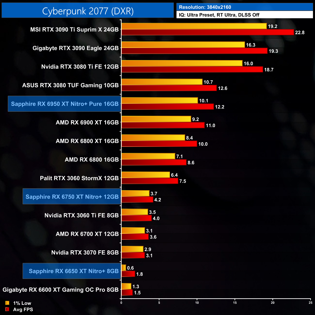 Just to re-iterate as well, these numbers don't take into account the fact that we tested three heavily factory overclocked models from the the Sapphire Nitro+ series, while our comparison cards were all tested at reference clocks. That means, if we were testing reference models against reference models, I would expect smaller margins than what is shown here – the Nitro+ Pure RX 6950 XT has an 11% factory overclock for instance, which would definitely boost performance by a decent chunk compared to a reference card.