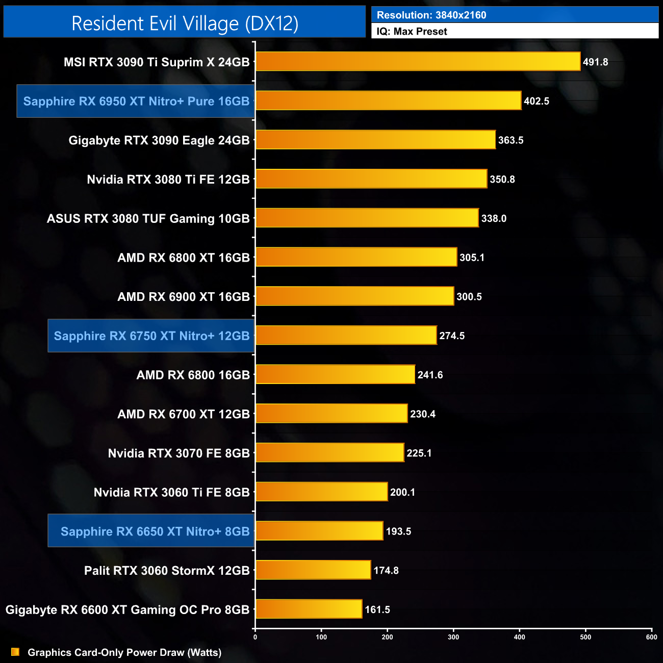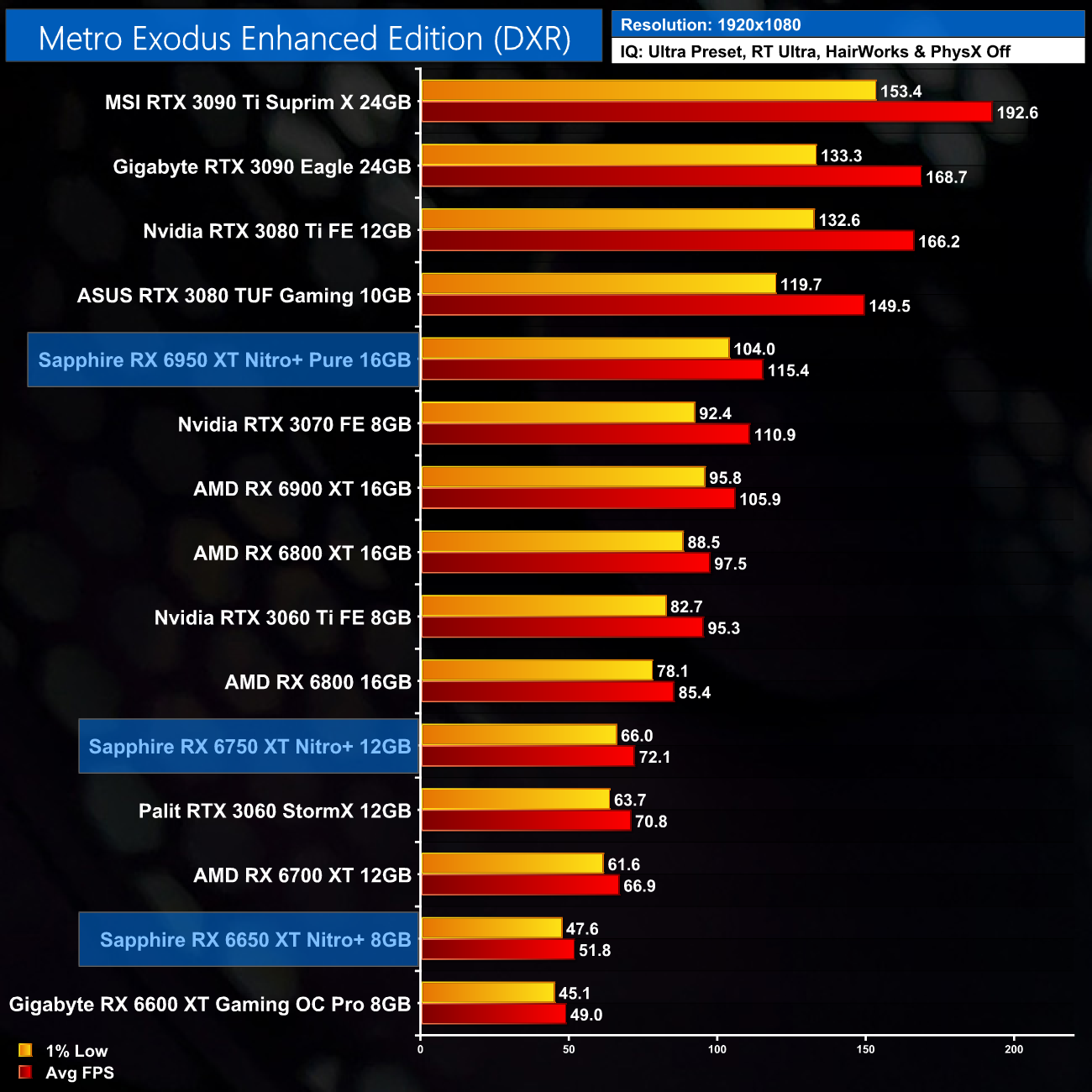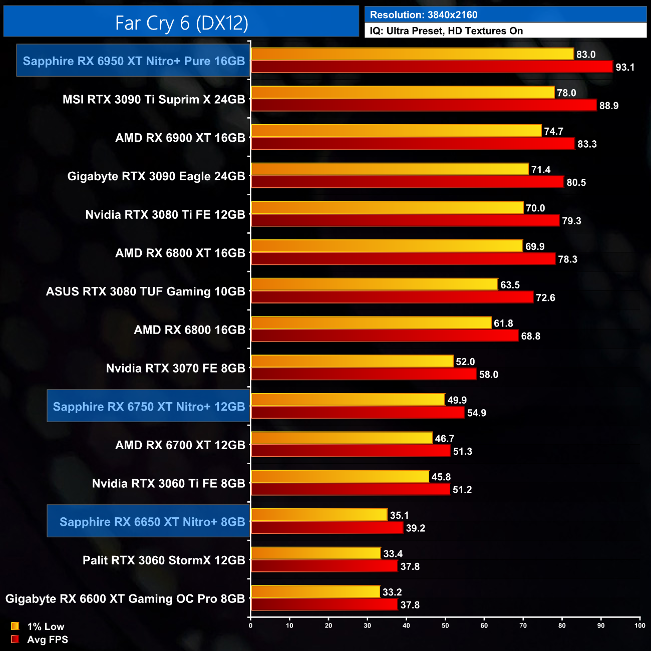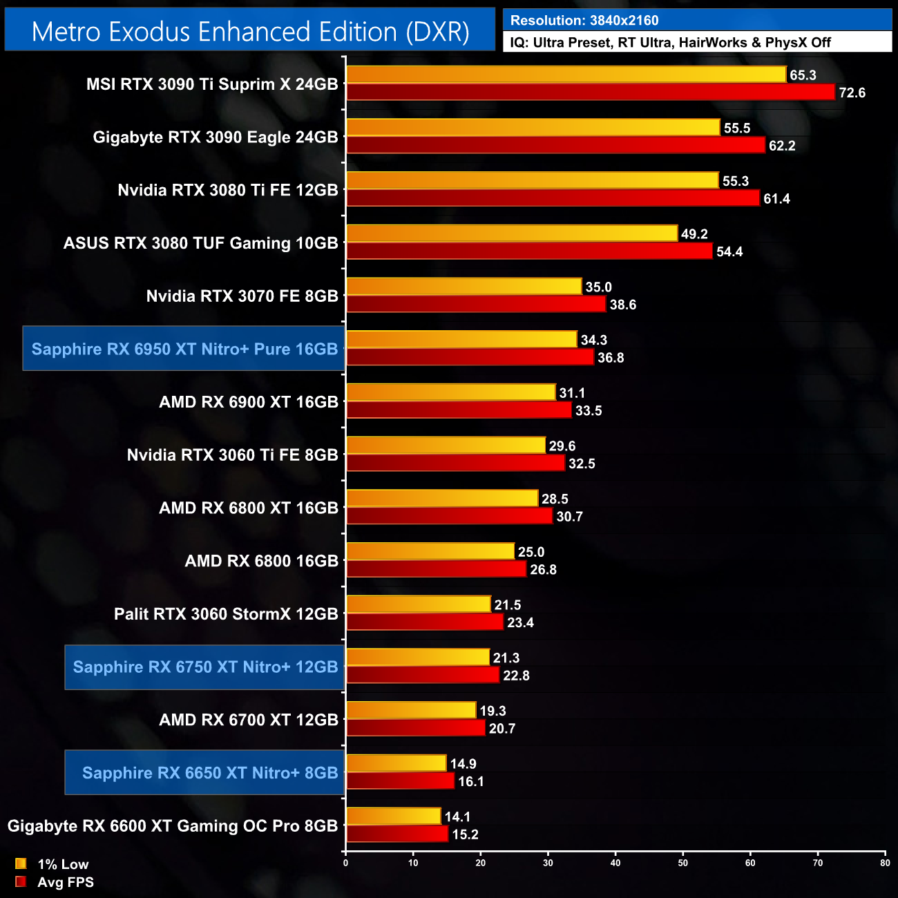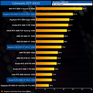 I have already mentioned this, but I do just want to stress that these results are very much a best case scenario for the RX 6X50 series, as we are testing Sapphire's heavily overclocked Nitro+ cards. The RX 6950 XT Nitro+ Pure, for instance, ships with an 11% factory overclock compared to the reference RX 6950 XT. As ever other card we have tested, bar the MSI RTX 3090 Ti, has been benchmarked at reference clock speed, this will slightly skew the data. If we were comparing reference models against reference models, I would expect smaller margins than what is shown here.