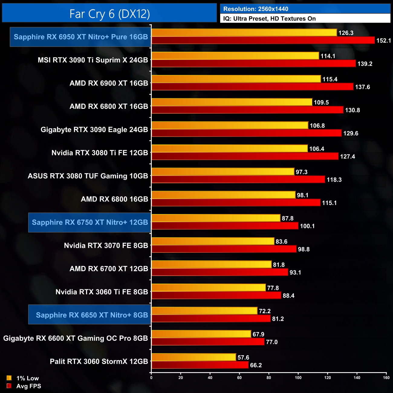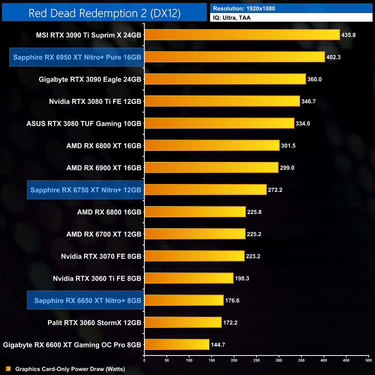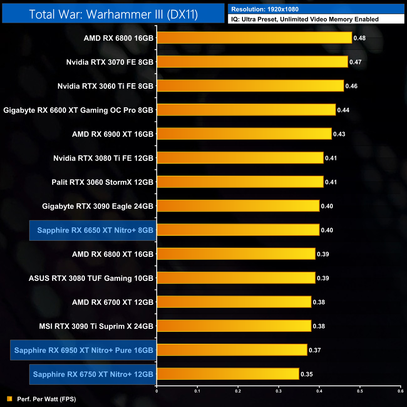 I have already mentioned this, but I do just want to stress that these results are very much a best case scenario for the RX 6X50 series, as we are testing Sapphire's heavily overclocked Nitro+ cards. The RX 6950 XT Nitro+ Pure, for instance, ships with an 11% factory overclock compared to the reference RX 6950 XT. As ever other card we have tested, bar the MSI RTX 3090 Ti, has been benchmarked at reference clock speed, this will slightly skew the data. If we were comparing reference models against reference models, I would expect smaller margins than what is shown here.