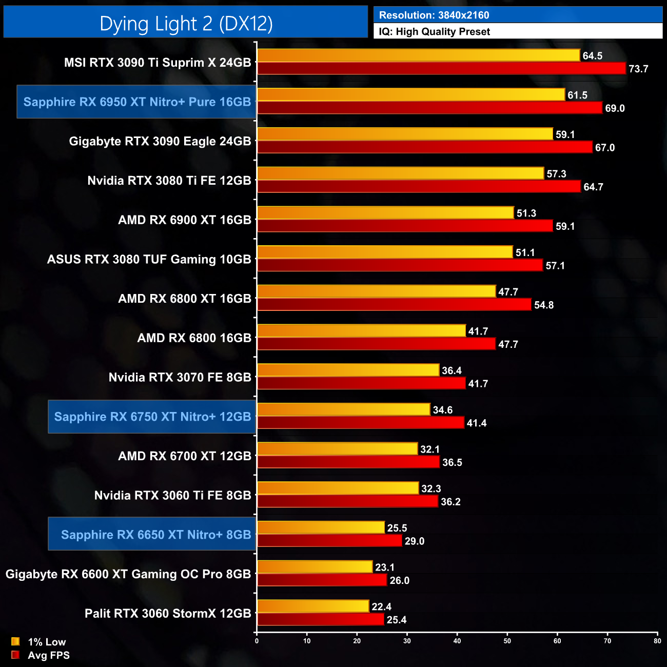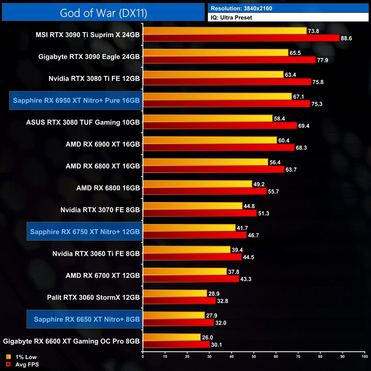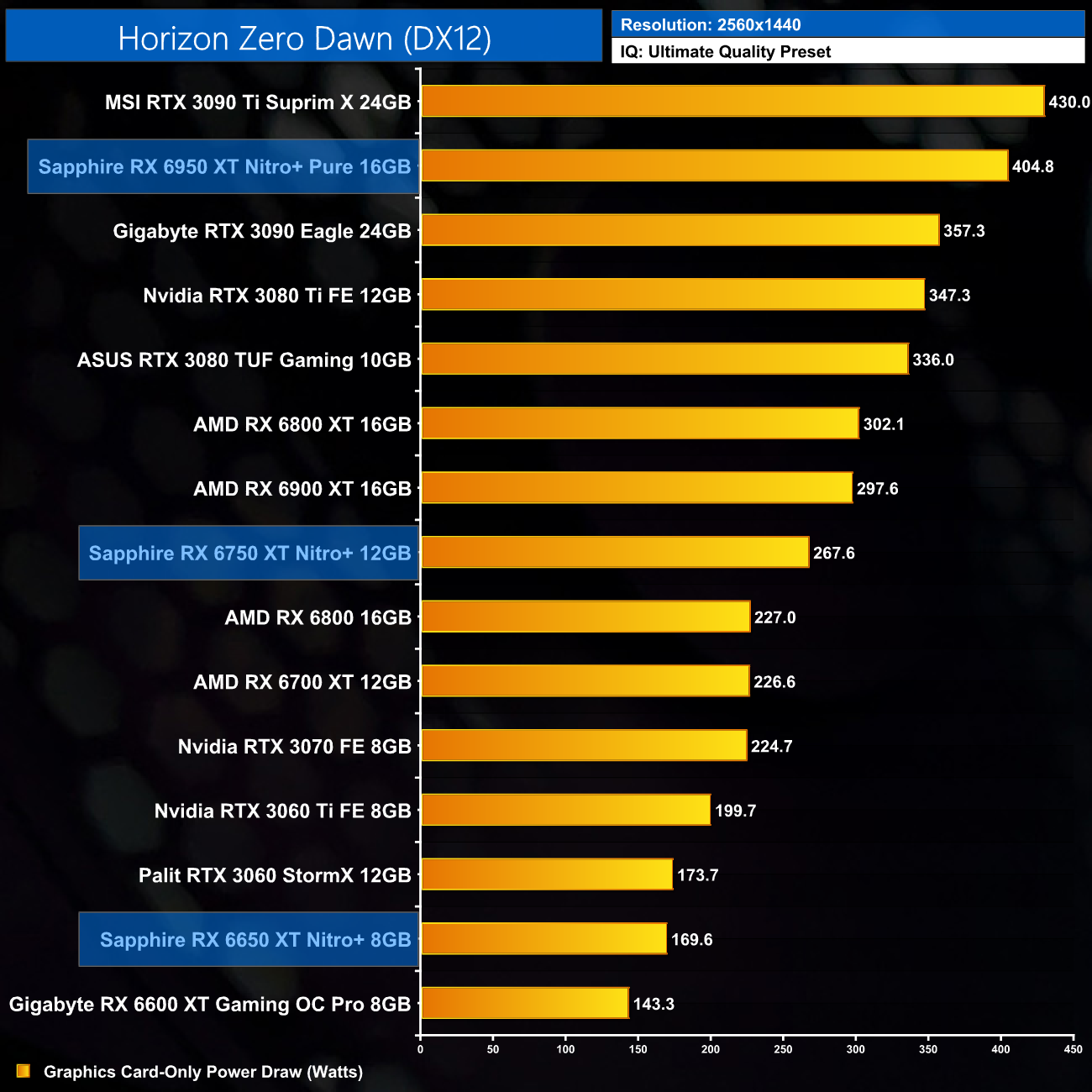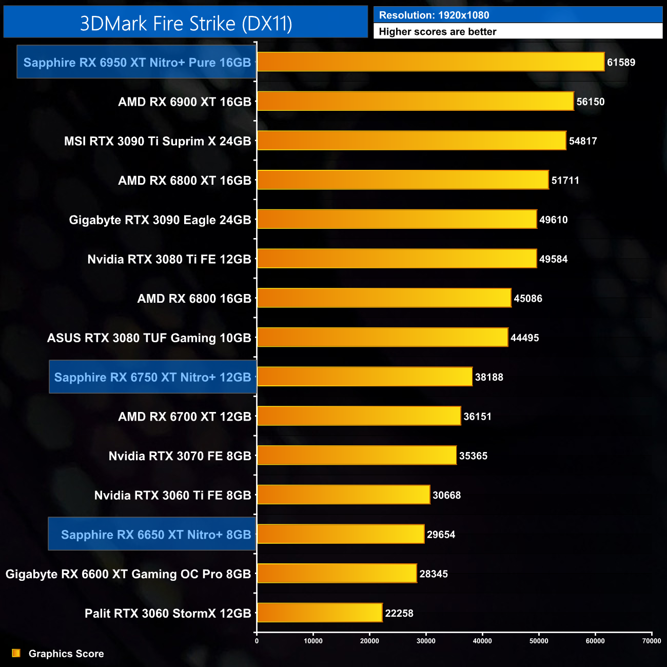 I have already mentioned this, but I do just want to stress that these results are very much a best case scenario for the RX 6X50 series, as we are testing Sapphire's heavily overclocked Nitro+ cards. The RX 6950 XT Nitro+ Pure, for instance, ships with an 11% factory overclock compared to the reference RX 6950 XT. As ever other card we have tested, bar the MSI RTX 3090 Ti, has been benchmarked at reference clock speed, this will slightly skew the data. If we were comparing reference models against reference models, I would expect smaller margins than what is shown here.