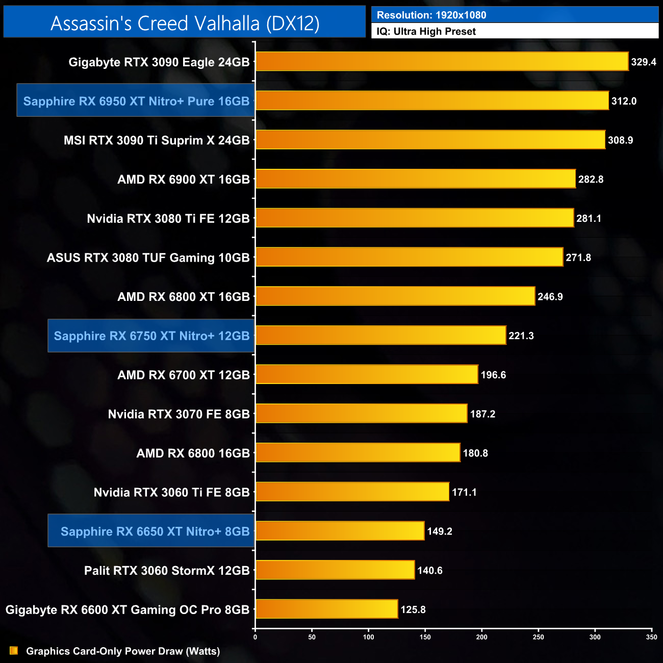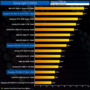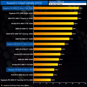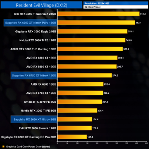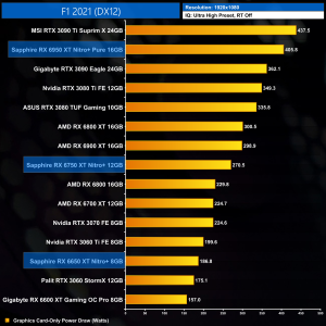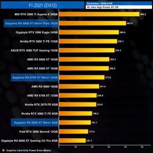 The increase in clock and memory speed necessitates an increase to power draw. Sapphire raised power targets even further than the reference figures however, but we can still see some significant jumps at 1080p – the 6950 XT draws over 70W more than the 6900 XT, while the 6750 XT is pulling another 40W over the RX 6700 XT.