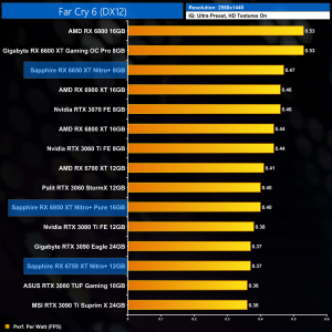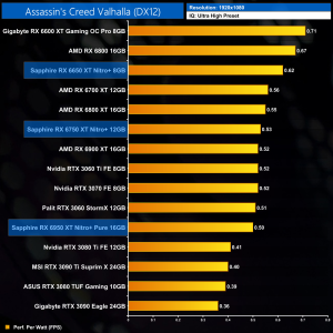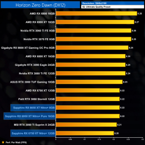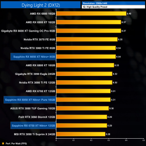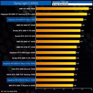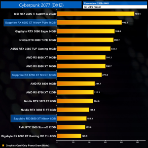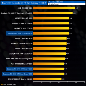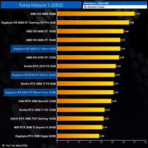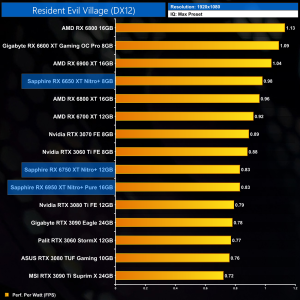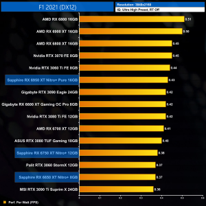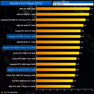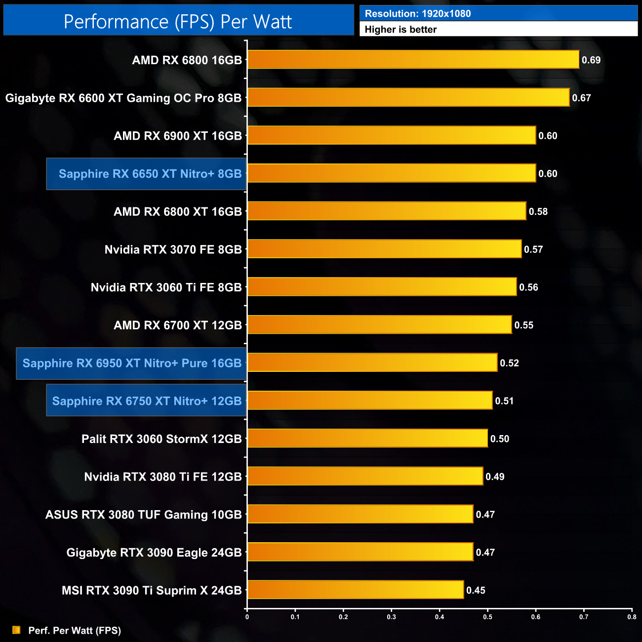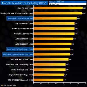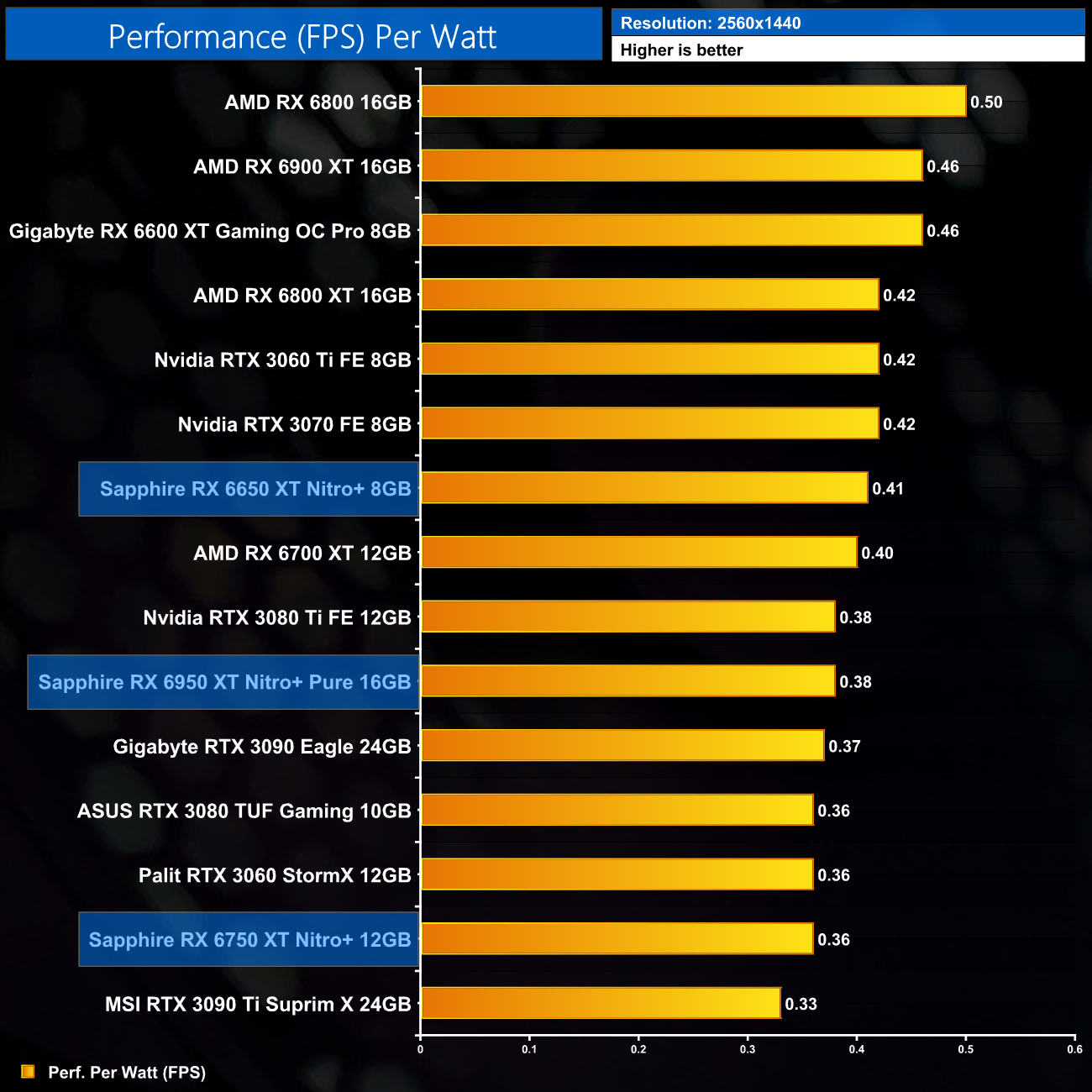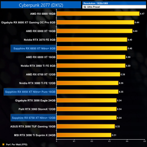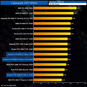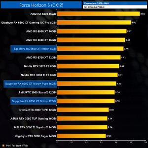 The same goes at 1440p. The original RX 6900 XT is one of the most efficient GPUs on the market – Sapphire's RX 6950 XT Nitro+ is about 17% less efficient in terms of performance per Watt.