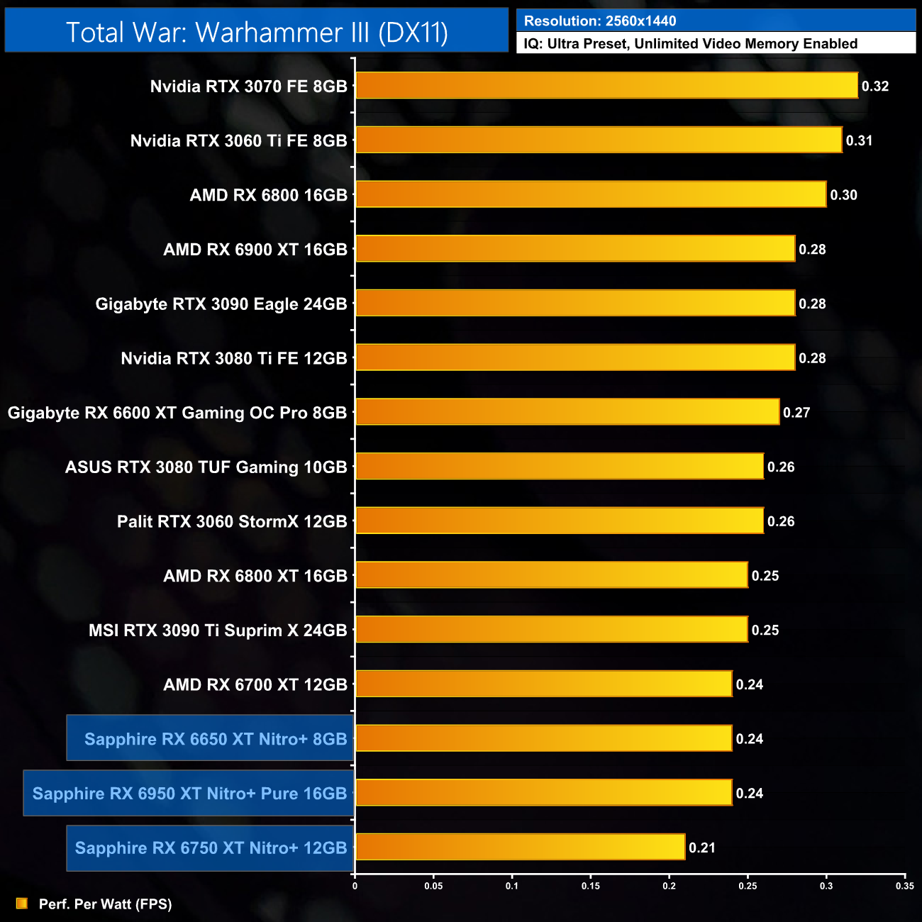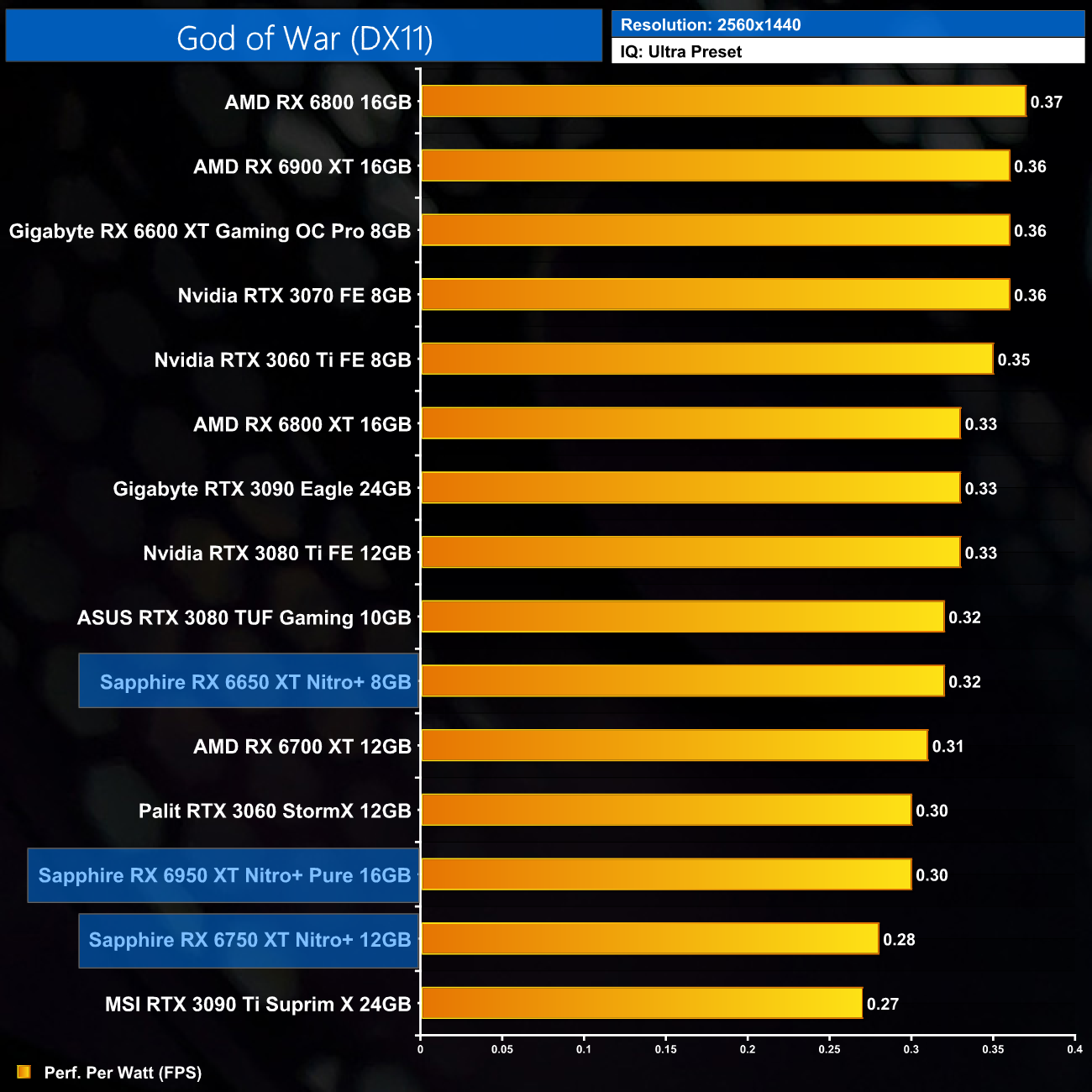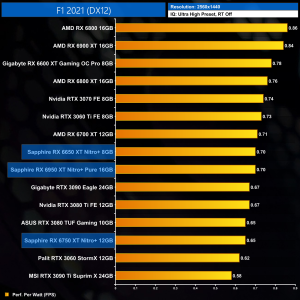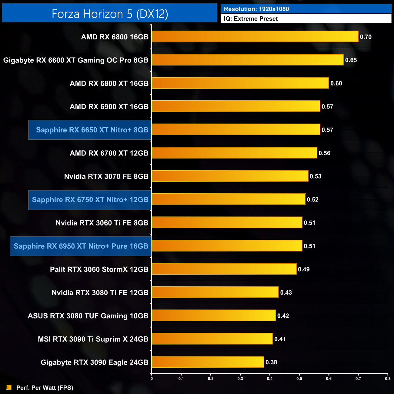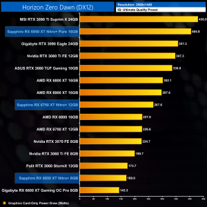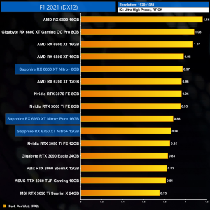 The same goes at 1440p. The original RX 6900 XT is one of the most efficient GPUs on the market – Sapphire's RX 6950 XT Nitro+ is about 17% less efficient in terms of performance per Watt.
