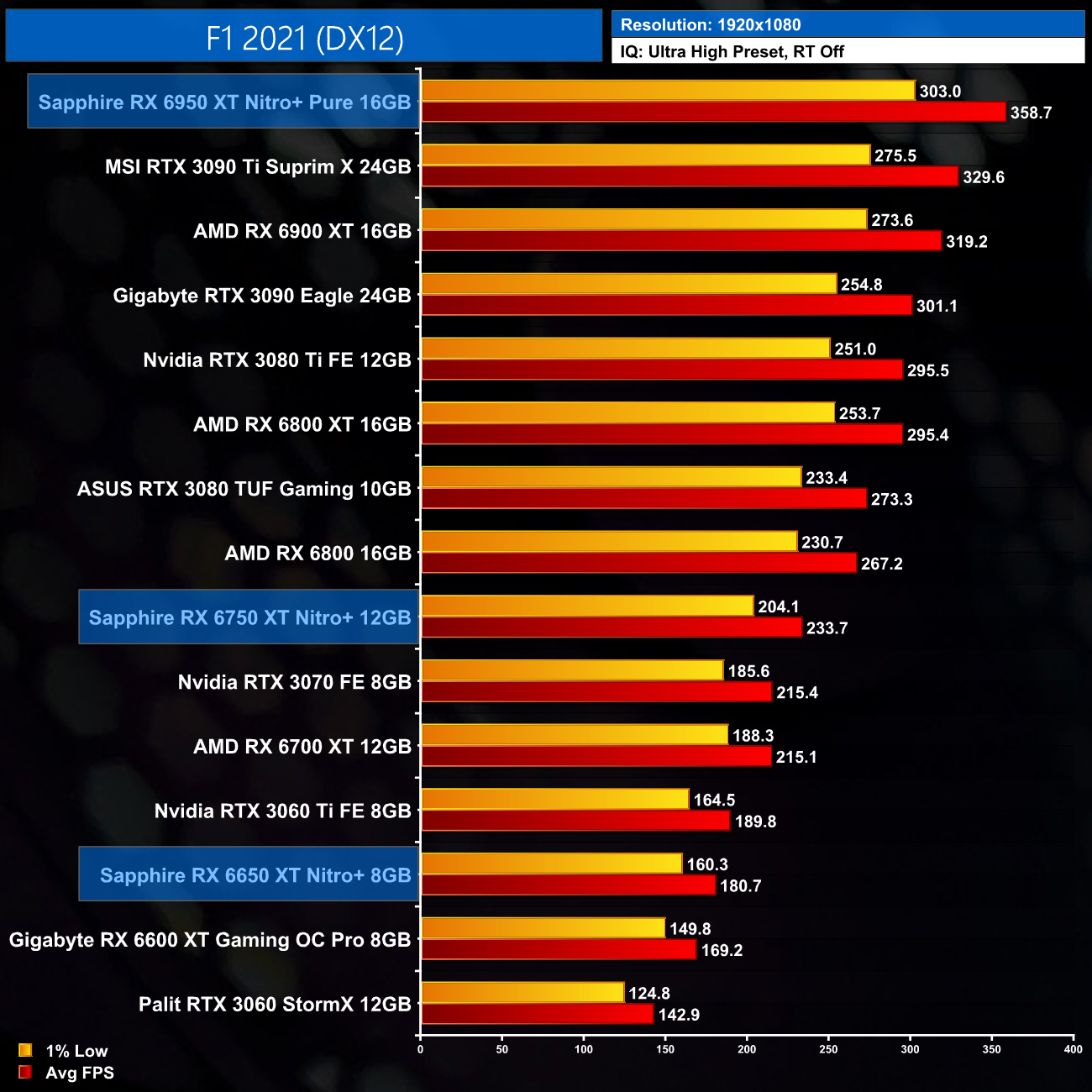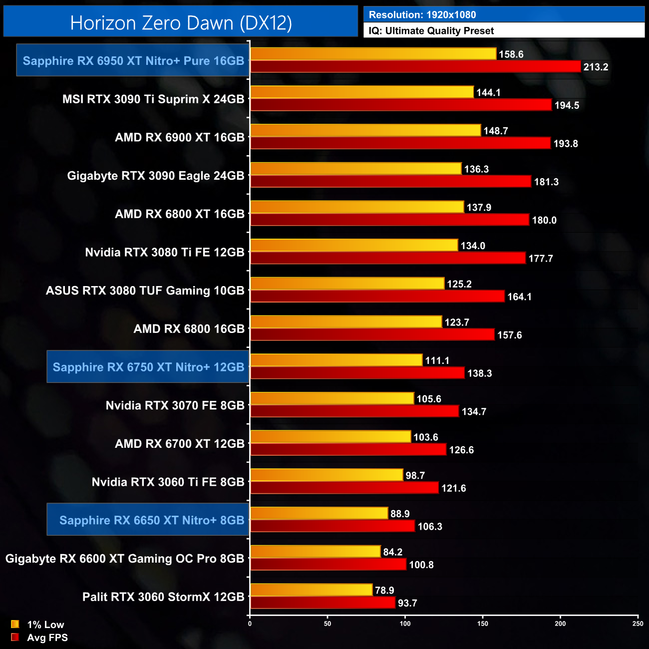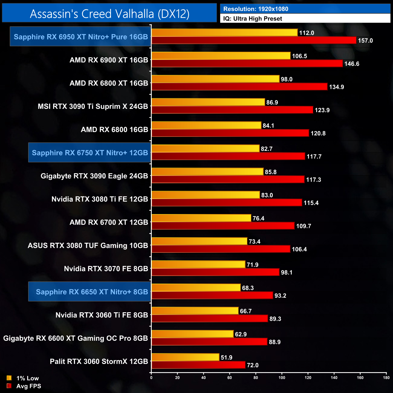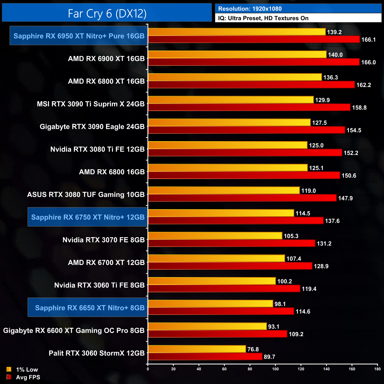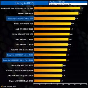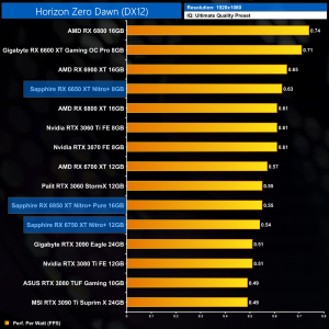 Averaged across our 12 games, at 1080p the Sapphire RX 6650 XT Nitro+ ran 6% faster than the RX 6600 XT, while the 6750 XT proved 8% faster than the RX 6700 XT. The big dog, the RX 6950 XT, ran 9% faster than the vanilla RX 6900 XT, which isn't too shabby.