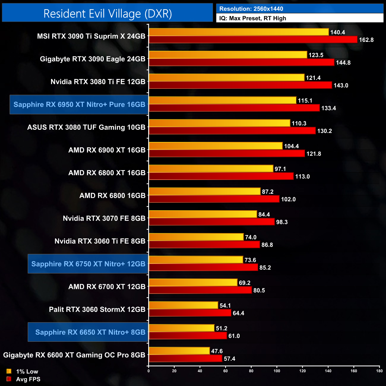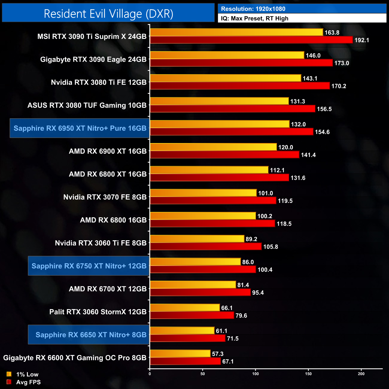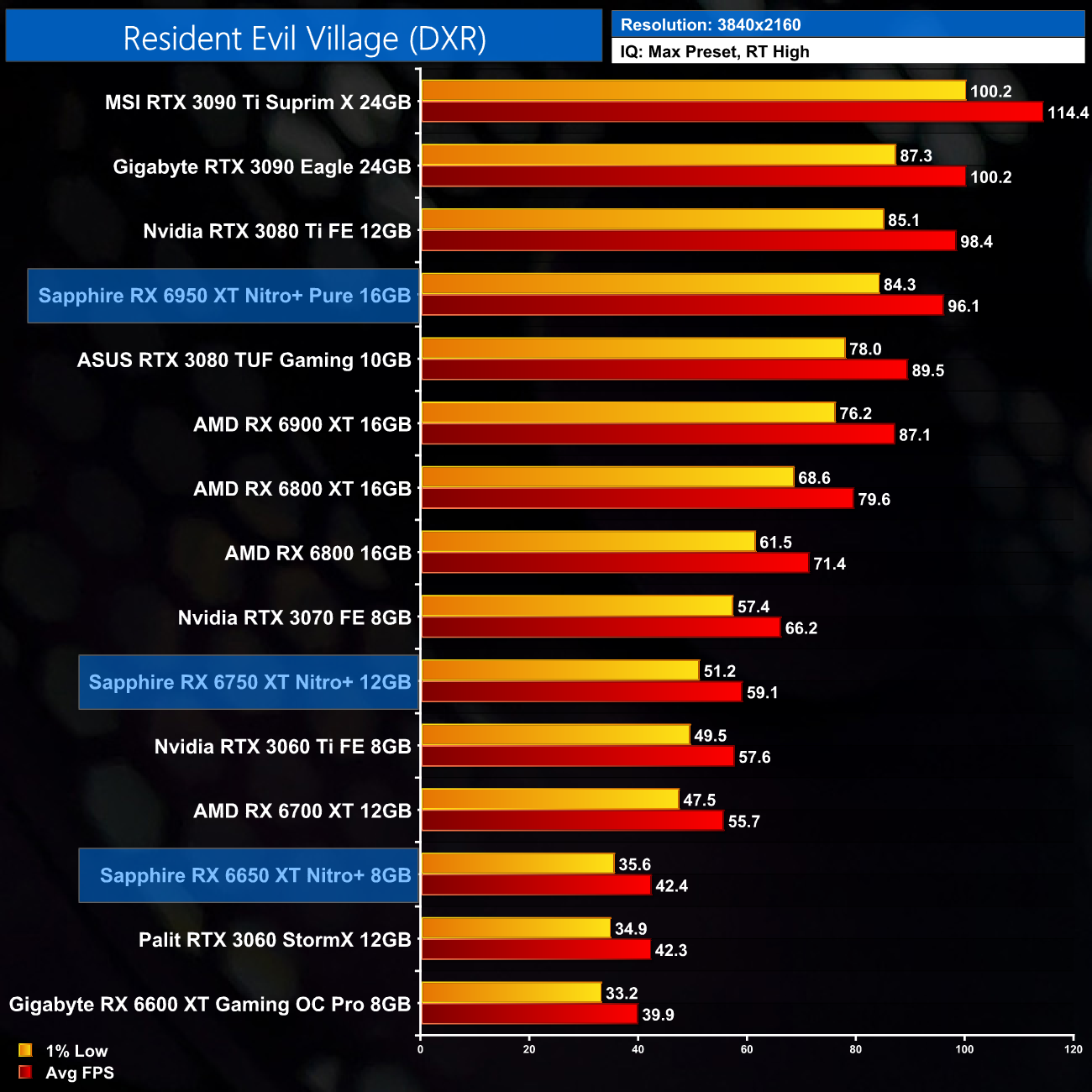 Here we test Resident Evil Village, this time testing with the in-game ray tracing effects set to High.