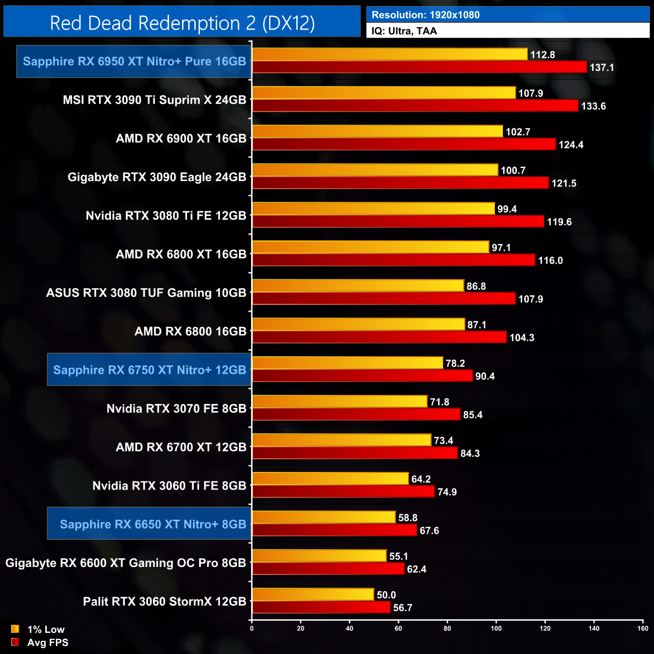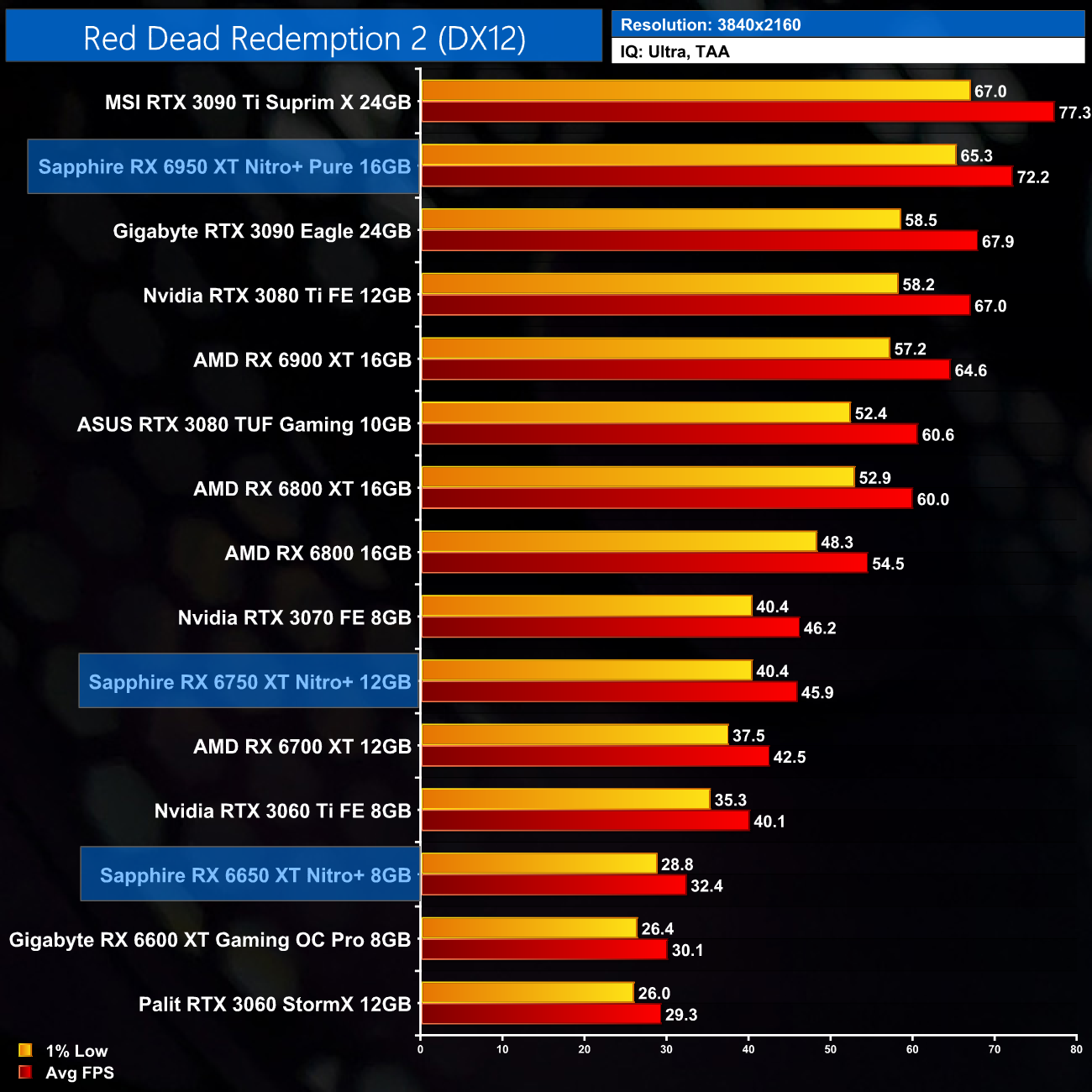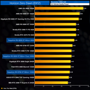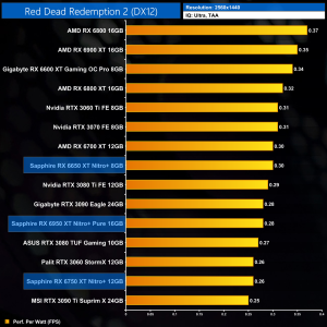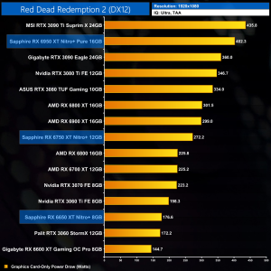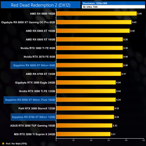 Moving onto Red Dead Redemption 2, this is one of the better games for the RX650 series of cards. At 1080p, we are looking at an 8% performance improvement for the RX 6650 XT, when compared against the 6600 XT, while the 6750 XT is 7% ahead of the RX 6700 XT. The Nitro+ 6950 XT is once more top of the chart however, just edging ahead of the RTX 3090 Ti.