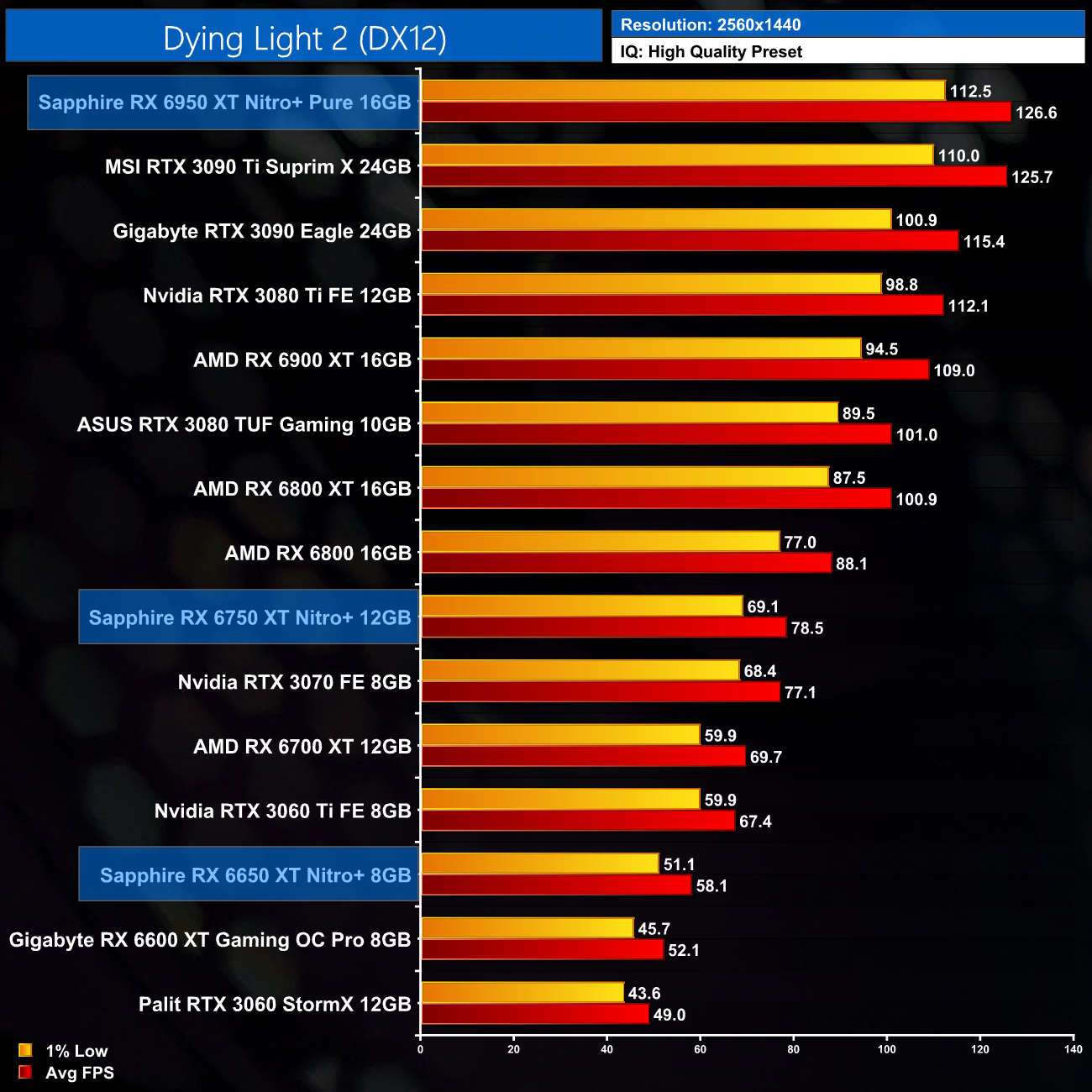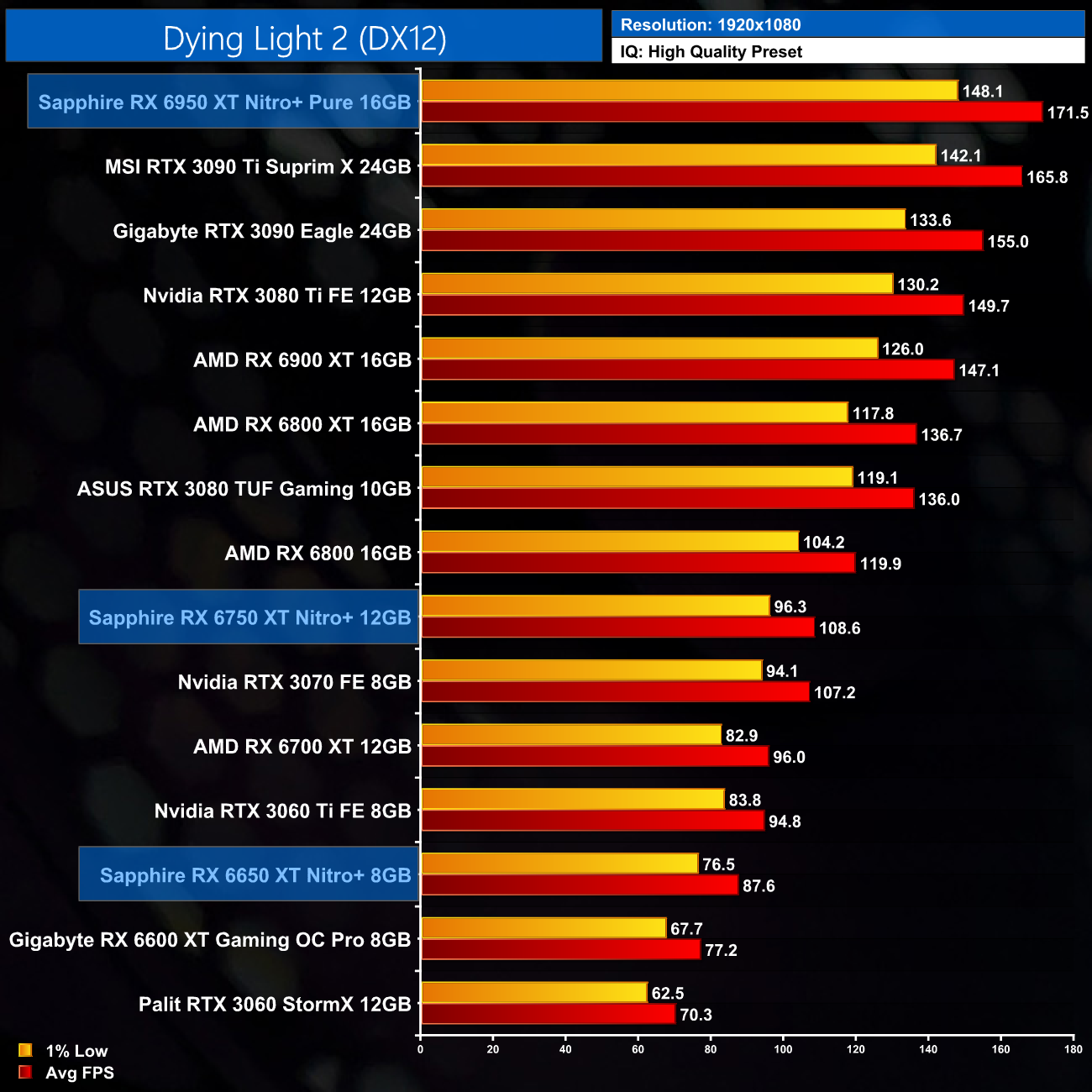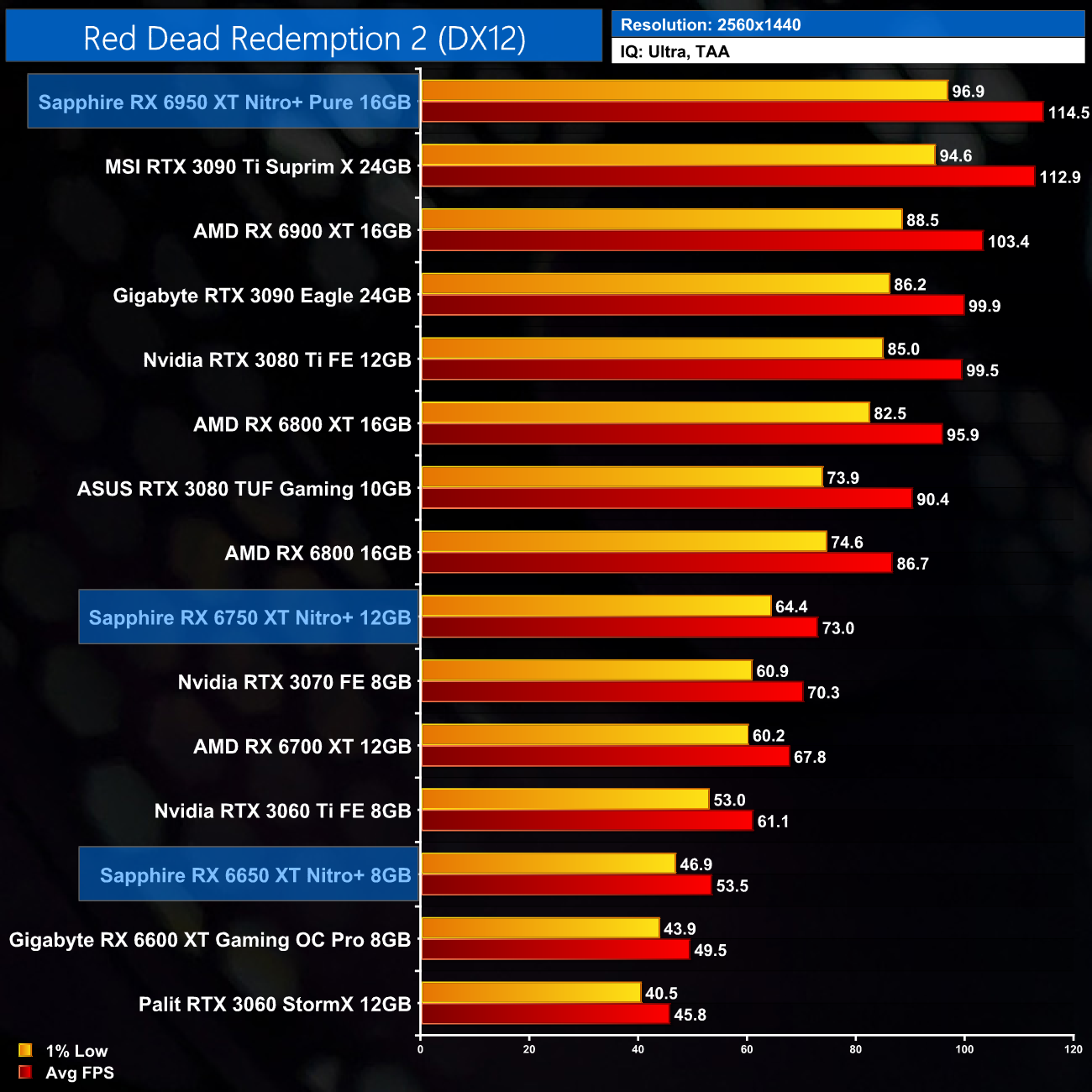 Moving onto Red Dead Redemption 2, this is one of the better games for the RX650 series of cards. At 1080p, we are looking at an 8% performance improvement for the RX 6650 XT, when compared against the 6600 XT, while the 6750 XT is 7% ahead of the RX 6700 XT. The Nitro+ 6950 XT is once more top of the chart however, just edging ahead of the RTX 3090 Ti.