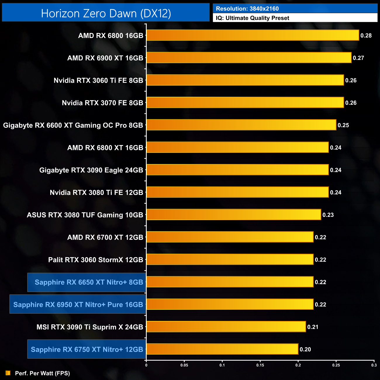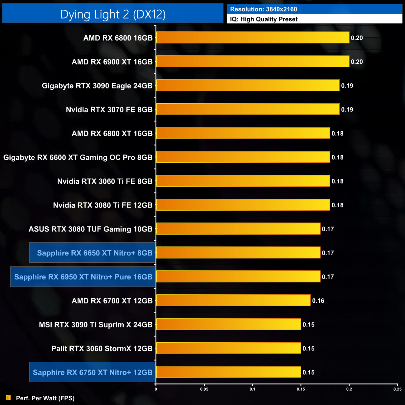 Using the graphics card-only power draw figures presented earlier in the review, here we present performance per Watt on a per-game basis for all twelve games we tested at 2160p.
