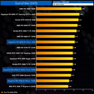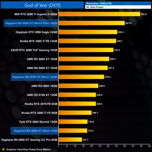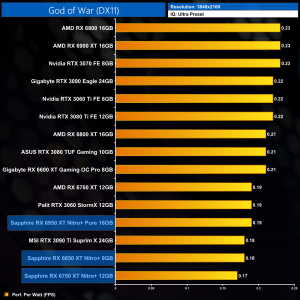 God of War is more favourable to Nvidia graphics cards, but we can still see the kind of performance improvements we have come to expect from the RX650 series – the RX 6650 XT is 7% faster than its predecessor, while the 6750 XT adds 8-9% performance over the RX 6700 XT. Compared to its Nvidia rivals however, the RX 6950 XT is underperforming, falling just short of the RTX 3080 Ti at 4K.
