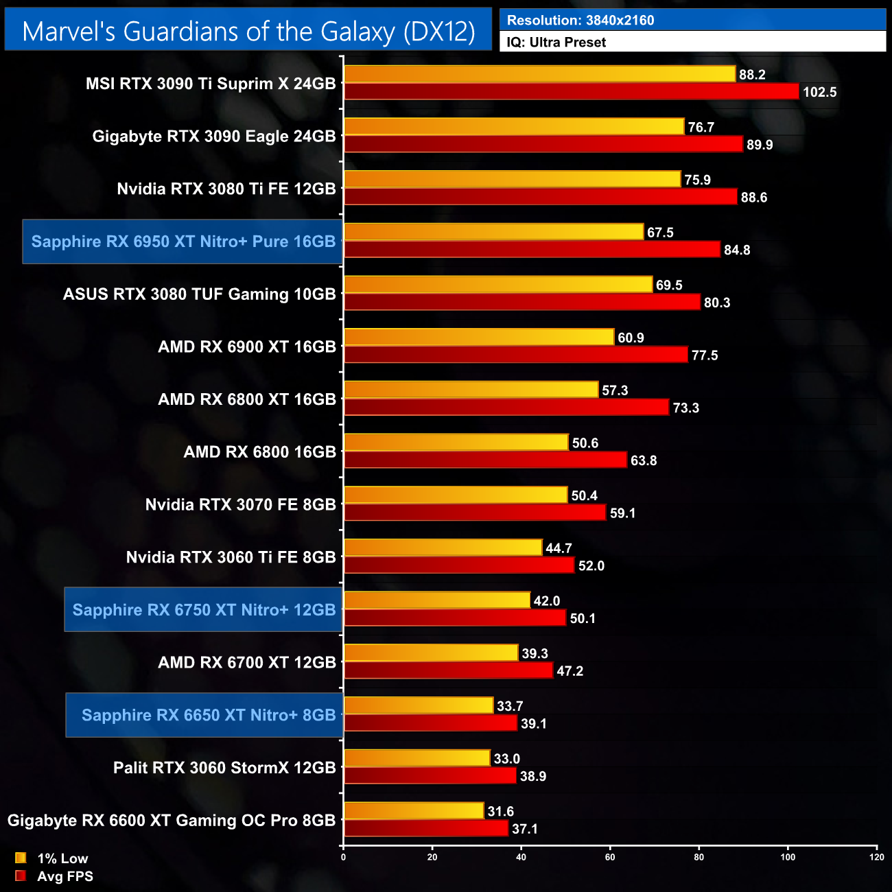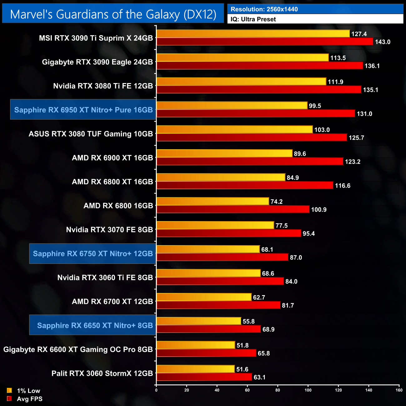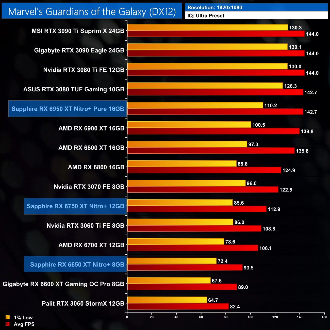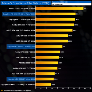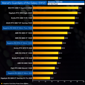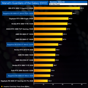 Marvel's Guardians of the Galaxy is an Nvidia sponsored title and AMD GPUs do suffer somewhat here, particularly with the 1% lows. At 1440p the RX 6750 XT is only a touch faster than the RTX 3060 Ti, while even at 4K the RX 6950 XT delivers just 9% more performance than the RX 6900 XT.