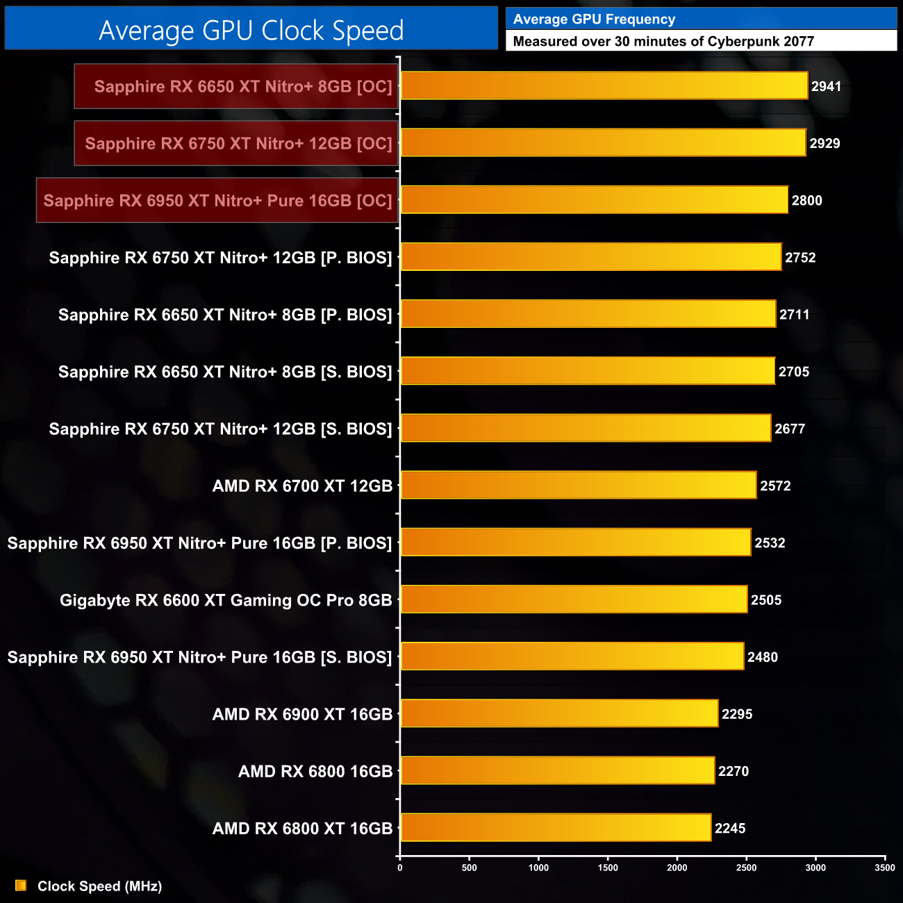 For our clock speed testing, we put both BIOS modes for each of the cards to the test. We can clearly see some big increases in clock speed compared to the original RX 6000-series cards – the Nitro+ RX 6650 XT is over 200MHz faster than its predecessor, for instance, while the RX 6750 XT is about 180MHz faster. Even the RX 6950 XT comes in over 230MHz faster than the RX 6900 XT, which is quite impressive considering it has the largest core-count of any RDNA2 GPU.