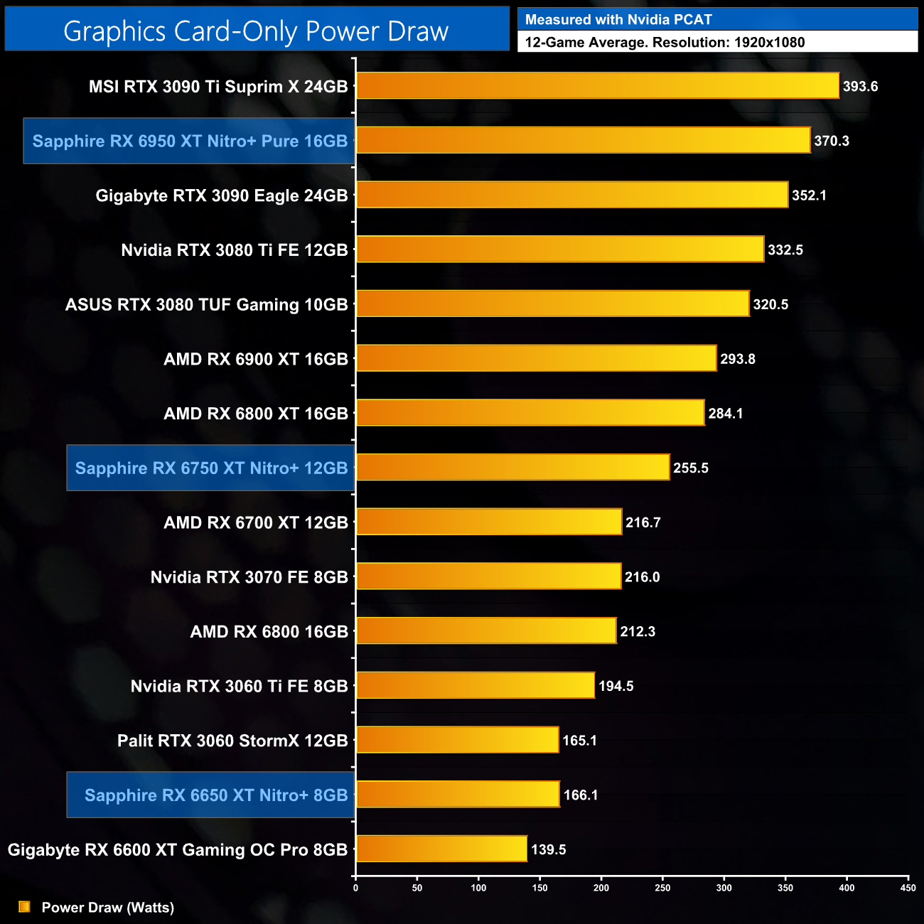 That does also necessitate an increase to power draw, with the RX 6950 XT rated at 335W, the 6750 XT at 250W and the 6650 XT at 180W. All three Sapphire cards we are looking at today have even higher power limits though, but we are on hand to utilise our best ever GPU power testing methodology in this review, so read on for our most detailed power testing yet.