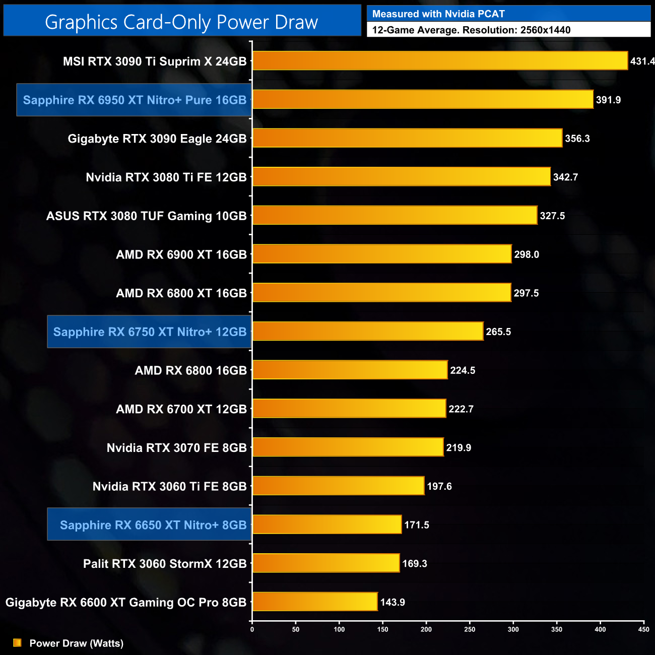 Here we present power draw figures for the graphics card-only, on a per-game basis for all twelve games we tested at 1440p. This is measured using Nvidia's Power Capture Analysis Tool, also known as PCAT. You can read more about our updated power draw testing methodology HERE.