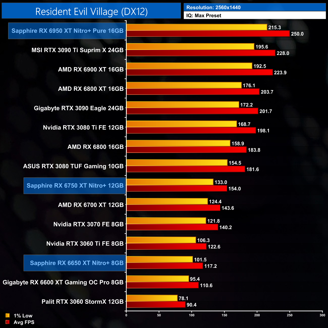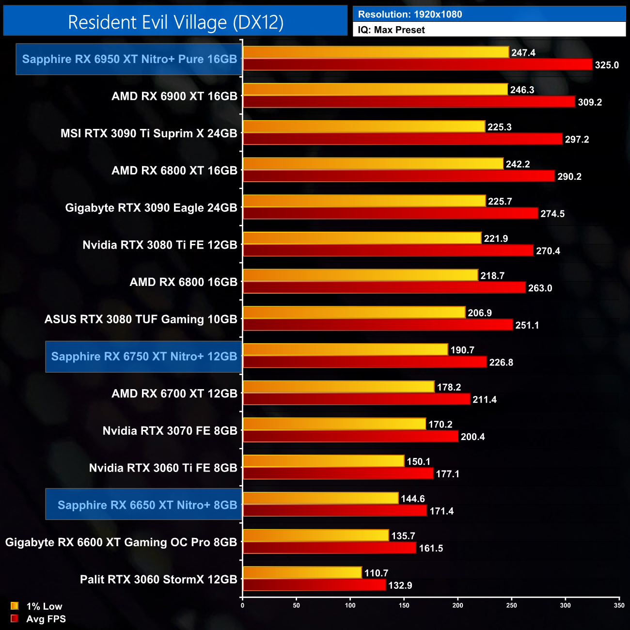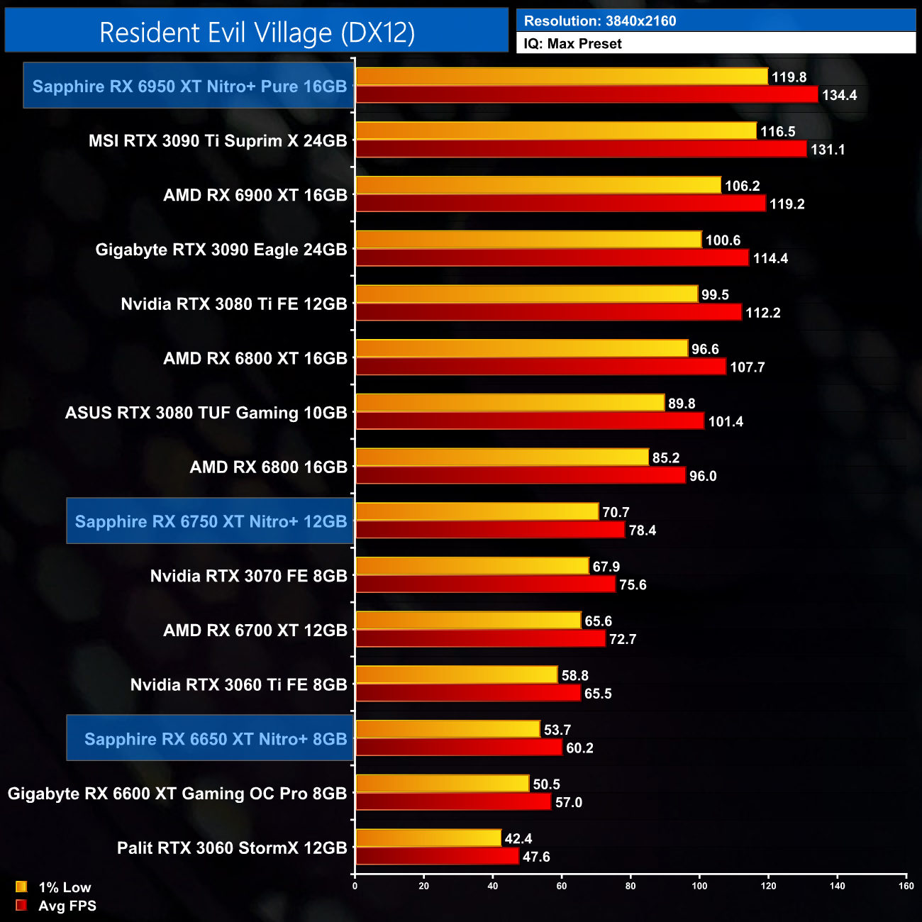 As for Resident Evil Village, this AMD-sponsored title has a heavy bias towards Team Red, and we can see the RX 6X50 cards performing strongly at every resolution. Even at 4K, the 6950 XT proves faster than the RTX 3090 Ti, and the 6750 XT is comfortably faster than the RTX 3070 at 1440p.