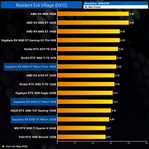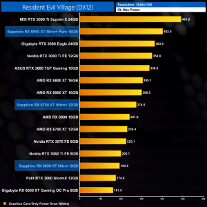 Lastly, Resident Evil Village is much lighter in terms of the ray tracing workload, so AMD GPUs aren't as negatively impacted as in Cyberpunk or Metro Exodus. The RX 6750 XT is almost managing 60FPS at 4K, for example, and isn't too far off the performance of the RTX 3070.