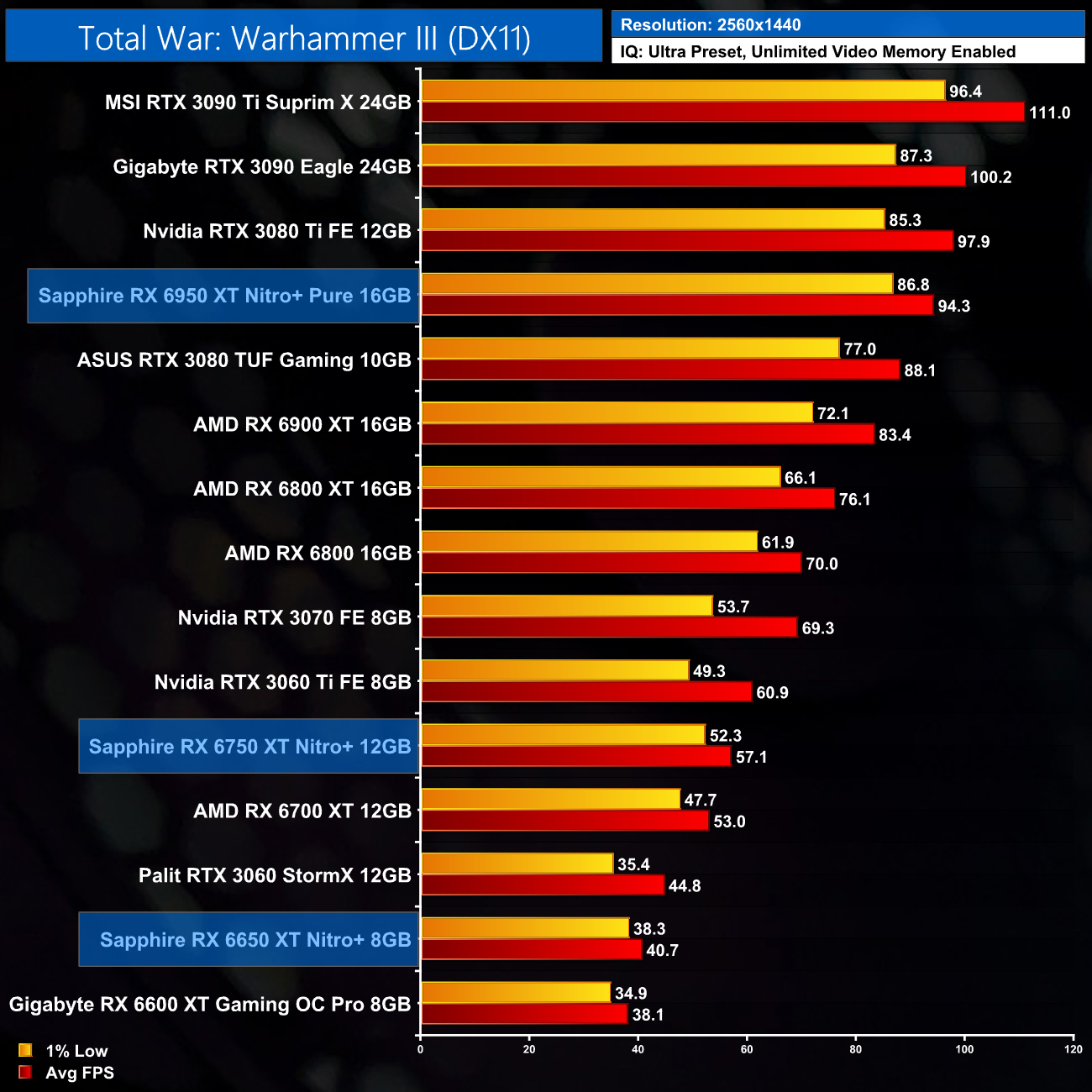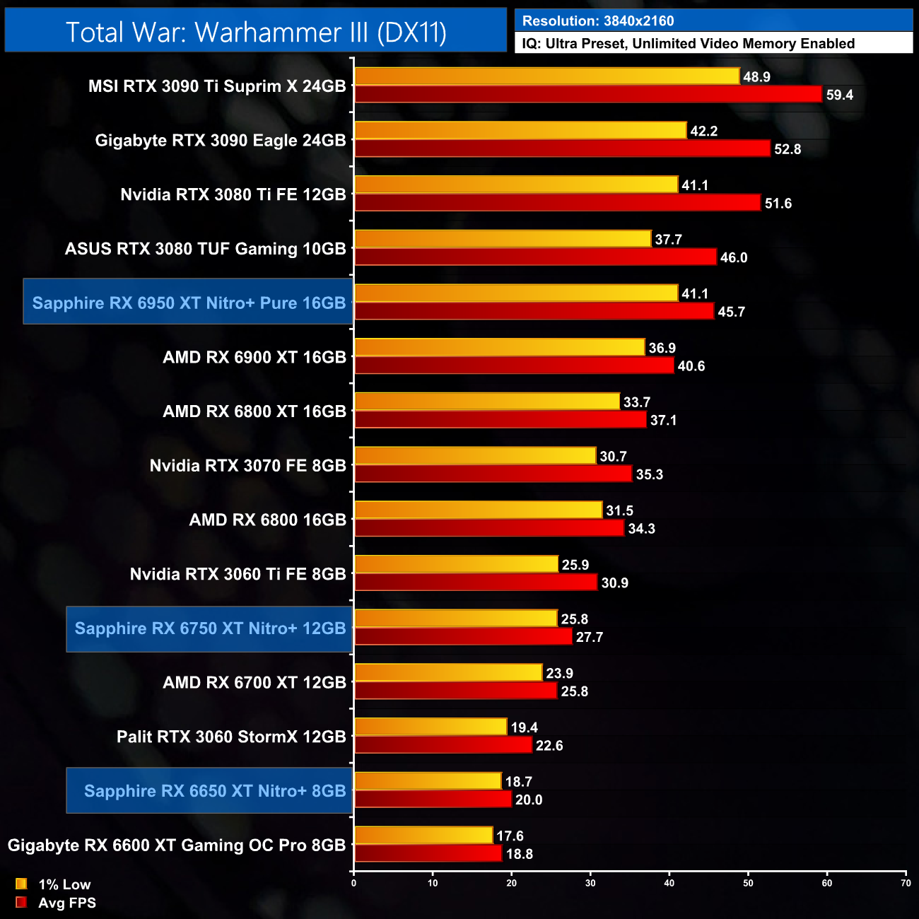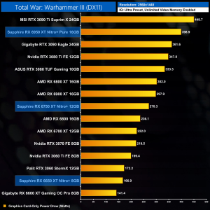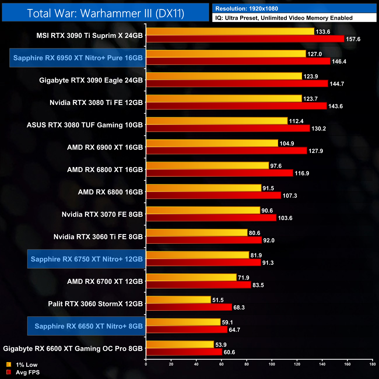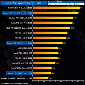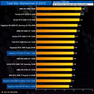 Closing out with Total War: Warhammer III, by now you have got the picture – the RX 6650 XT sees a 7% performance lead over the RX 6600 XT at 1080p, while the 6750 XT is 9% faster than the 6700 XT. The RX 6950 XT sees almost a 15% performance bump over the 6900 XT, but it is still short of the RTX 3090 Ti.