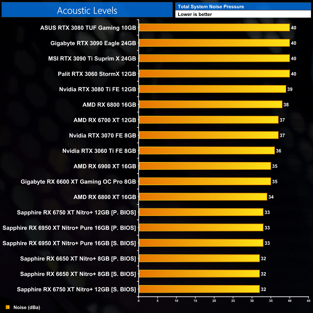With that in mind, it is actually a credit to Sapphire that the three cards we tested today all proved to run cool and quiet, despite the increased power limits. Noise levels are a particular highlight, and I would say these are some of the quietest graphics card I have ever reviewed, with noise levels hovering around the 32dBa mark. If you do end up picking up one of these Nitro+ models, I'd say they are among the best AMD-based AIB cards I have ever tested.