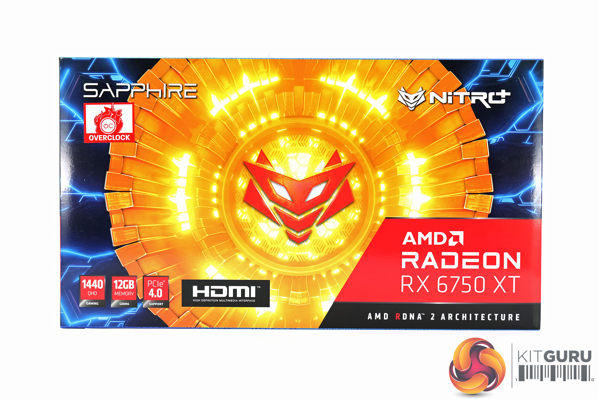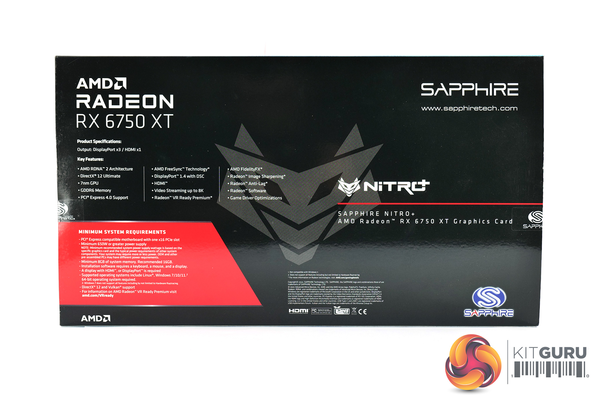 As for the Sapphire RX 6750 XT Nitro+, this ships in an eye-catching blue, black and yellow box, with the Nitro+ logo placed centrally. On the back, more key features of the GPU are highlighted.
