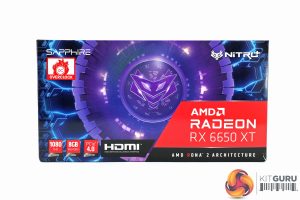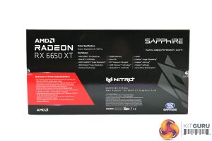 The Sapphire RX 6650 XT Nitro+ ships in a purple-coloured box, with the Nitro logo taking pride of place on the front. On the back, Sapphire highlights a few key features of the GPU itself.