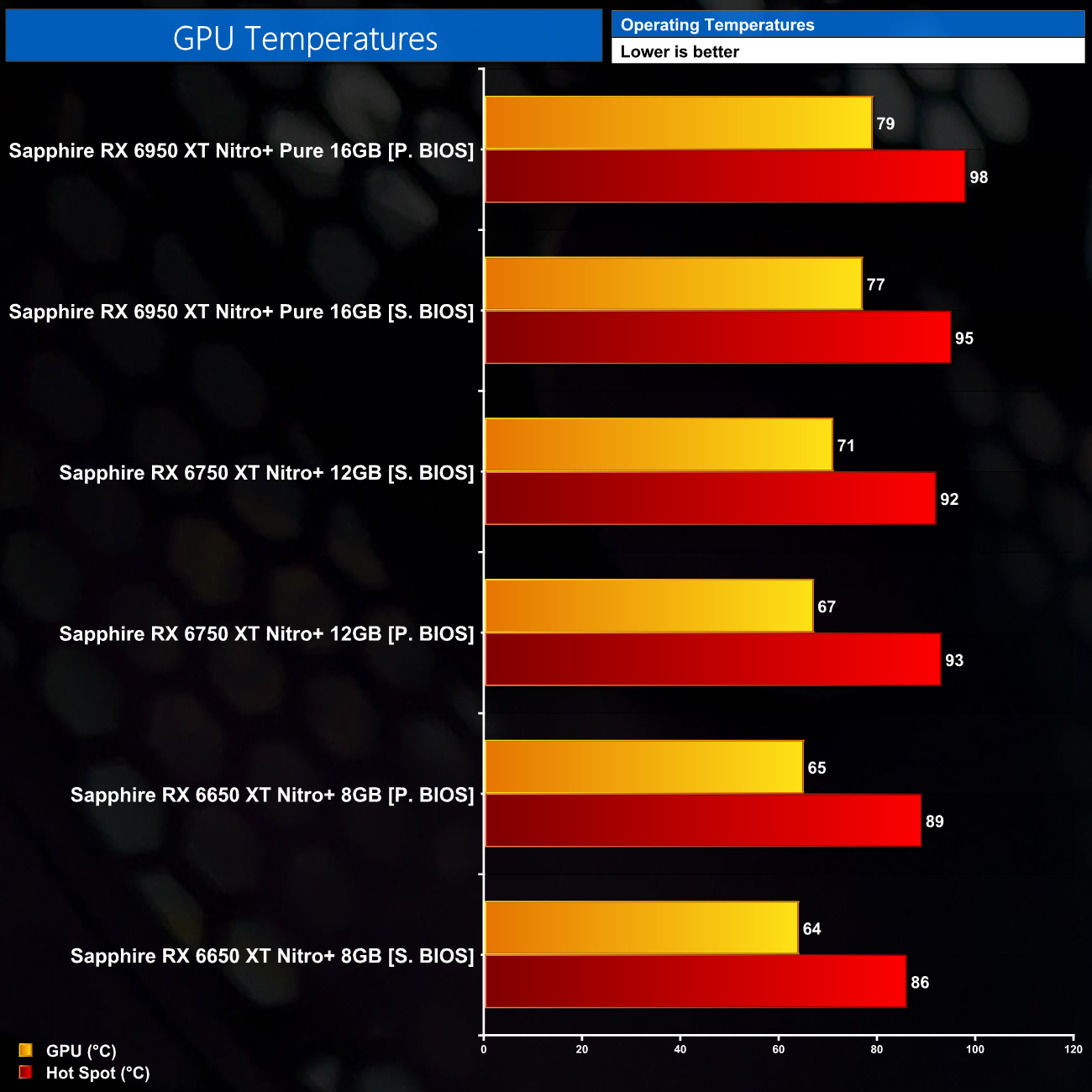 Thermally, these Sapphire Nitro+ models perform very well. As we'd expect, the 6950 XT runs the hottest as it has the highest power rating, but the GPU edge temperature remains below 80C. The RX 6650 XT and RX 6750 XT are even more impressive, keeping the edge temperature below 70C in the case of the RX 6650 XT, while even the Silent BIOS on the RX 6750 XT just reaches over 70 degrees.