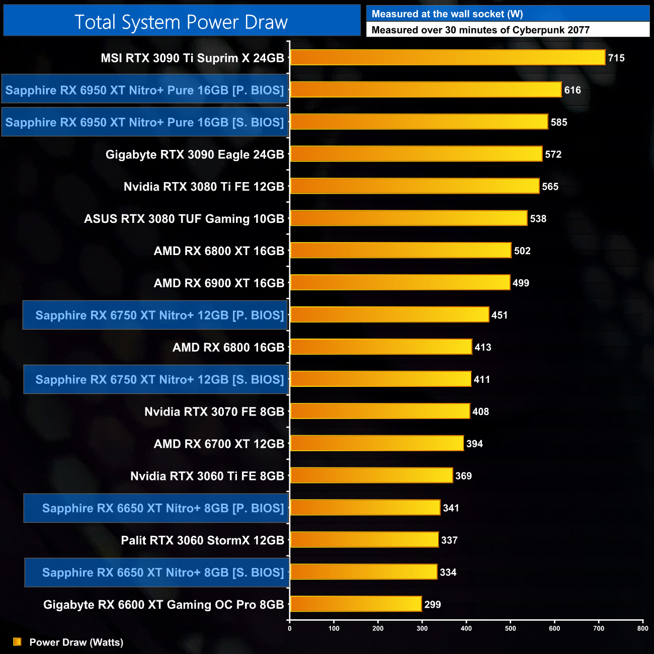 We measure system-wide power draw from the wall while running Cyberpunk 2077 for 30 minutes.