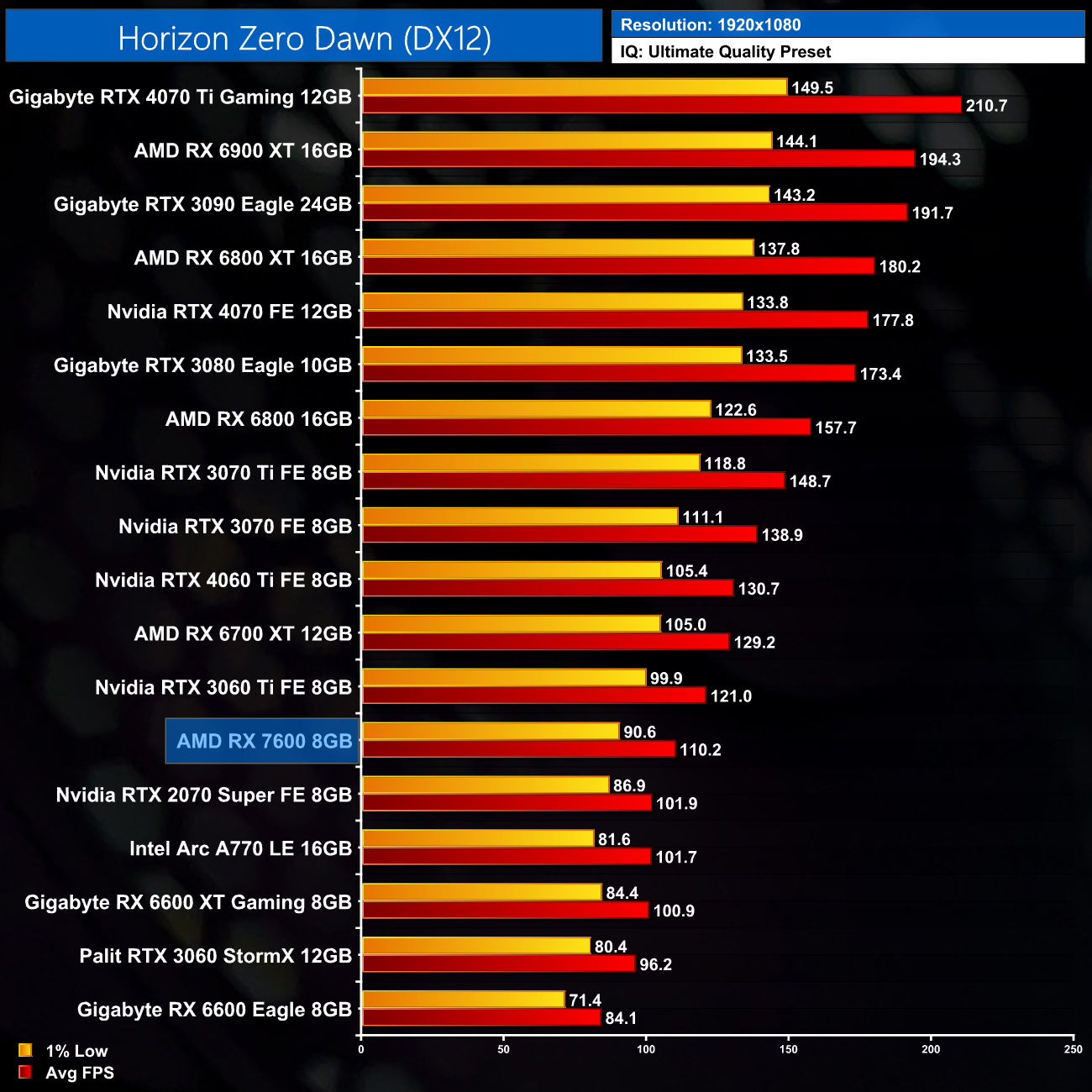 Up next is Horizon Zero Dawn, a now slightly older game that runs very well on a lot of hardware – we're getting over 100FPS at 1080p maximum settings, and that's a 31% uplift versus the RX 6600.