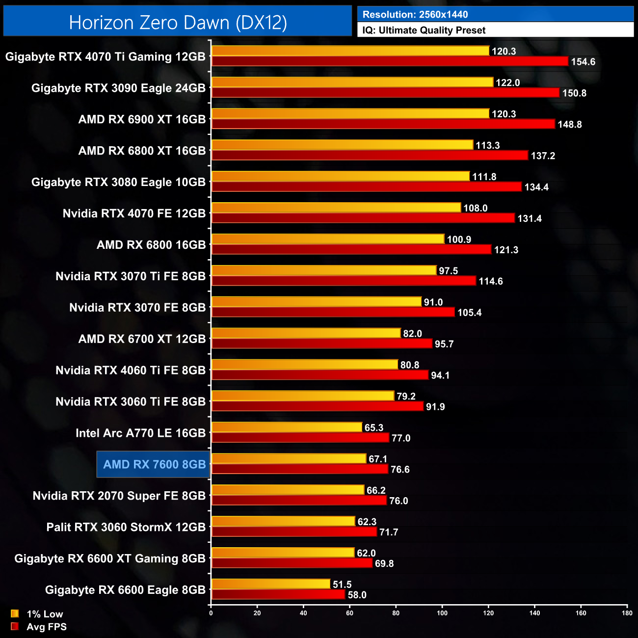 1440p is no problem either, the 7600 is 32% faster than the 6600, and 10% ahead of the 6600 XT, though it's not massively faster than the RTX 3060 here.