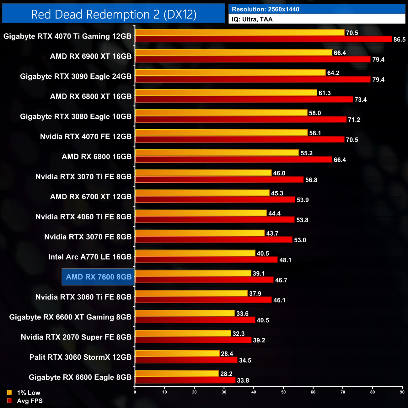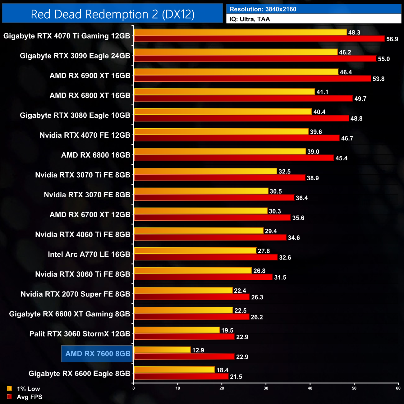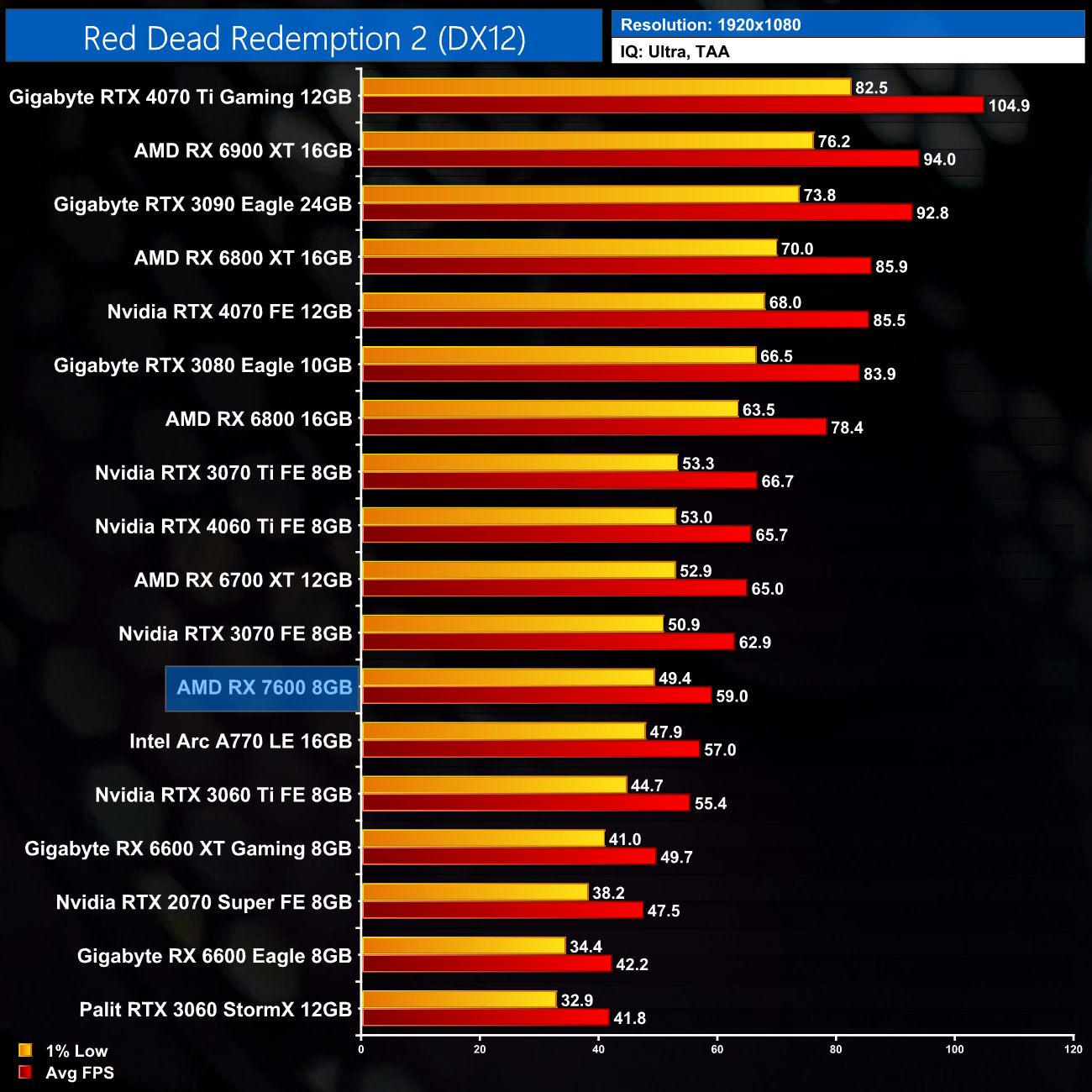 Red Dead Redemption 2 is a best case scenario for the RX 7600, it scales incredibly well here against the competition, beating out the 3060 Ti by a 7% margin, and it's only just behind the RTX 3070, which is impressive stuff considering the price point.