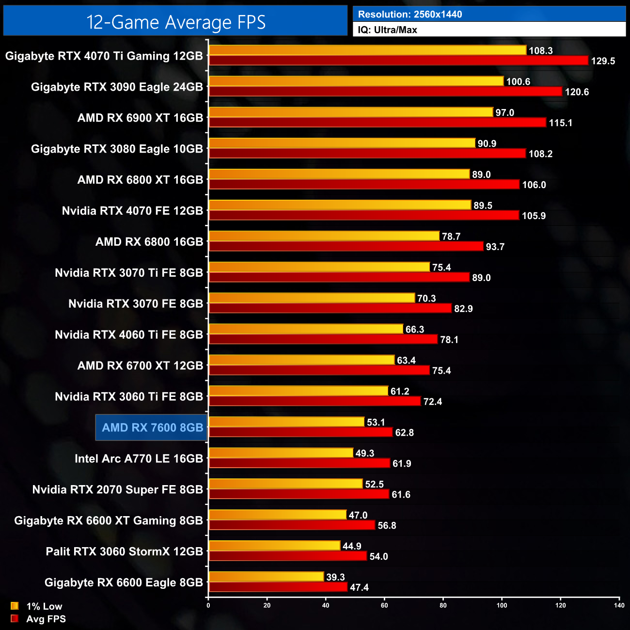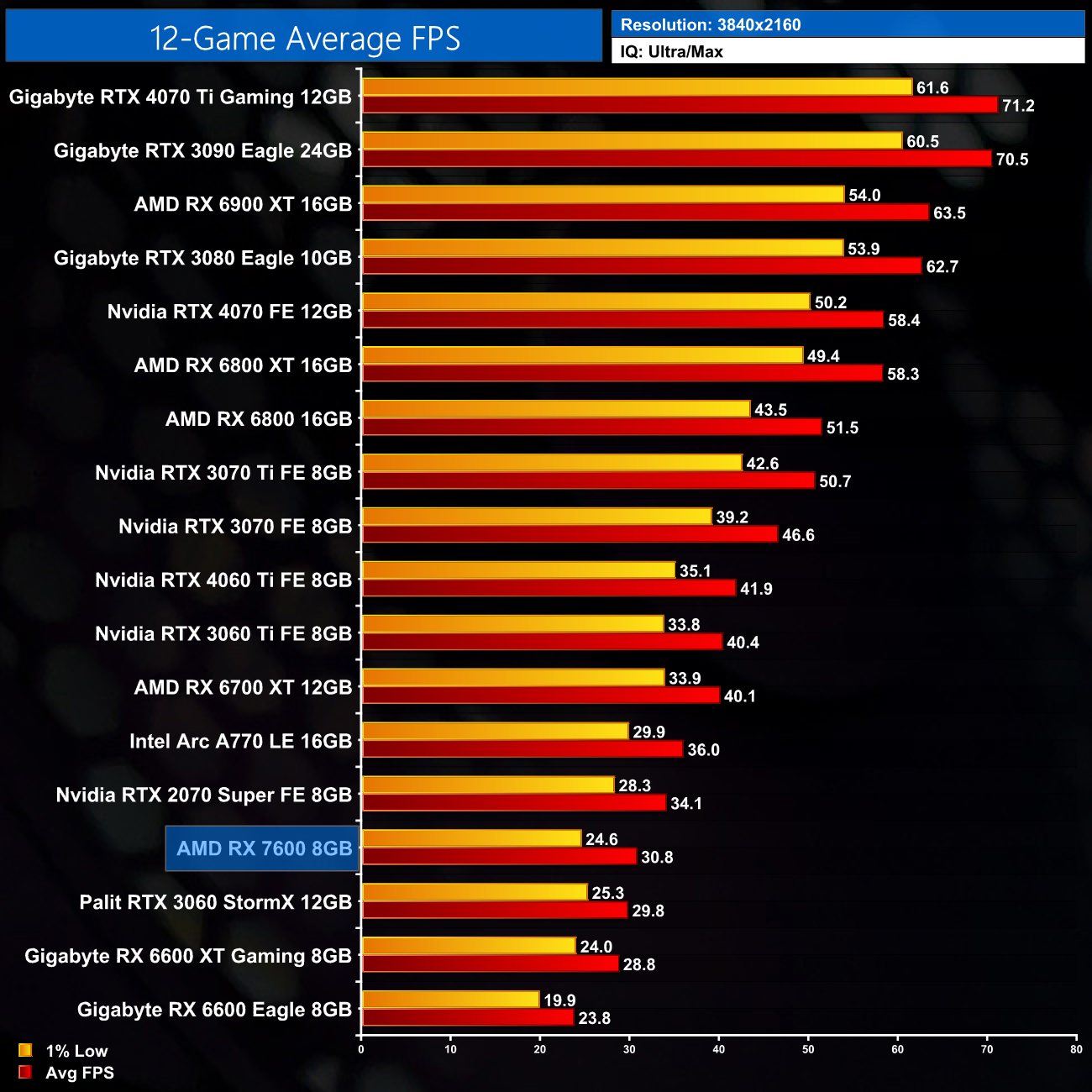 Overall, across the 12 games tested, AMD's RX 7600 delivers a 91FPS average frame rate, and that makes it a 31% improvement versus the RX 6600. It's only 10% slower than the RTX 3060 Ti, but 10% faster than the RX 6600 XT.