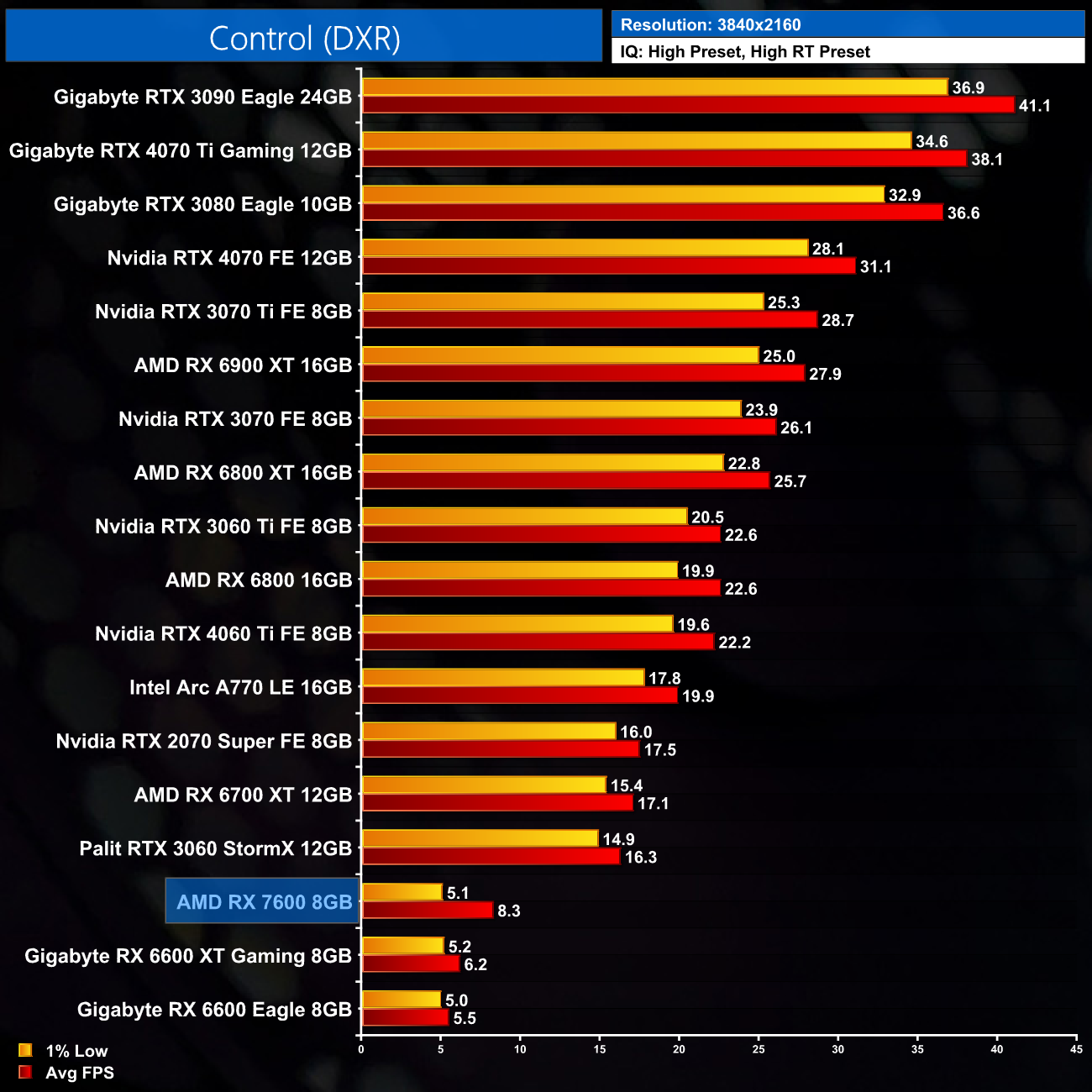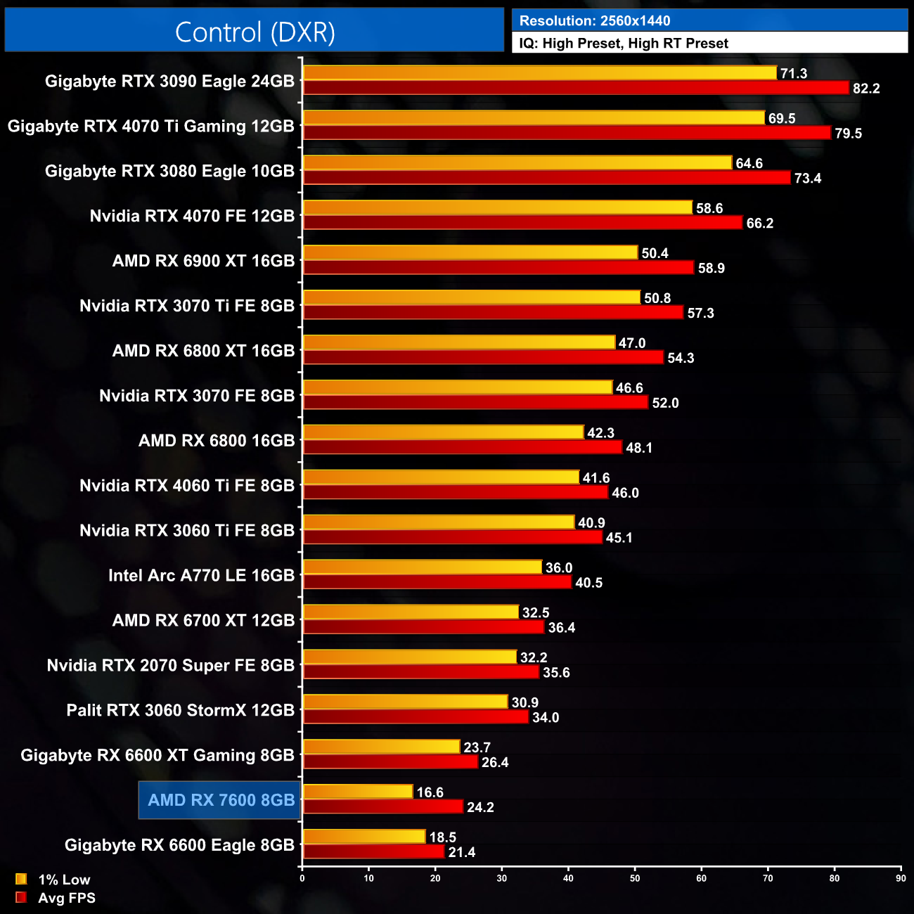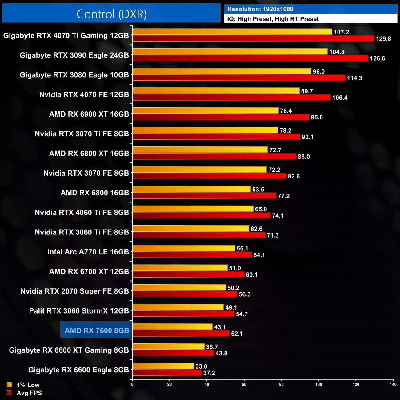 As for ray tracing performance, we're starting off in Control, focusing on the 1080p data. The RX 7600 is less impressive here, coming in a touch slower than the RTX 3060, with an average of 52FPS. It's still a hefty upgrade over the 6600, delivering frame rates that are 40% better, but Nvidia's last gen offering is still superior here.