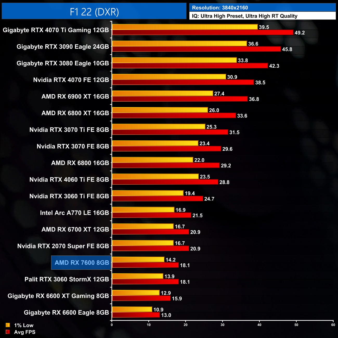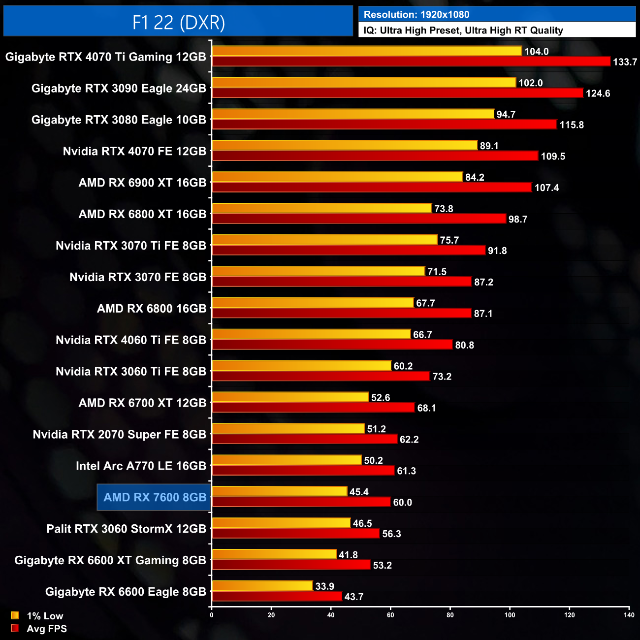 F1 22 is slightly less demanding however, with the RX 7600 capable of a 60FPS average frame rate with every ray tracing setting enabled, which is on par with the Intel A770 and a 13% improvement over the 6600 XT.