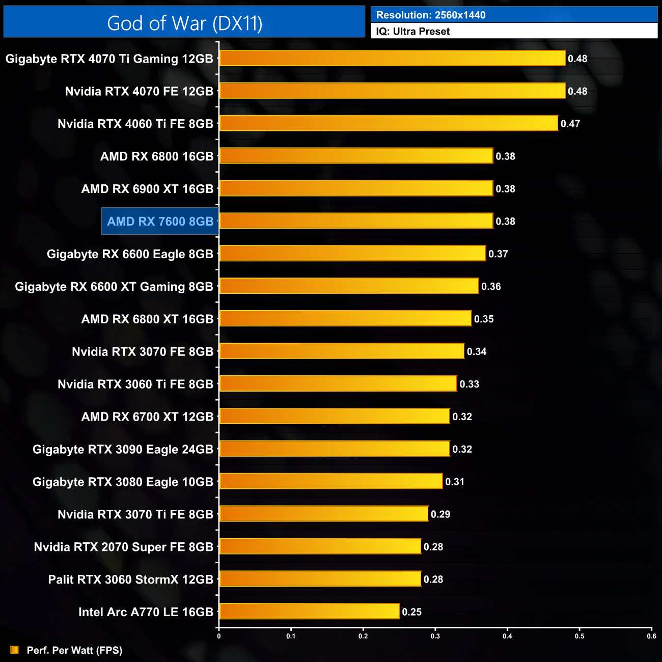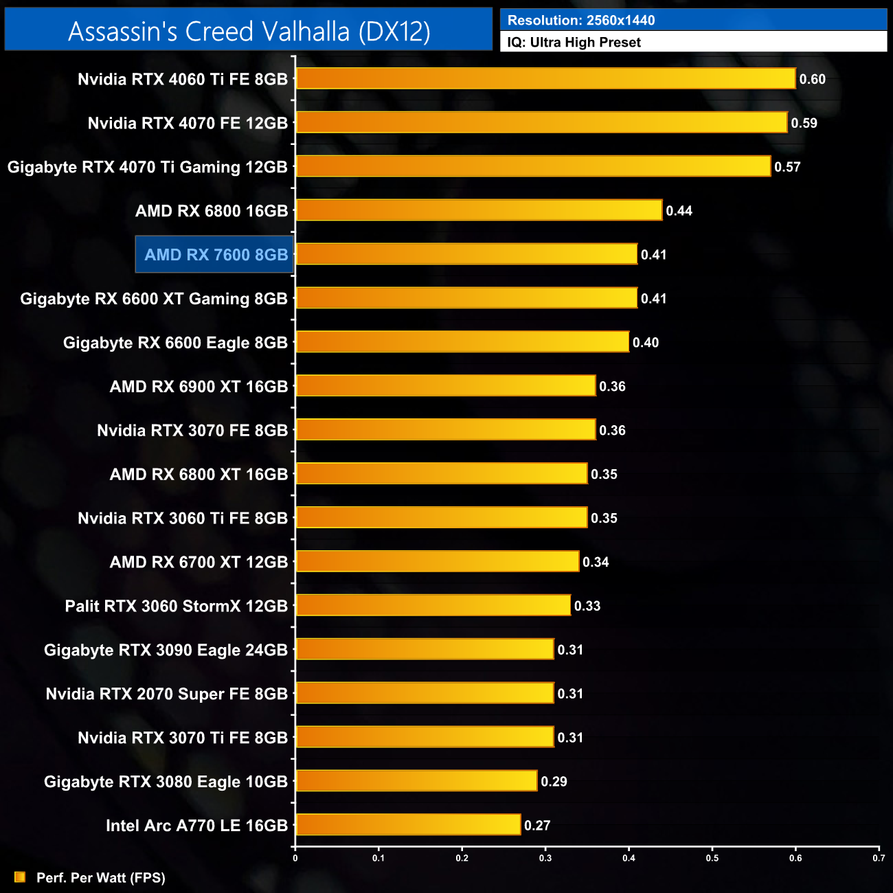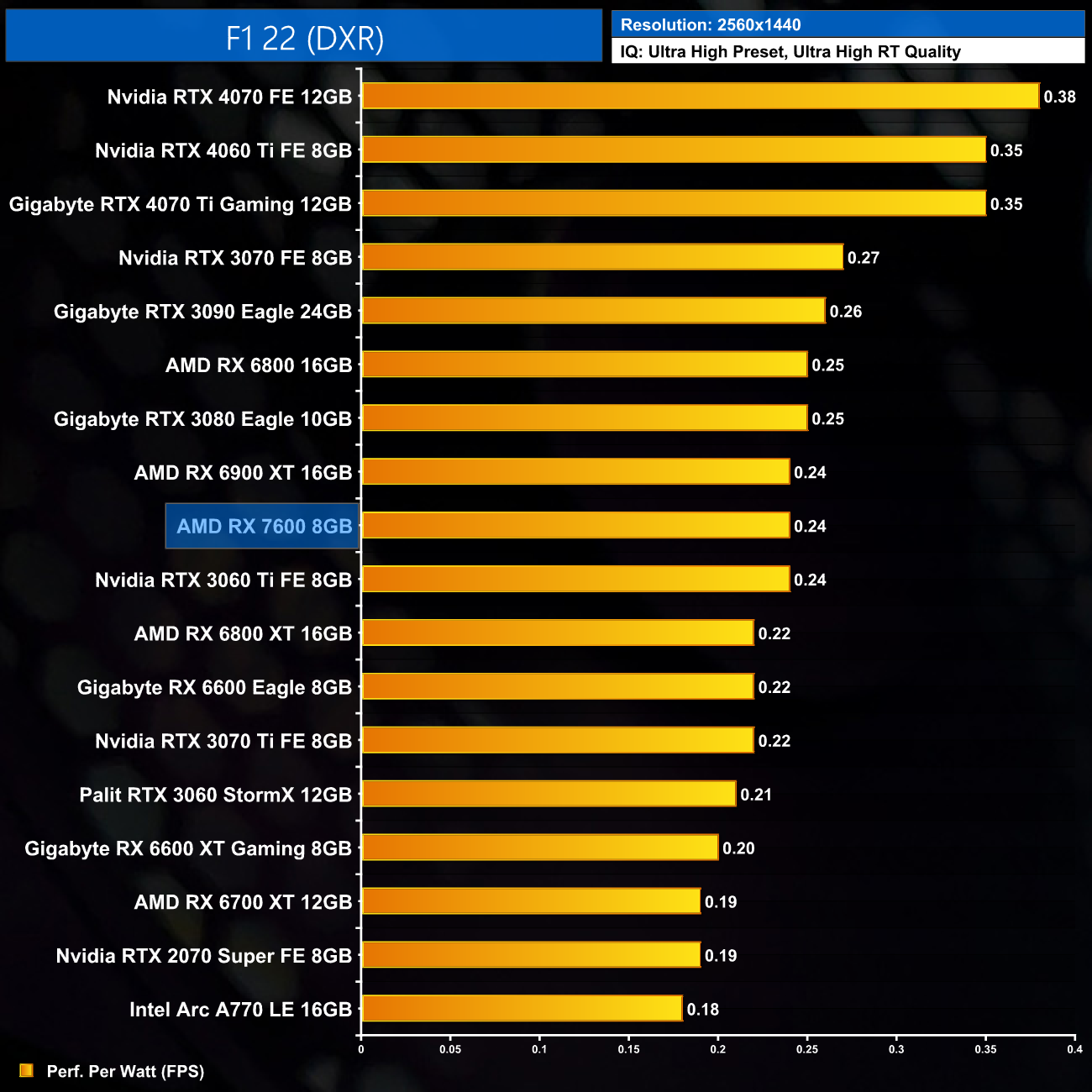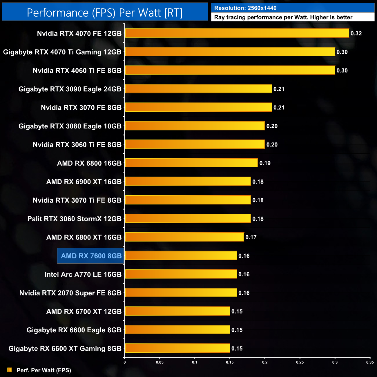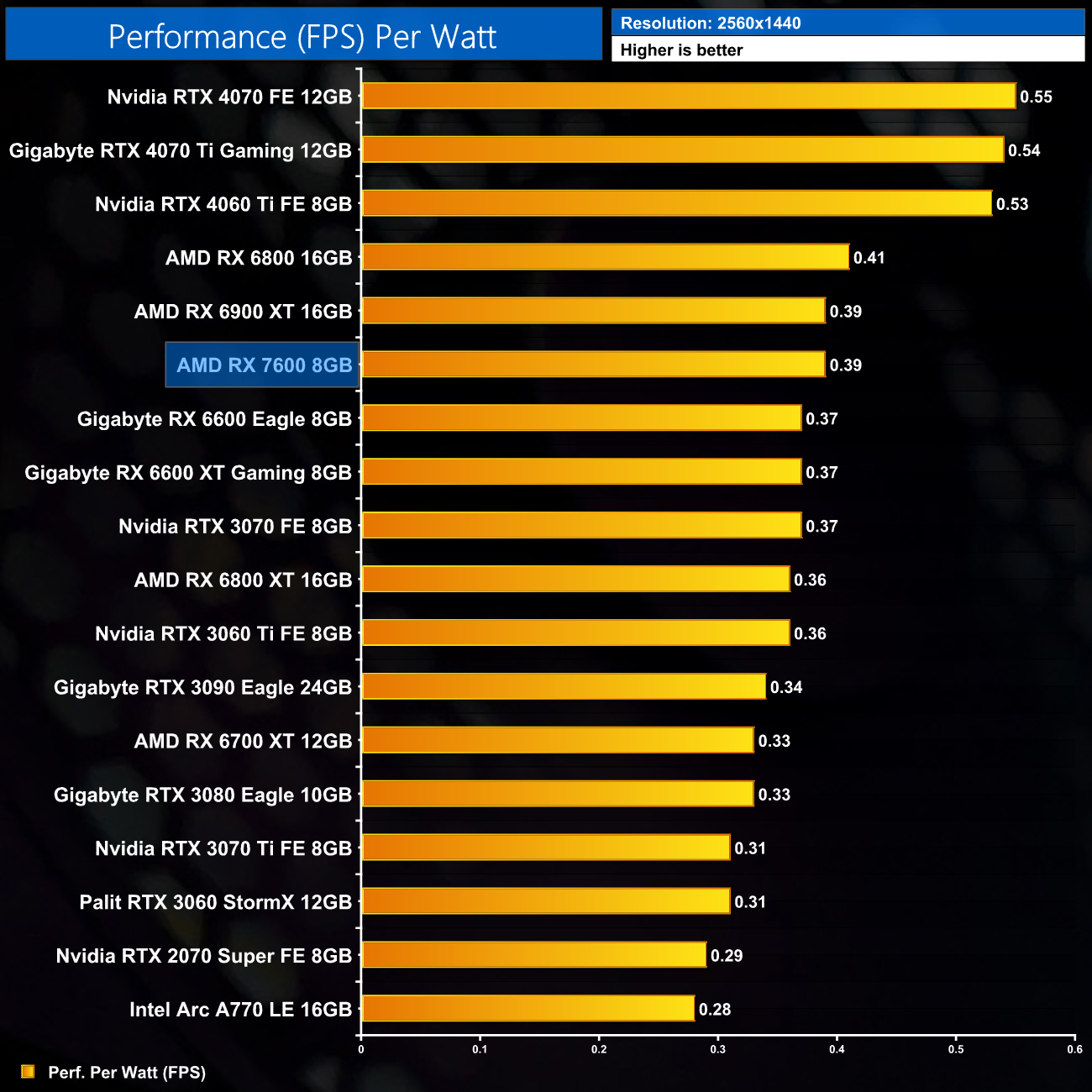 As expected, relative efficiency of the RX 7600 gets worse at 1440p, as the card's gaming performance drops off here but power draw remains constant. It's now level with the RX 6900 XT.