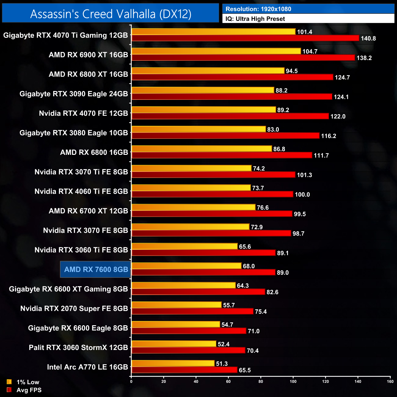 Kicking off our game benchmarks with Assassin's Creed Valhalla, at 1080p the RX 7600 delivers 89FPS on average, and that puts it dead level with the RTX 3060 Ti. It's also outperforming the RX 6600 by 25%, and is even 8% ahead of the RX 6600 XT.