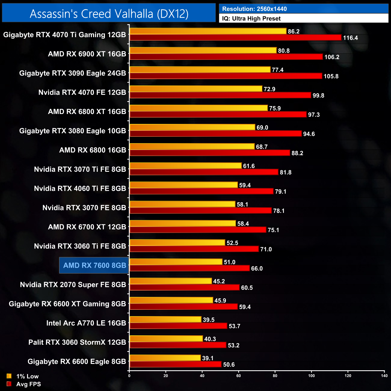 1440p is very playable too, with an average of 66FPS. The 7600 has fallen behind the RTX 3060 Ti here, likely due to memory bandwidth constraints, but it's still a good 11% faster than the RX 6600 XT.