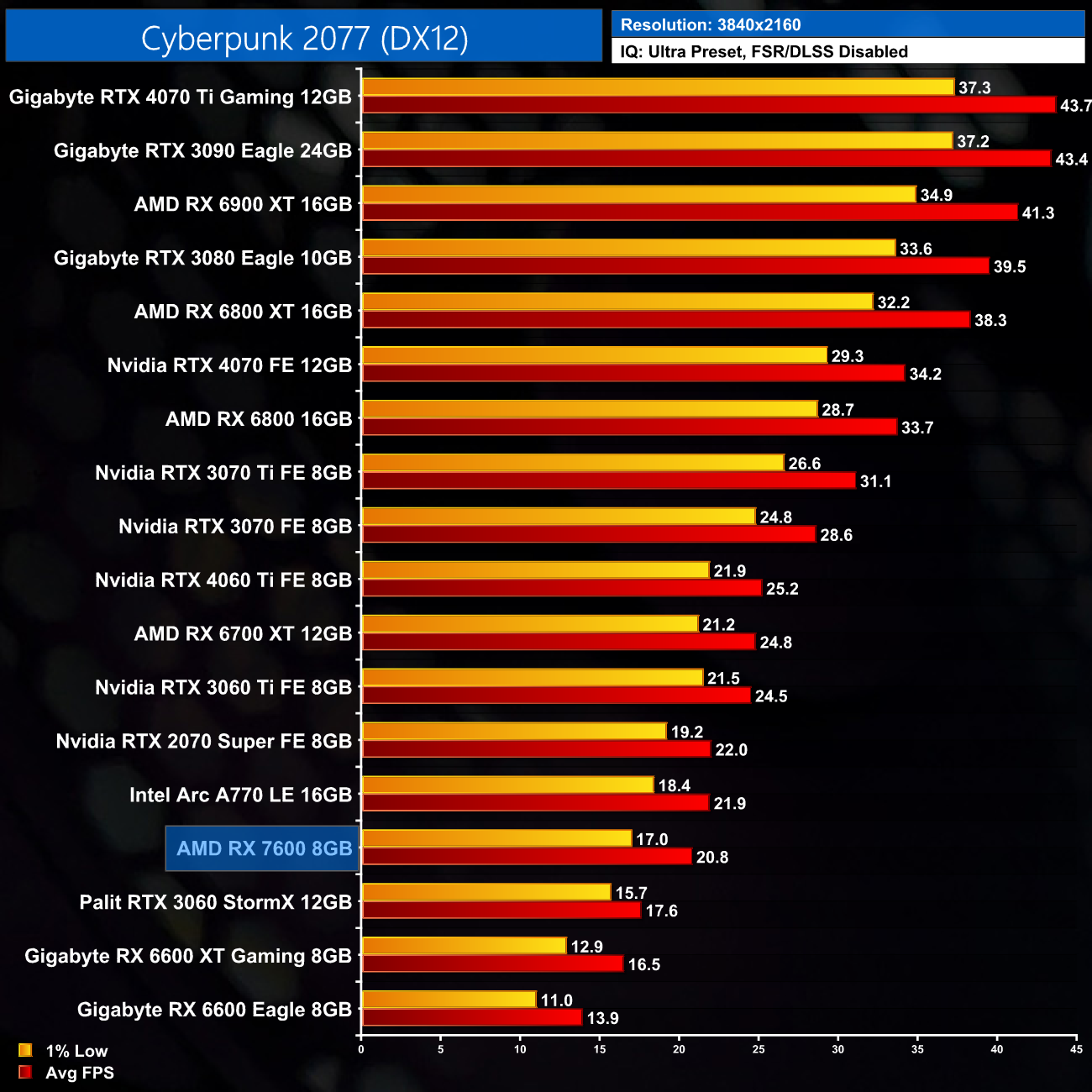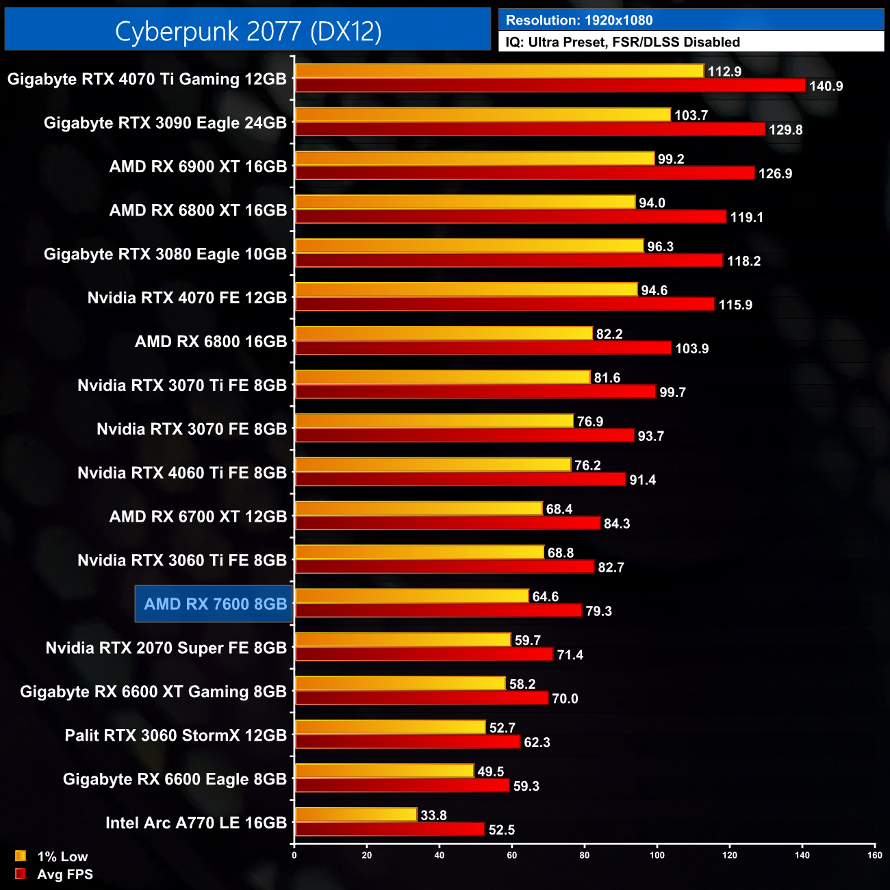 Performance in Cyberpunk 2077 also exceeded my expectations, with a 79FPS average at 1080p Ultra settings. Again that's just 4% below the 3060 Ti, while outstripping the 6600 XT by a 13% margin.