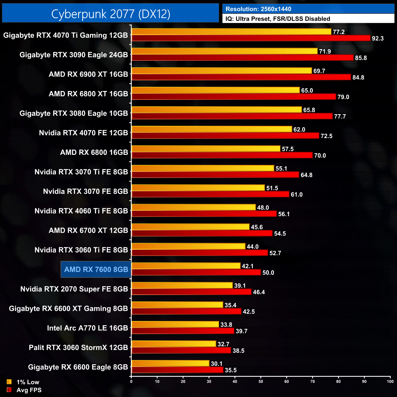 1440p is still relatively playable too, with an average of 50FPS exactly, which translates to a pretty decent 41% lead over the RX 6600, and an 18% uplift versus the 6600 XT.