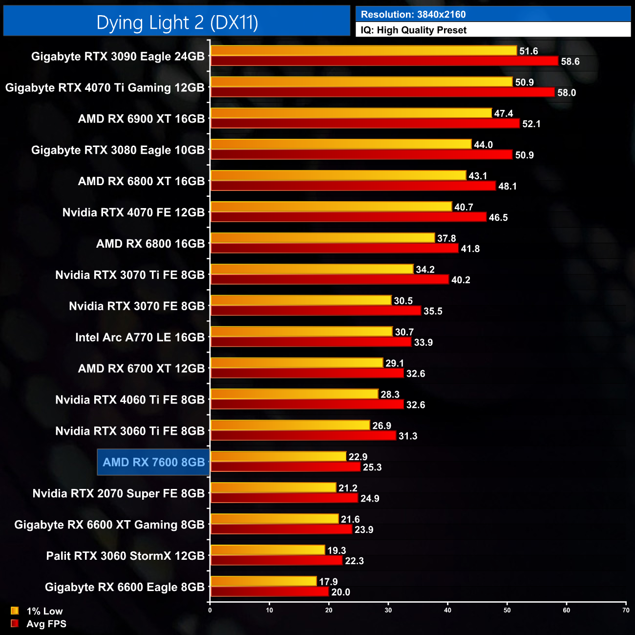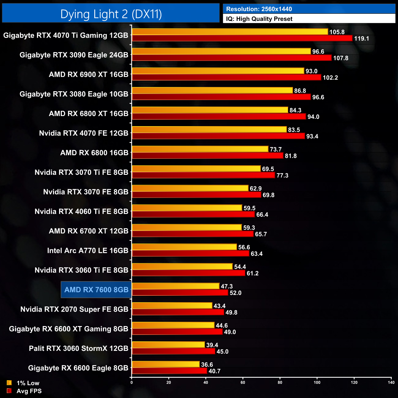 The RX 7600 delivers more solid results in Dying Light 2, where at 1080p its average of 79FPS translates to a 7% lead over the RX 6600 XT, and it's 20% faster than the RTX 3060.