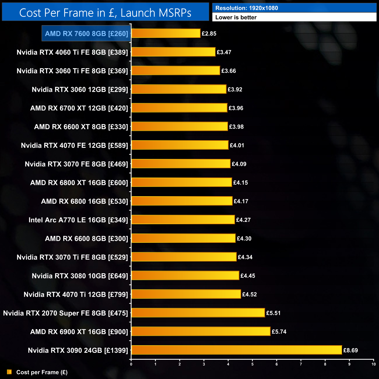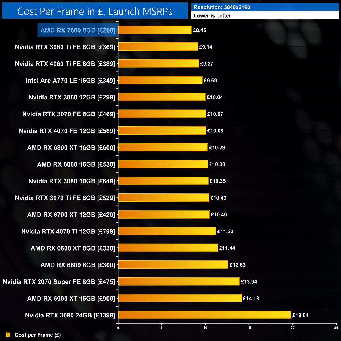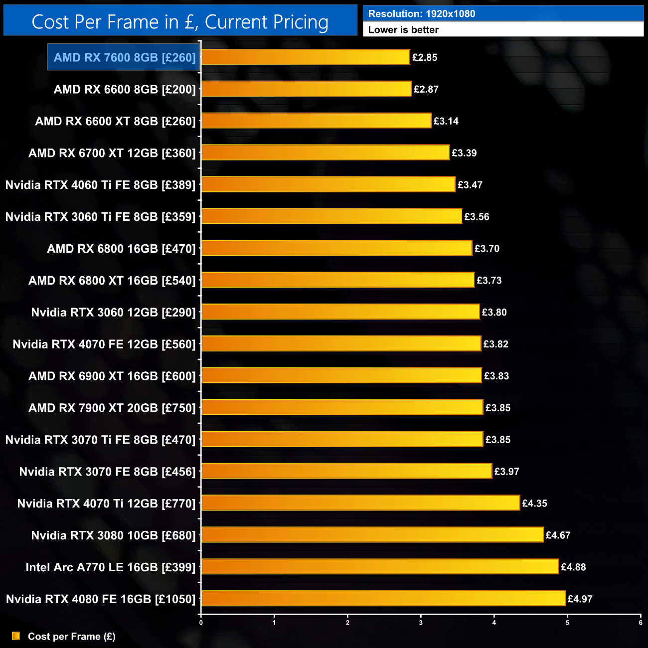 Based on the £259 MSRP, the RX 7600 is the best value GPU we've tested. It offers an 18% reduction in cost per frame against its closest challenger, the RTX 4060 Ti, while it's 28% better value than the RX 6600 XT and 34% better than the RX 6600.