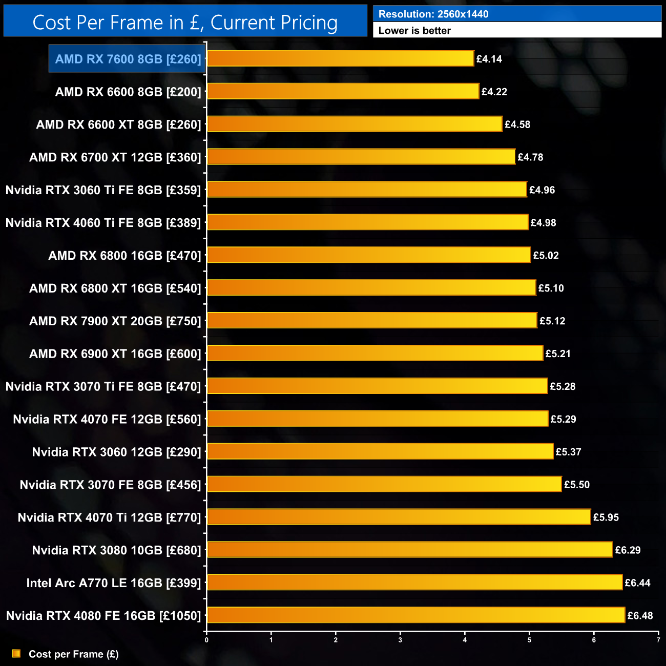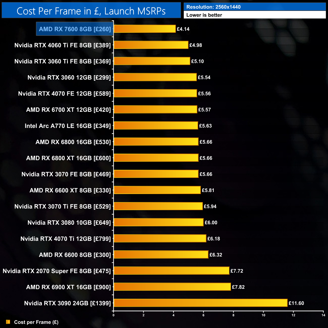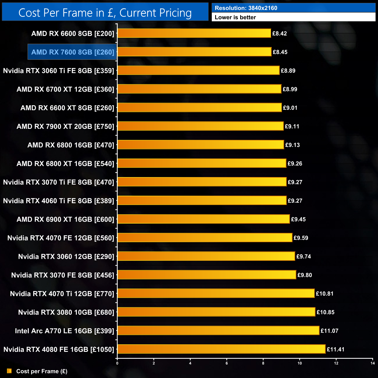 Based on the £259 MSRP, the RX 7600 is the best value GPU we've tested. It offers an 18% reduction in cost per frame against its closest challenger, the RTX 4060 Ti, while it's 28% better value than the RX 6600 XT and 34% better than the RX 6600.