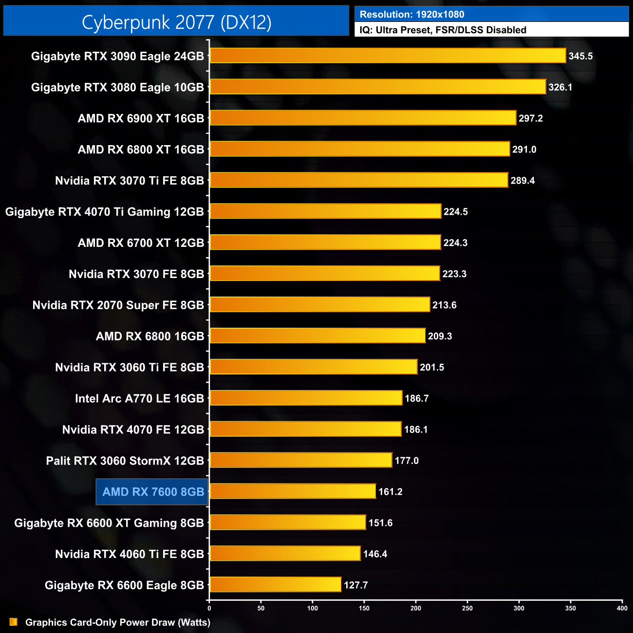 Ray tracing power has dropped back by 10W however, thanks to Cyberpunk which ground to an absolute halt with ray tracing enabled at 1440p – reducing power draw.