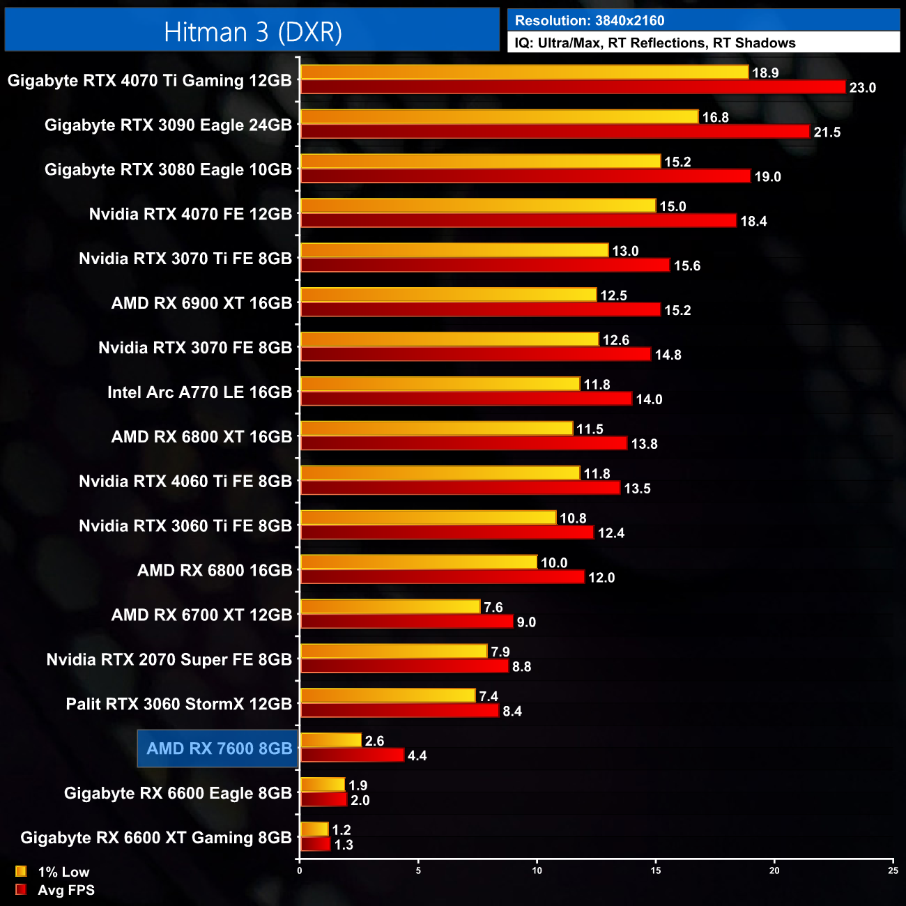 Hitman 3 is another example of a game that's just too heavy for the RX 7600 using maximum ray tracing settings. It falters to just 25FPS on average, so you'd definitely want to reduce some settings or enable FSR here.