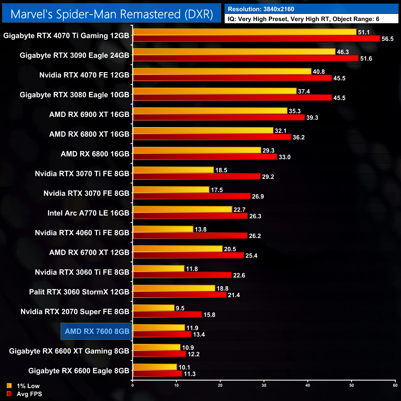 Spider-Man Remastered is usually pretty amenable to AMD GPUs when enabling ray tracing, but the RX 7600 still struggles and is comprehensively out-muscled by the last-gen RTX 3060, with noticeably choppier 1% lows than that Nvidia GPU.