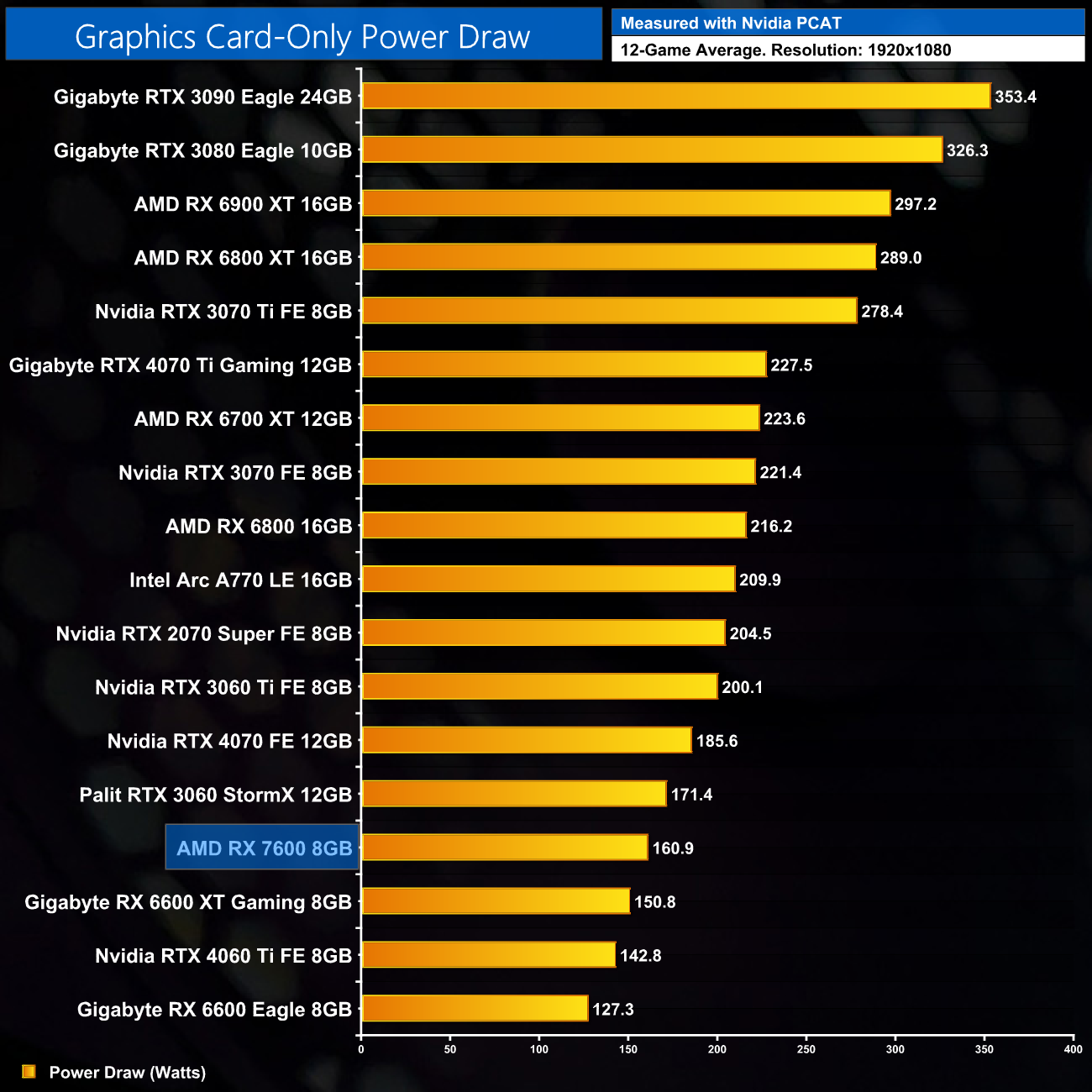 Total system power draw is similar to the RTX 4060 Ti at all resolutions, we see a peak reading of 352W at 1080p for the RX 7600. AMD officially recommends a 550W PSU, which does seem on the high side considering most users will likely pair this GPU with a mid-range CPU, and not a gas-guzzling i9-13900KS like we have here.
