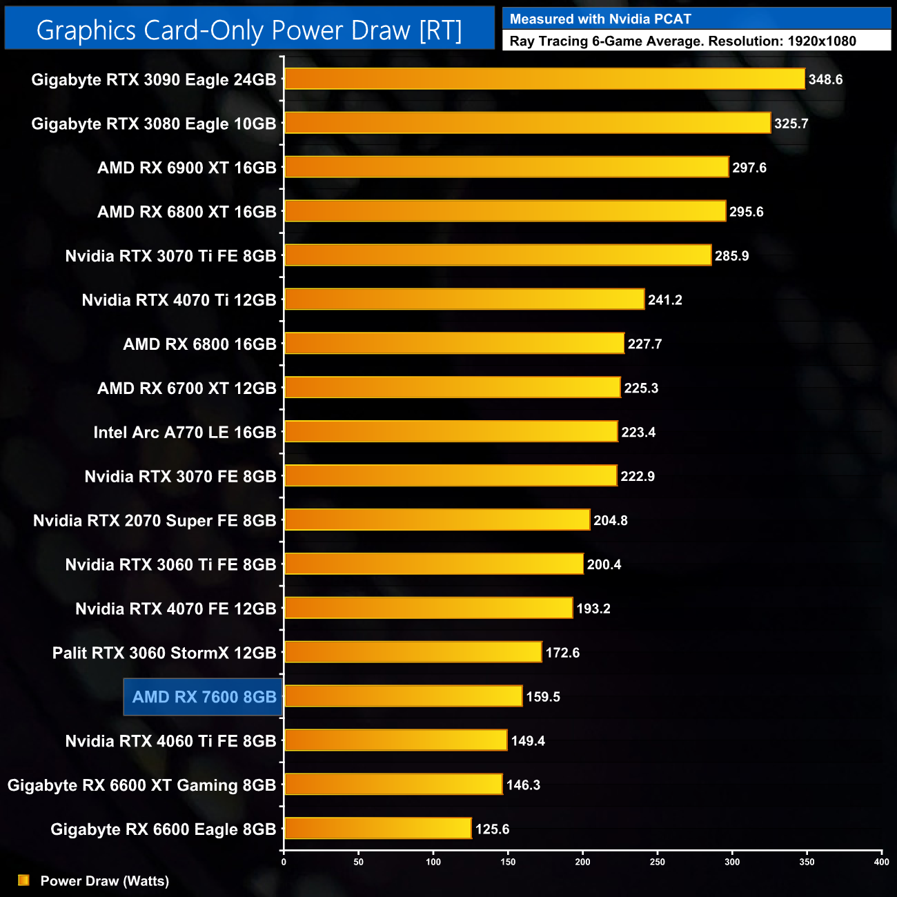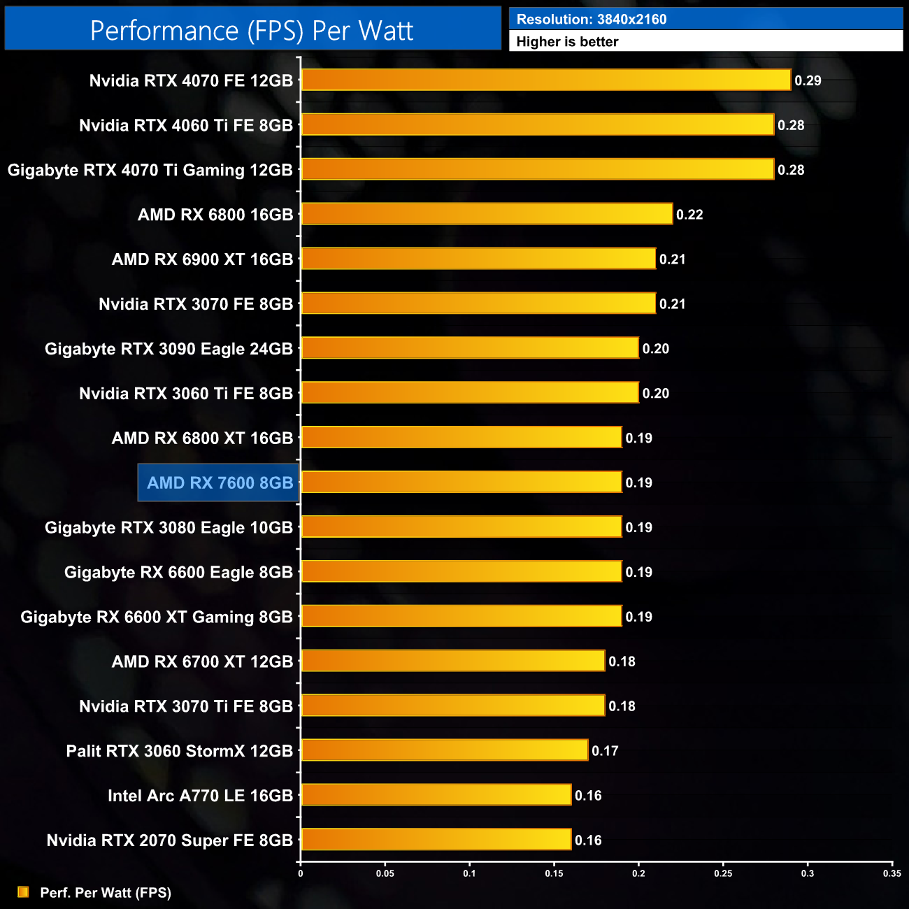 That's only exacerbated when looking at ray tracing efficiency where AMD is comparatively slower than Nvidia – the RX 7600 is now over 40% less efficient than the RTX 4060 Ti.