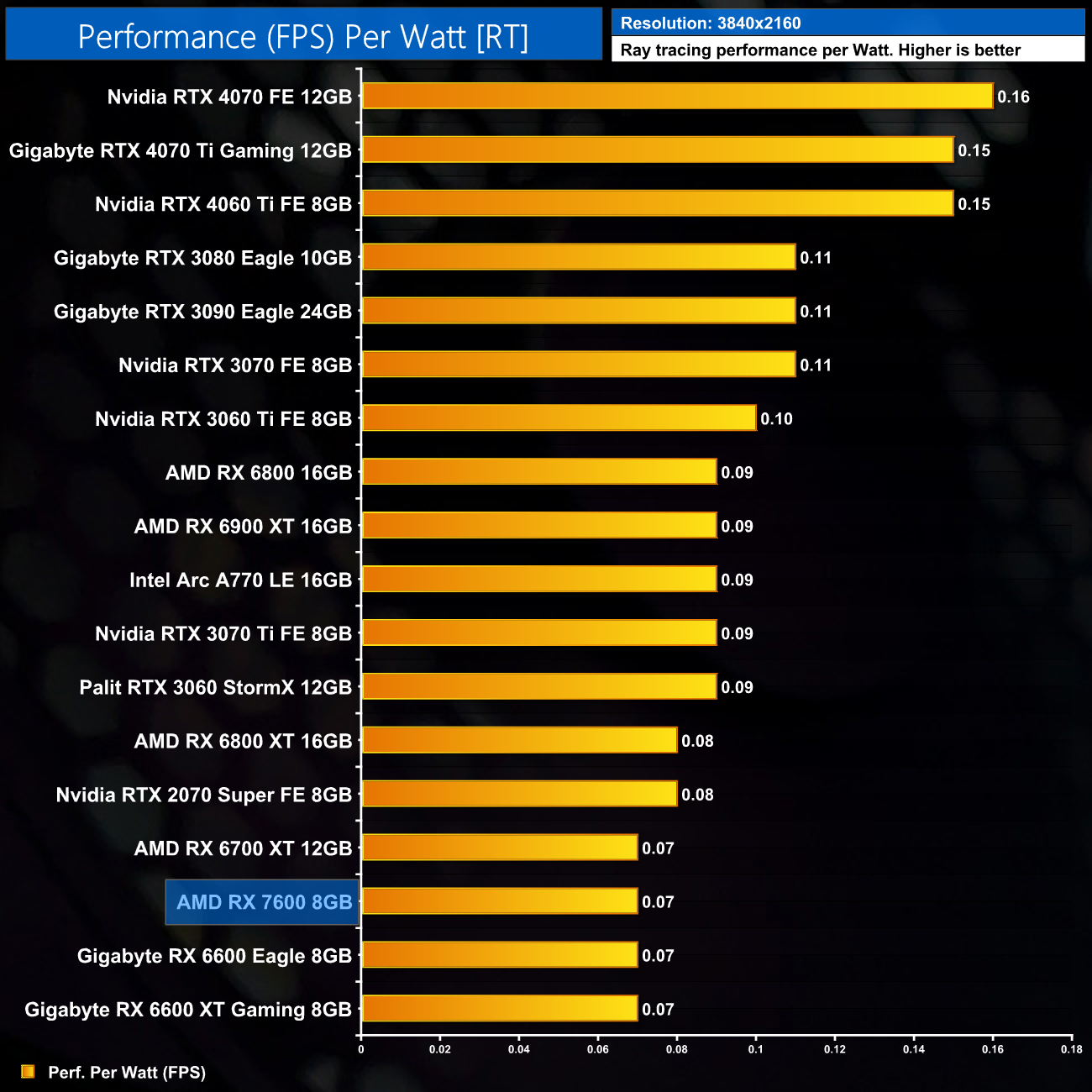 The same applies for the ray tracing efficiency, with the 7600 rooted to the bottom of the chart, alongside three other AMD RDNA 2 parts.