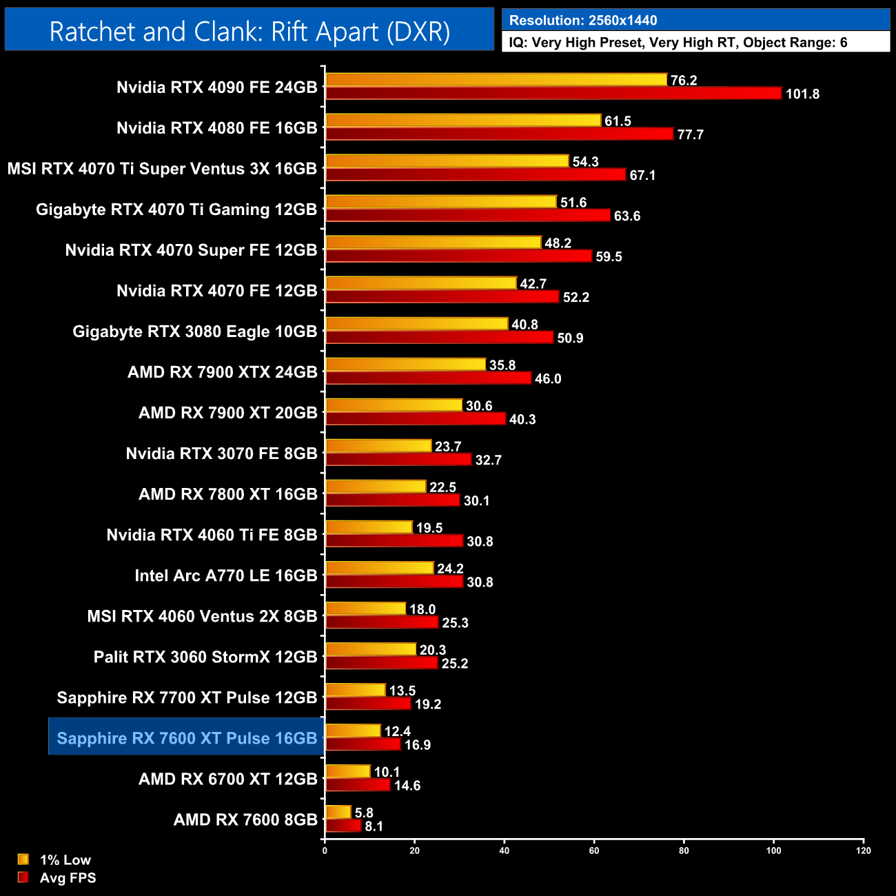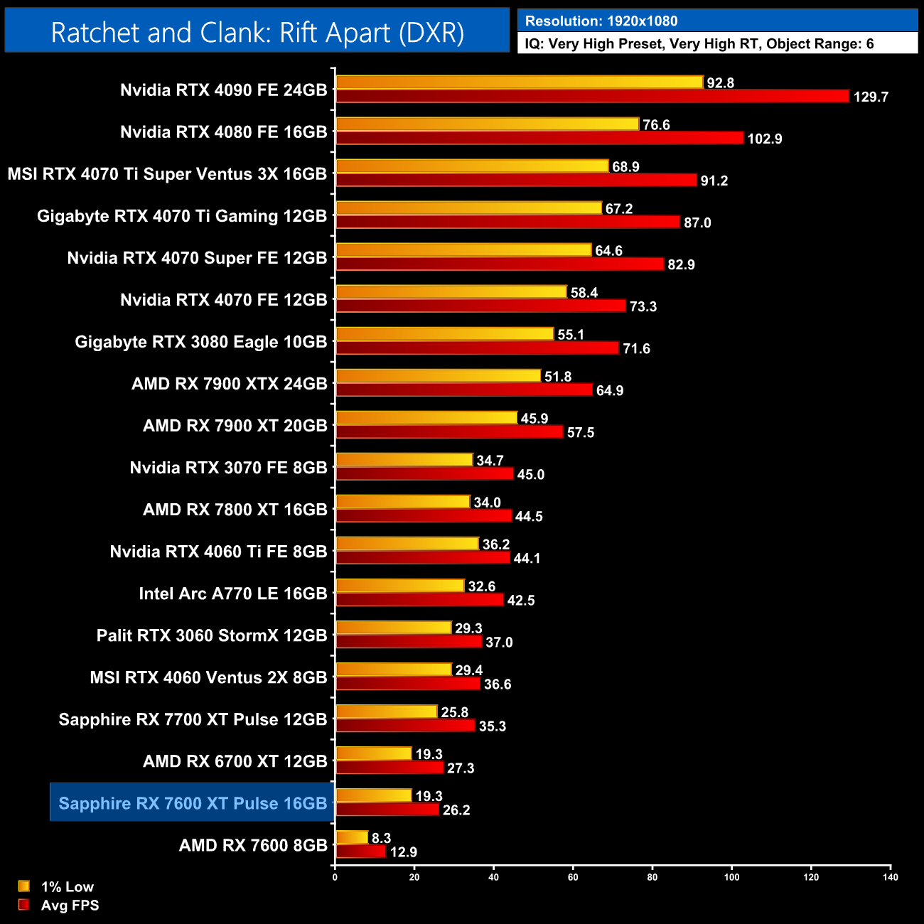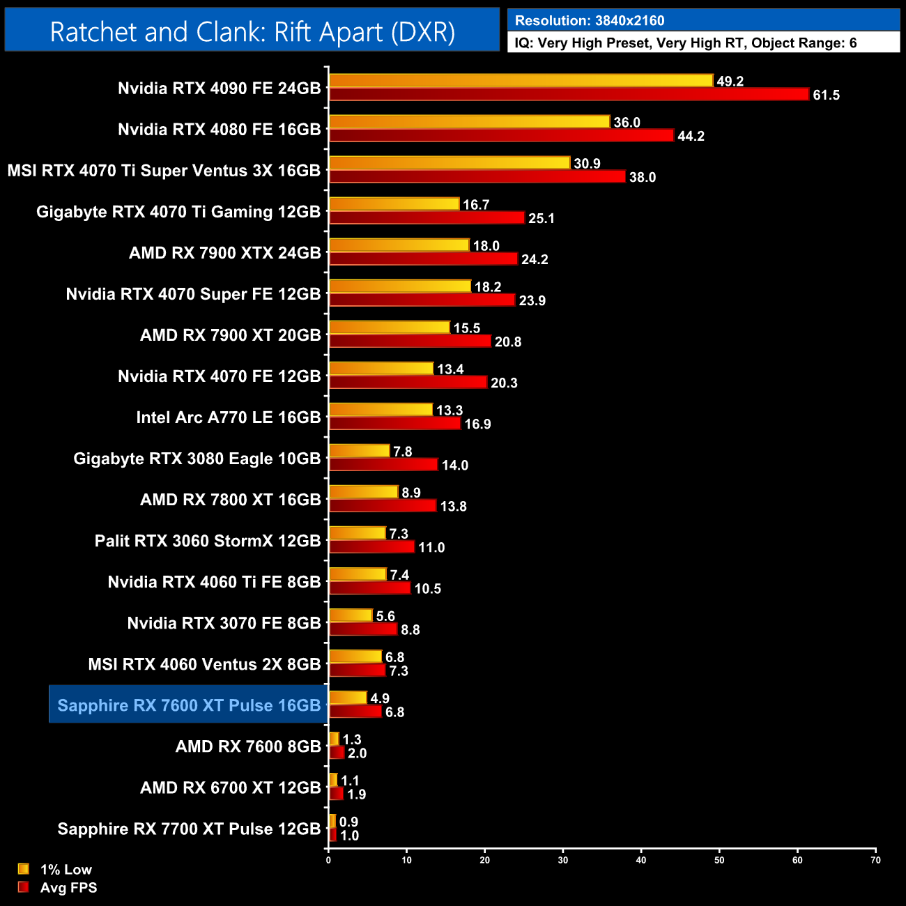 The ray tracing data in Ratchet and Clank only confirms what we already knew, as the extra 8GB of VRAM really helps compared to the RX 7600. Granted, the 7600 XT is still well below 30FPS, while it's 28% slower than the RTX 4060.