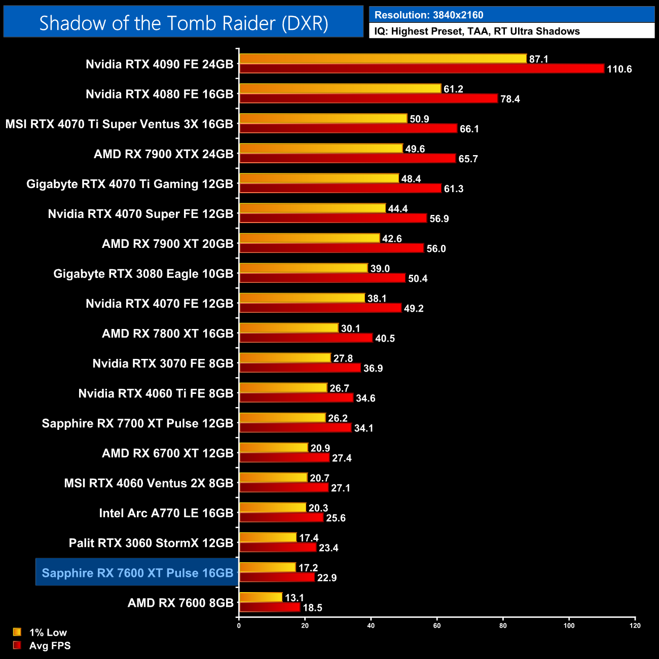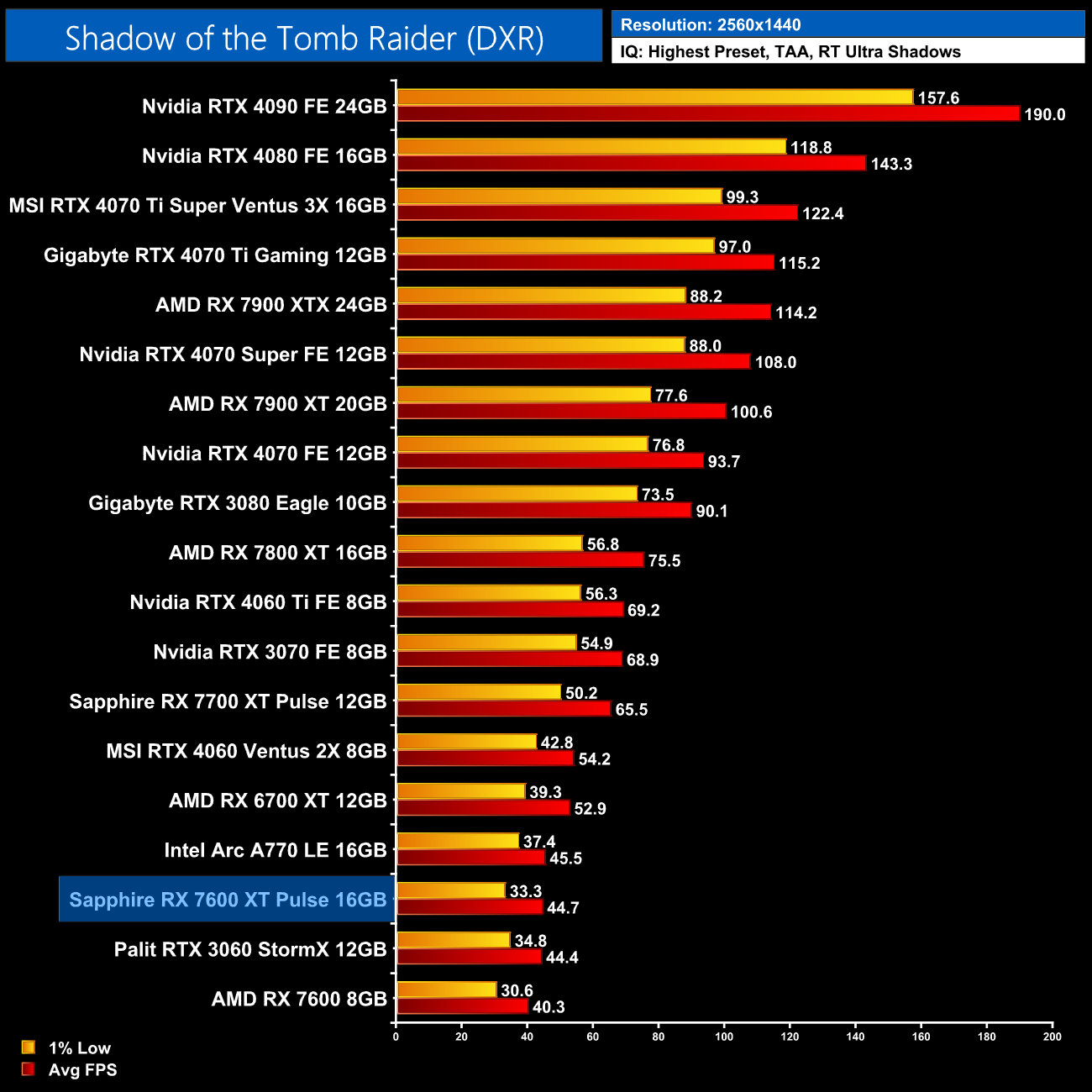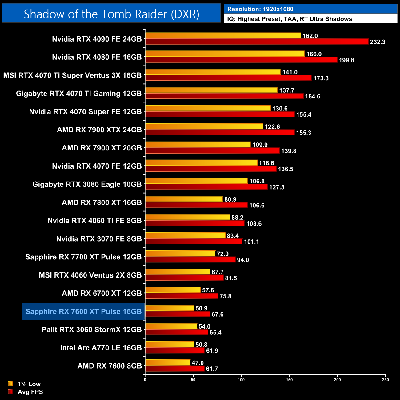 Finally, we finish up with Shadow of the Tomb Raider. I deliberately include this game as it's a bit older and only features a single RT effect – being ray traced shadows – so performance is better than what we see from most other RT games. Even then, AMD just can't match Nvidia for ray traced performance, with the 7600 XT still 17% slower than the 4060 at 1080p.