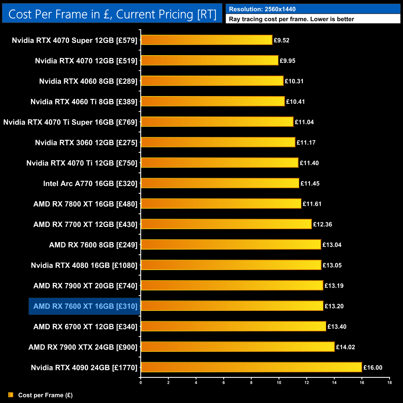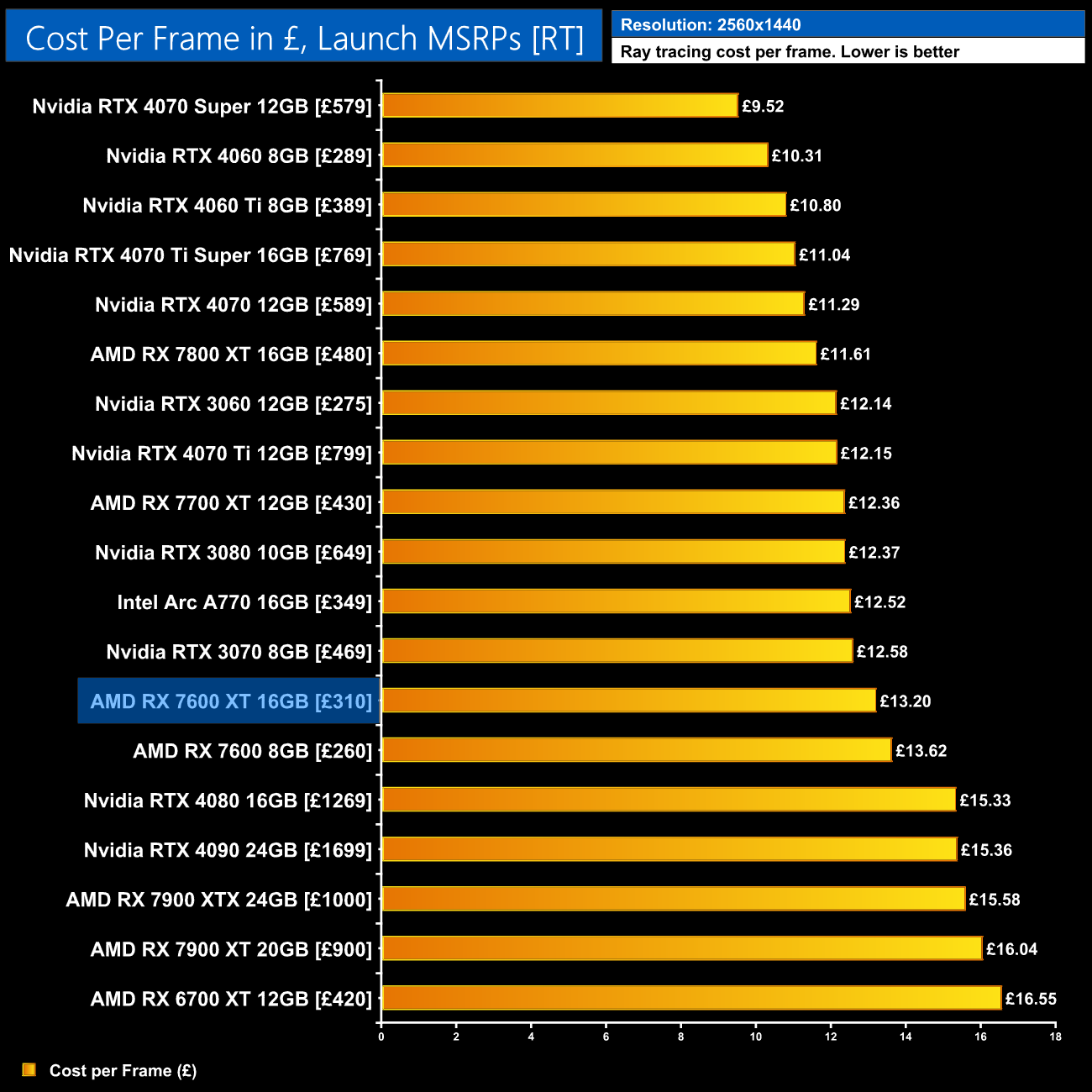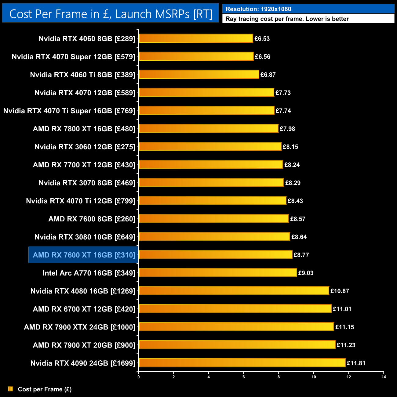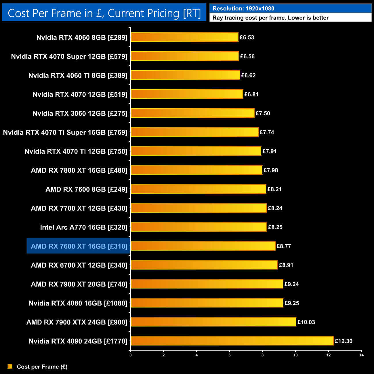 Naturally, the poor ray tracing performance means ray traced cost per frame does not look great for the RX 7600 XT – it's on par with the RTX 3080 from 2023, and doesn't come close to the RTX 4060, being 34% more expensive per frame at 1080p.