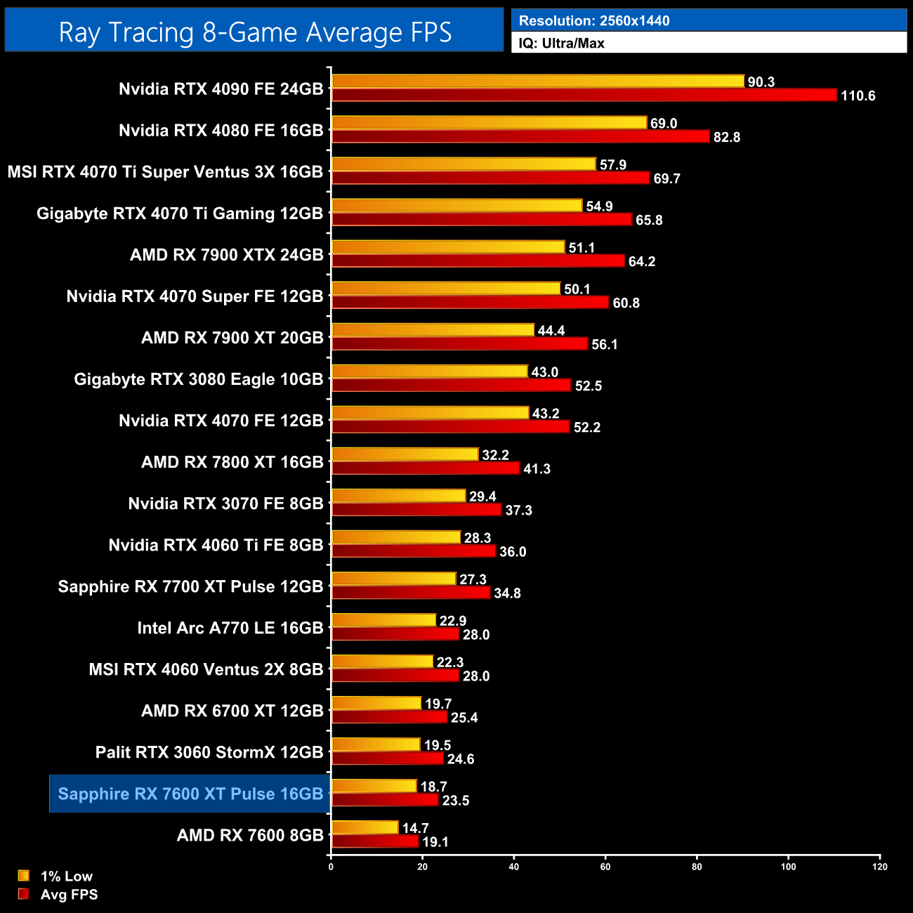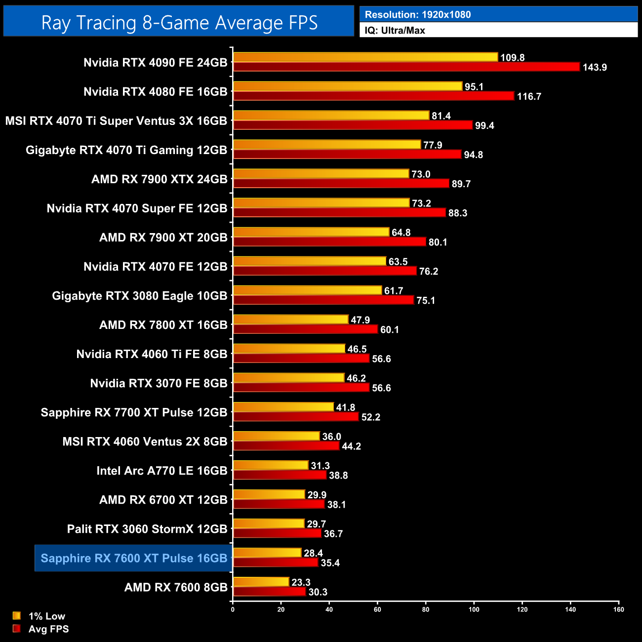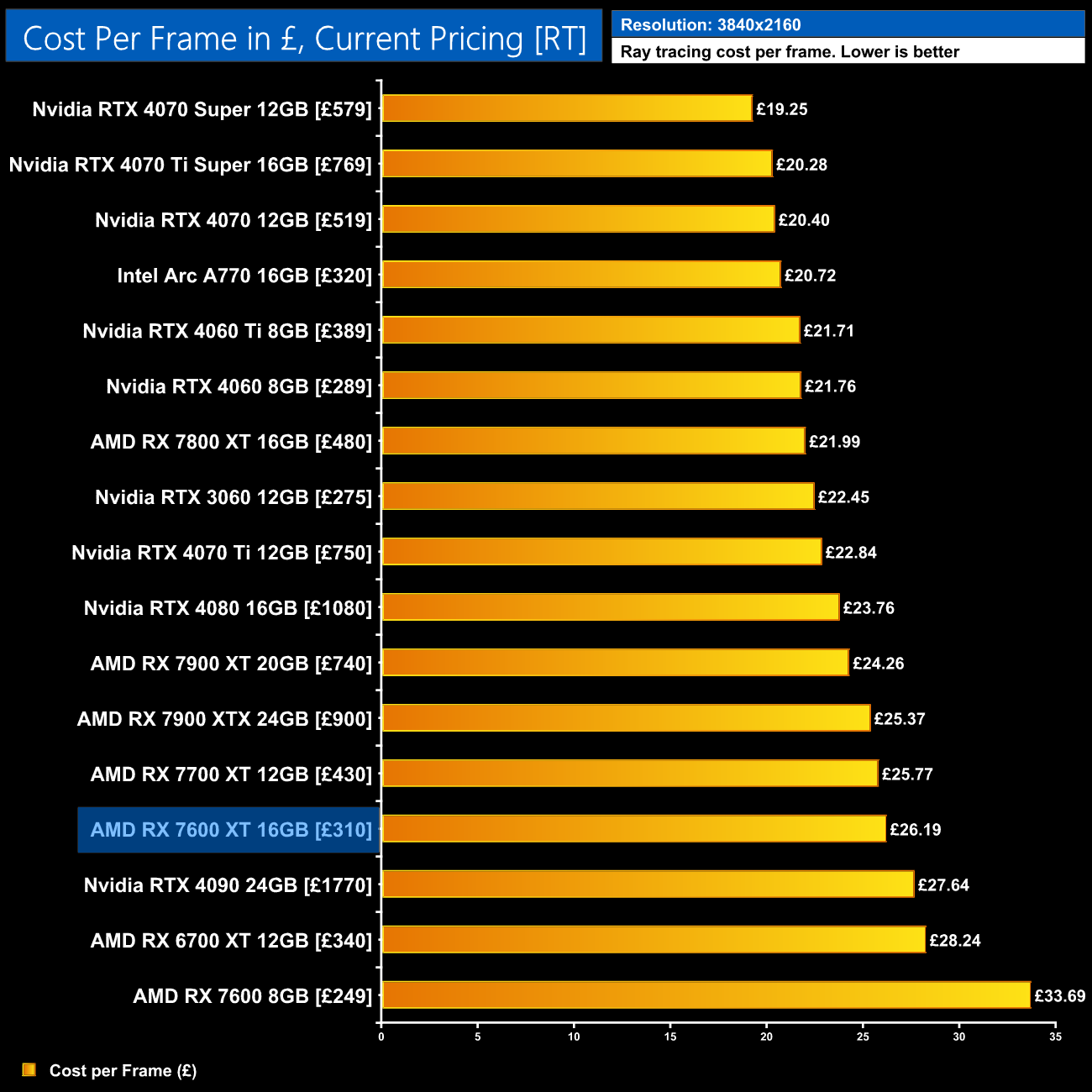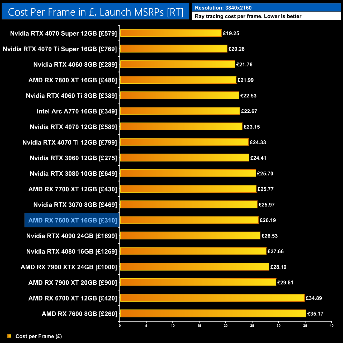 Naturally, the poor ray tracing performance means ray traced cost per frame does not look great for the RX 7600 XT – it's on par with the RTX 3080 from 2023, and doesn't come close to the RTX 4060, being 34% more expensive per frame at 1080p.